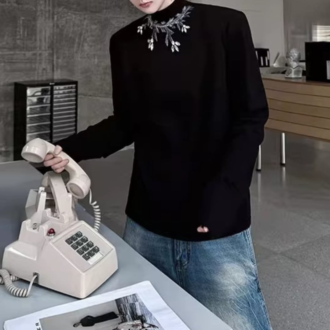 手描きビーズデザインハイカラー長袖Tシャツ 2カラー D11869