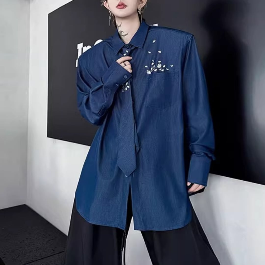 ネクタイビーズ装飾デニムシャツ 2カラー D11878