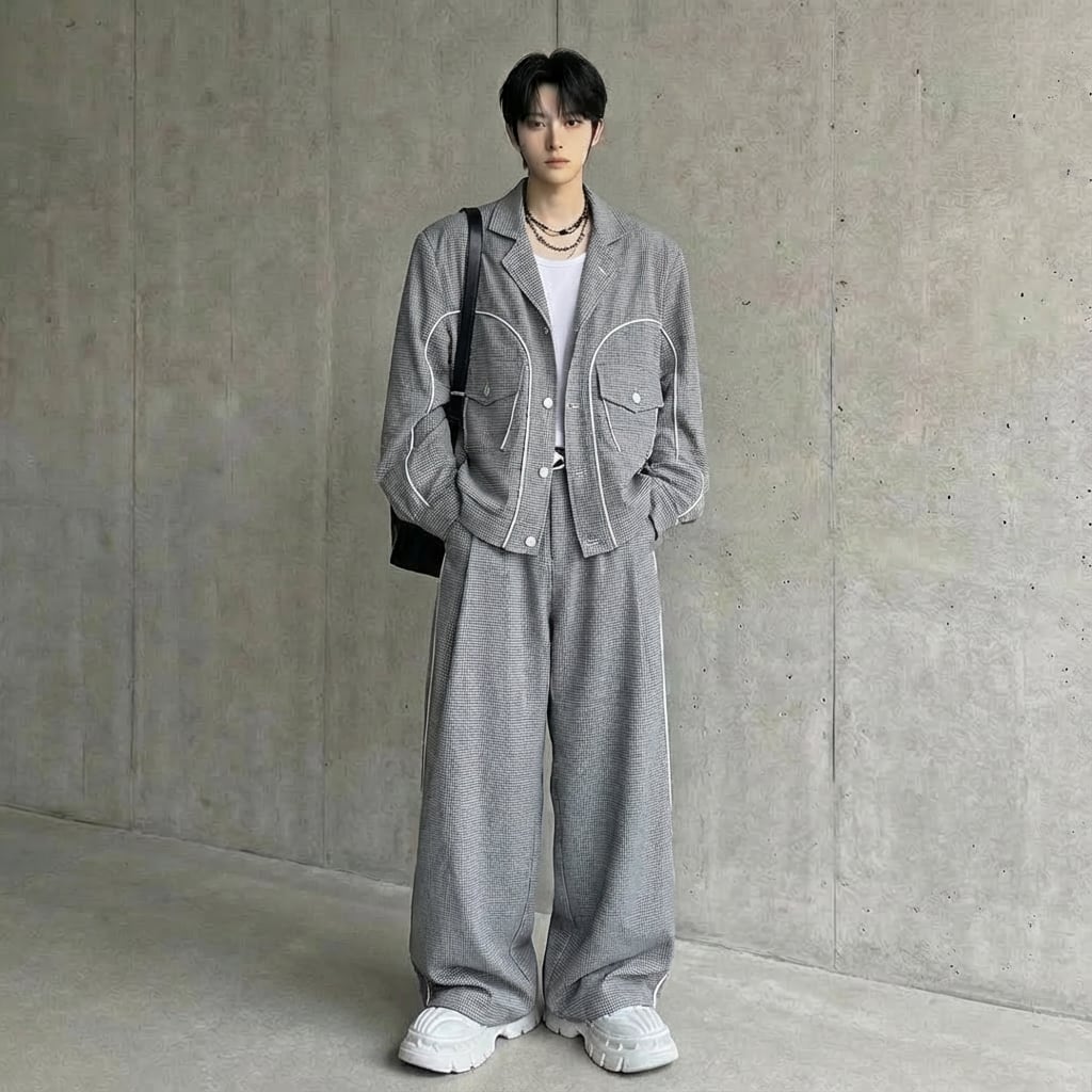 千鳥格子ジャケット&カジュアルワイドレッグパンツツーピース D11886