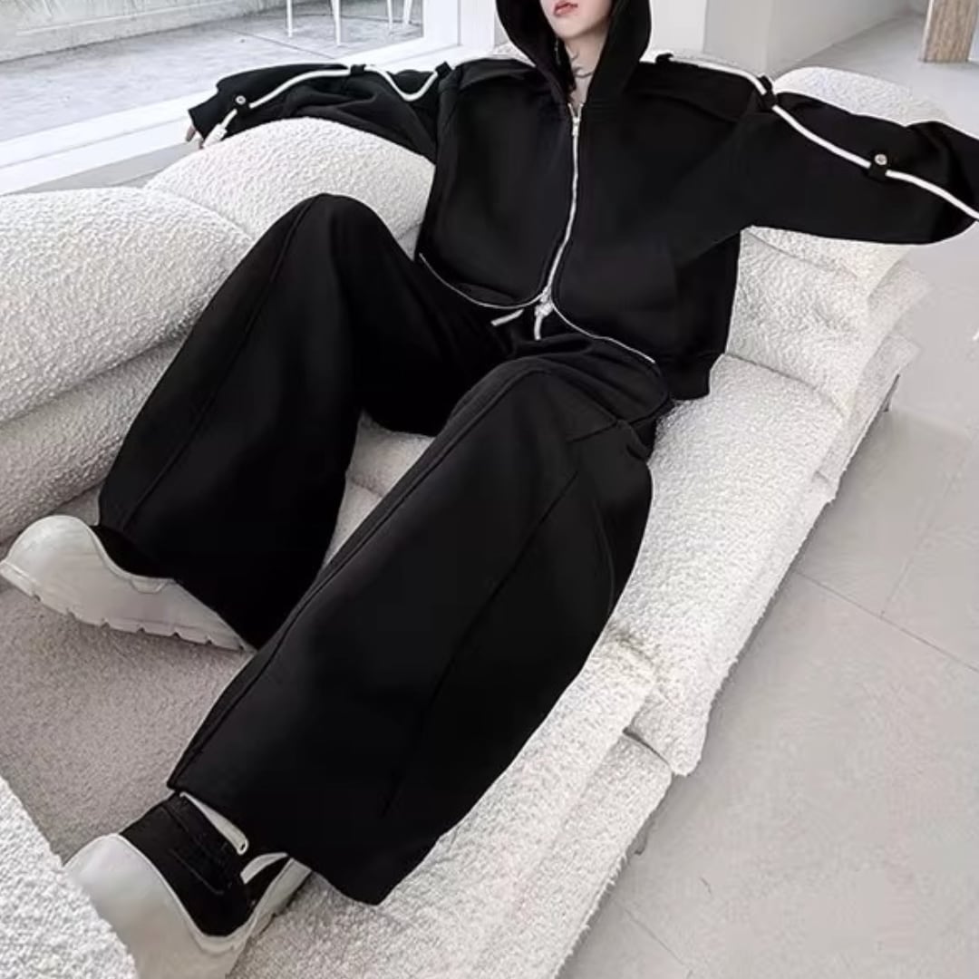 プリーツドローストリングパーカー&ワイドレッグパンツツーピース 2カラー D11887