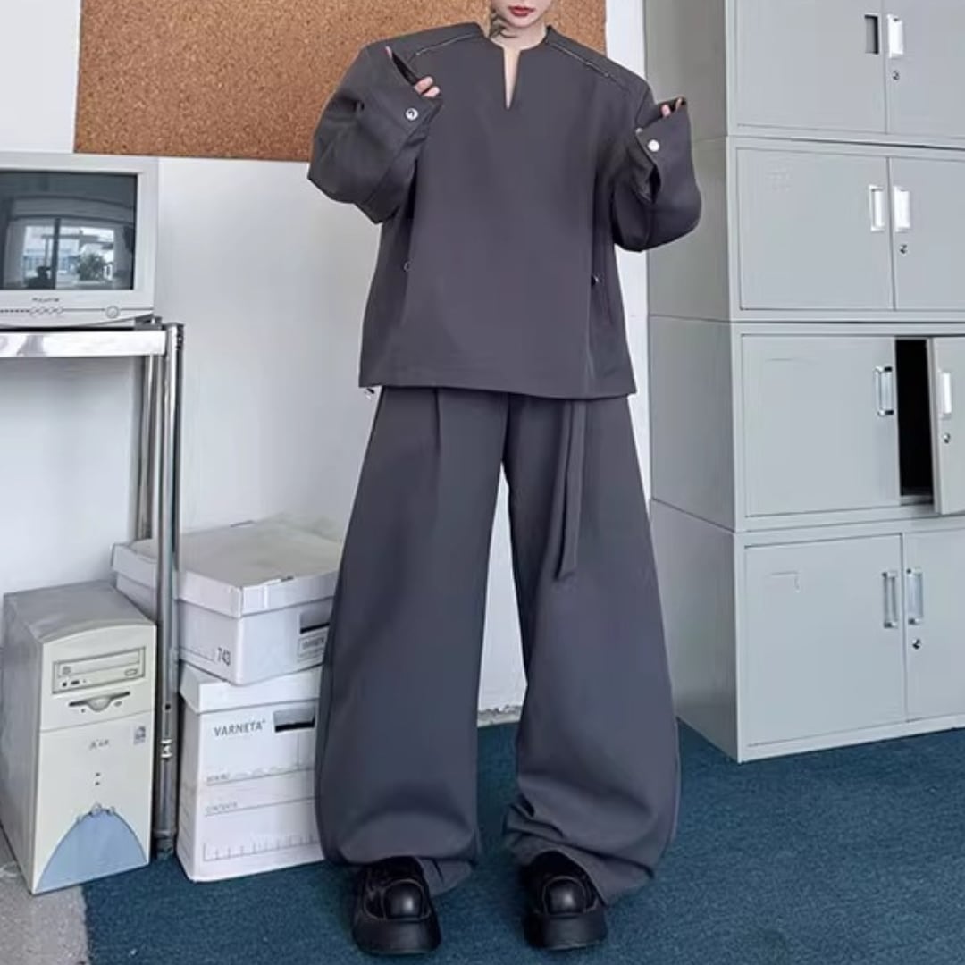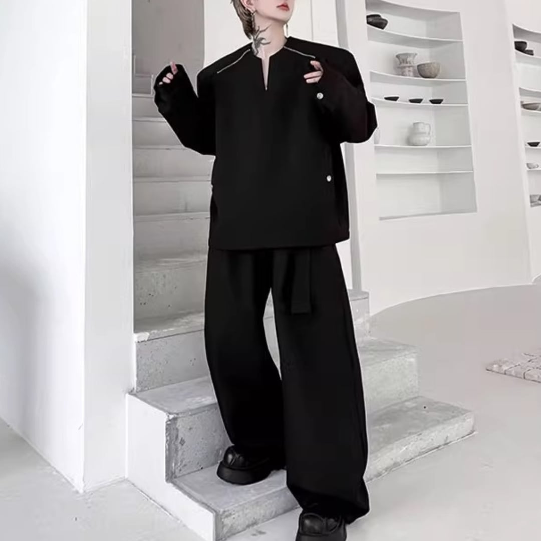 ジッパー装飾Vネックプルオーバー&ワイドレッグパンツセットアップ 2カラー D11894