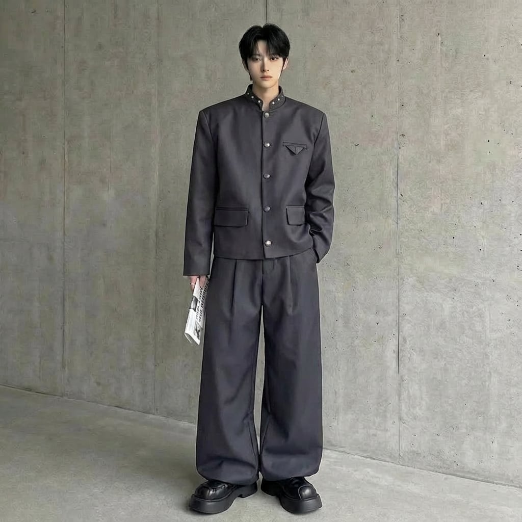 スタンドカラーリベット装飾スーツジャケット&ワイドレッグパンツセットアップ 2カラー D11910