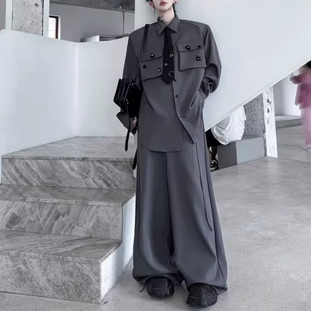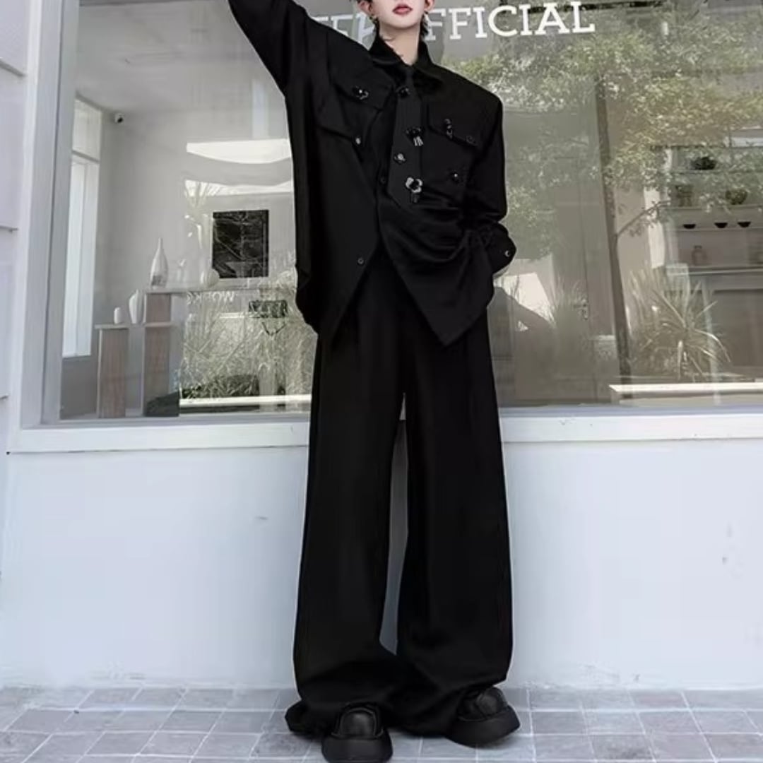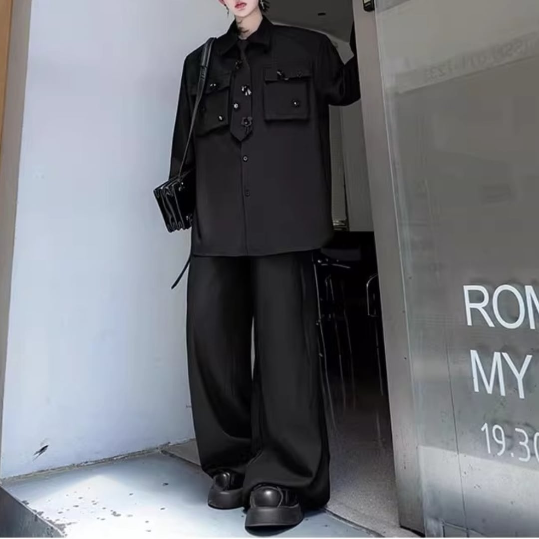 花装飾ネクタイ長袖シャツ&ワイドレッグパンツセットアップ 2カラー D11916