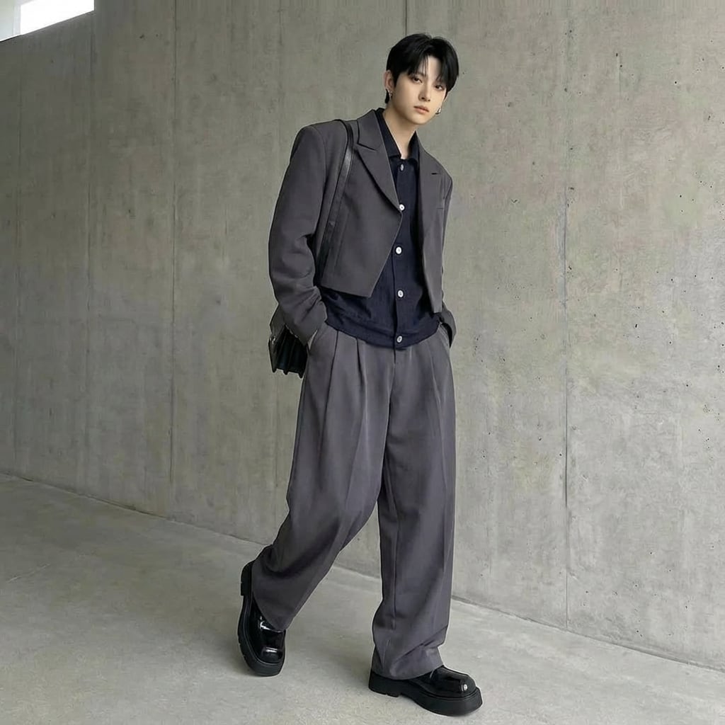 フェイクツーピースショートジャケット&ワイドレッグパンツセットアップ 2カラー D11917
