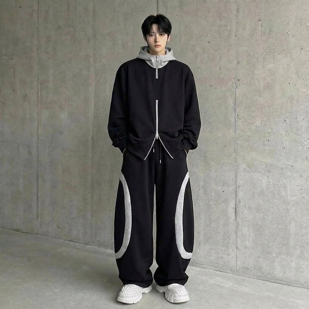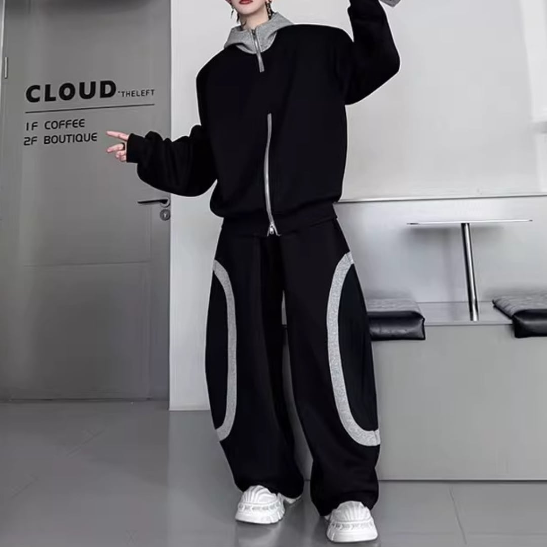コントラストカラーステッチジッパーパーカー&ワイドレッグパンツセットアップ 2カラー D11930
