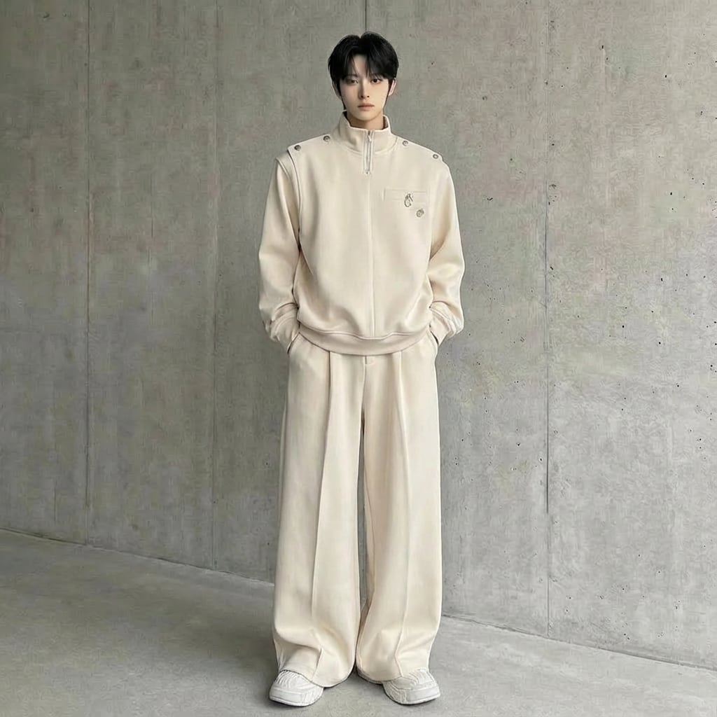 メタルボタン装飾スタンドカラースウェット&ワイドレッグスウェットパンツセットアップ 2カラー D11933