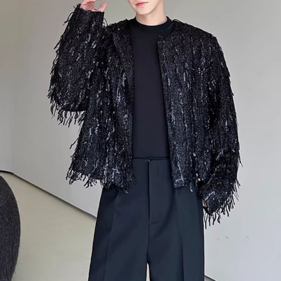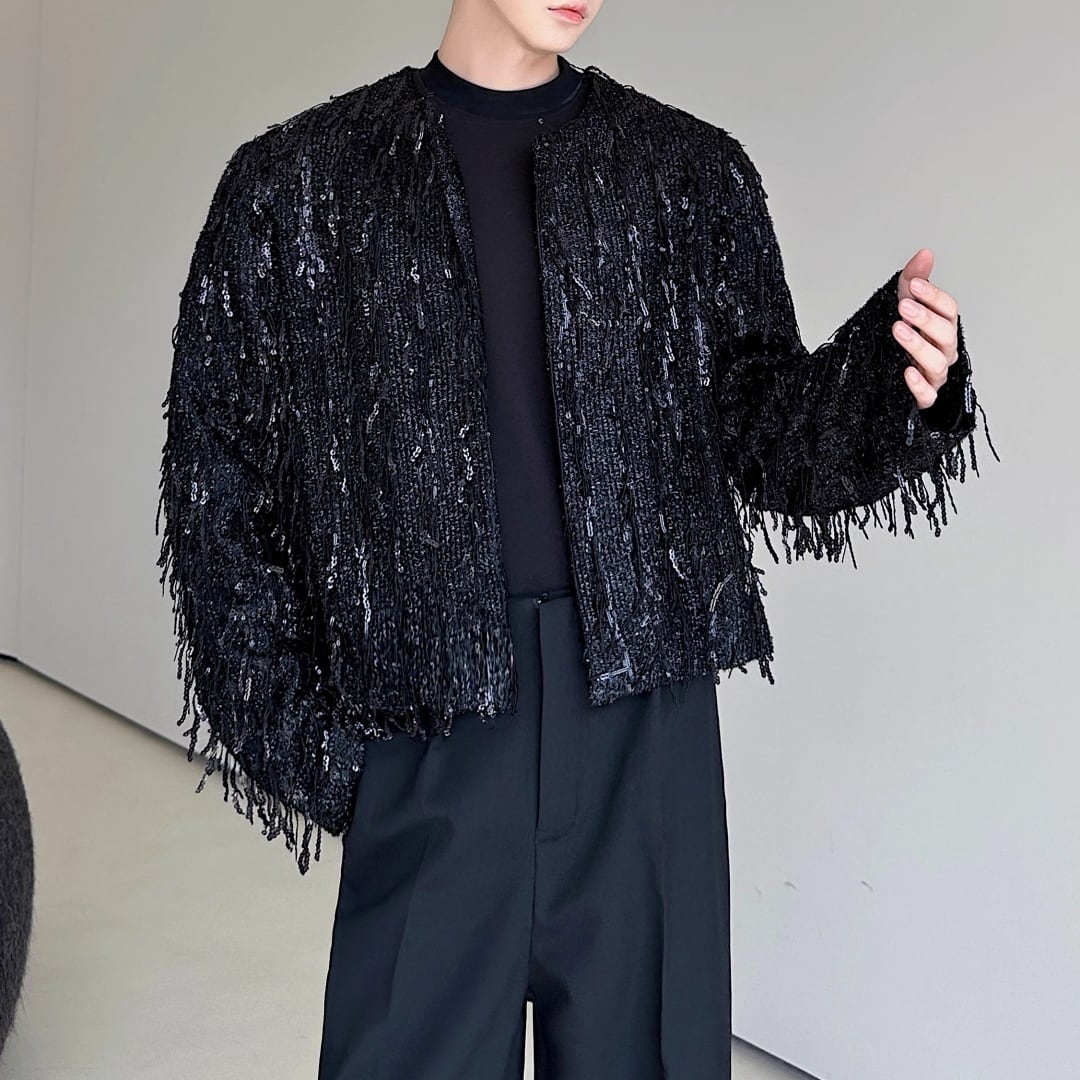 スパンコールフリンジ ノーカラーショートジャケット 2カラー D11975