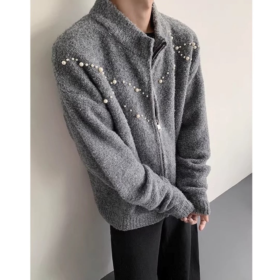 パール装飾 スタンドカラーニットジップカーディガン D11976