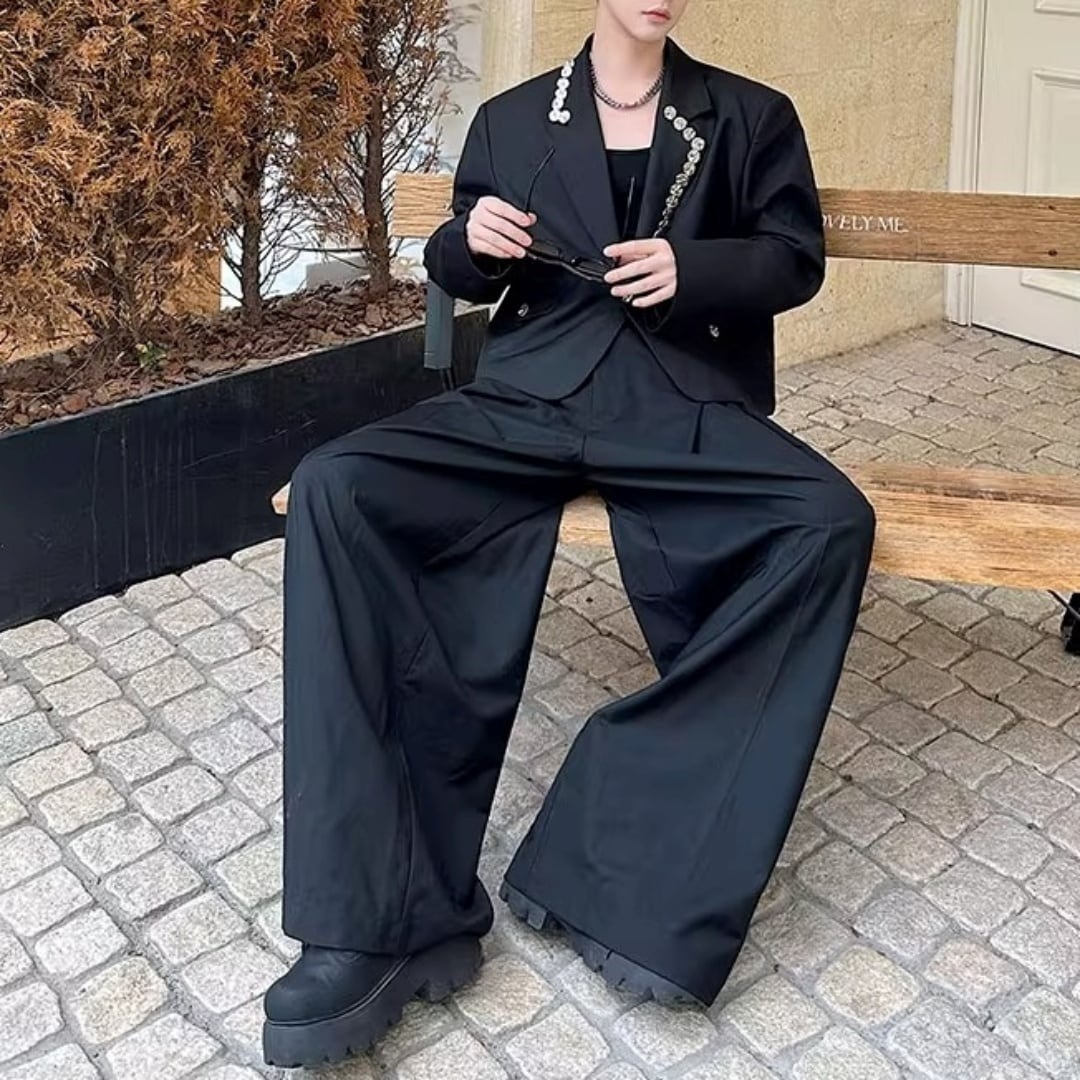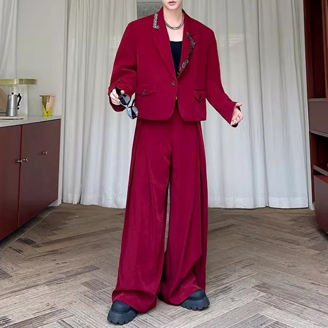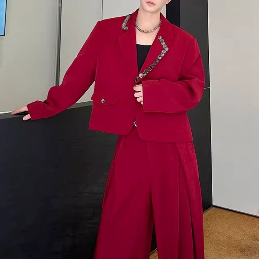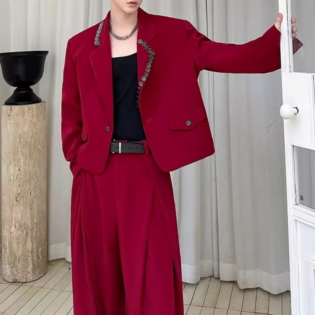 ボタン装飾クロップドジャケット&ワイドパンツスーツセットアップ 2カラー D11979