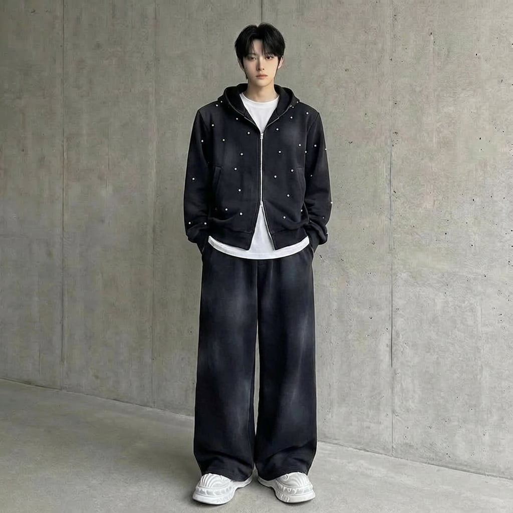 ビーズ装飾 スマッジパーカー&ワイドスウェットパンツ セットアップ 2カラー D11985