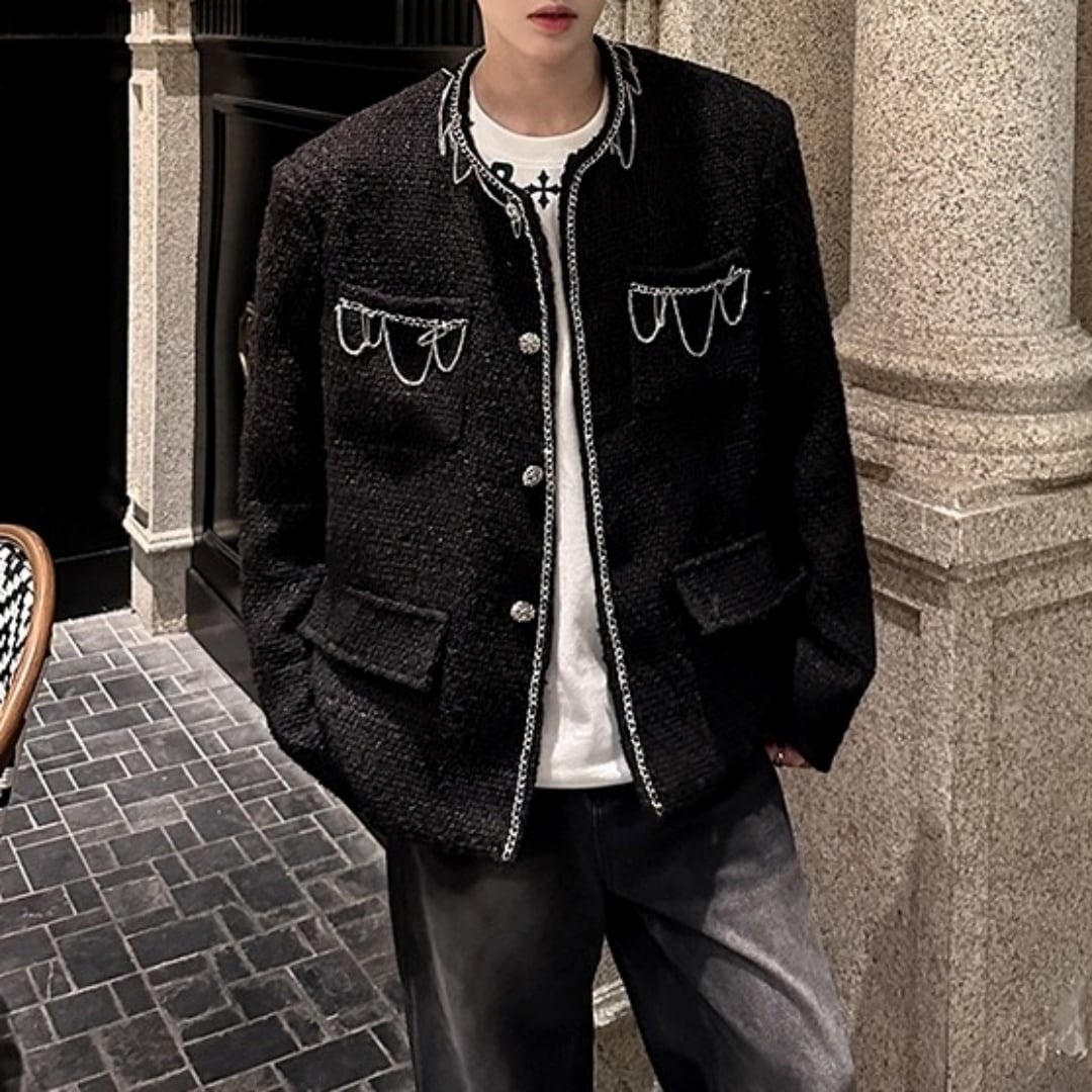 チェーン装飾 ノーカラーツイード調ジャケット D12003