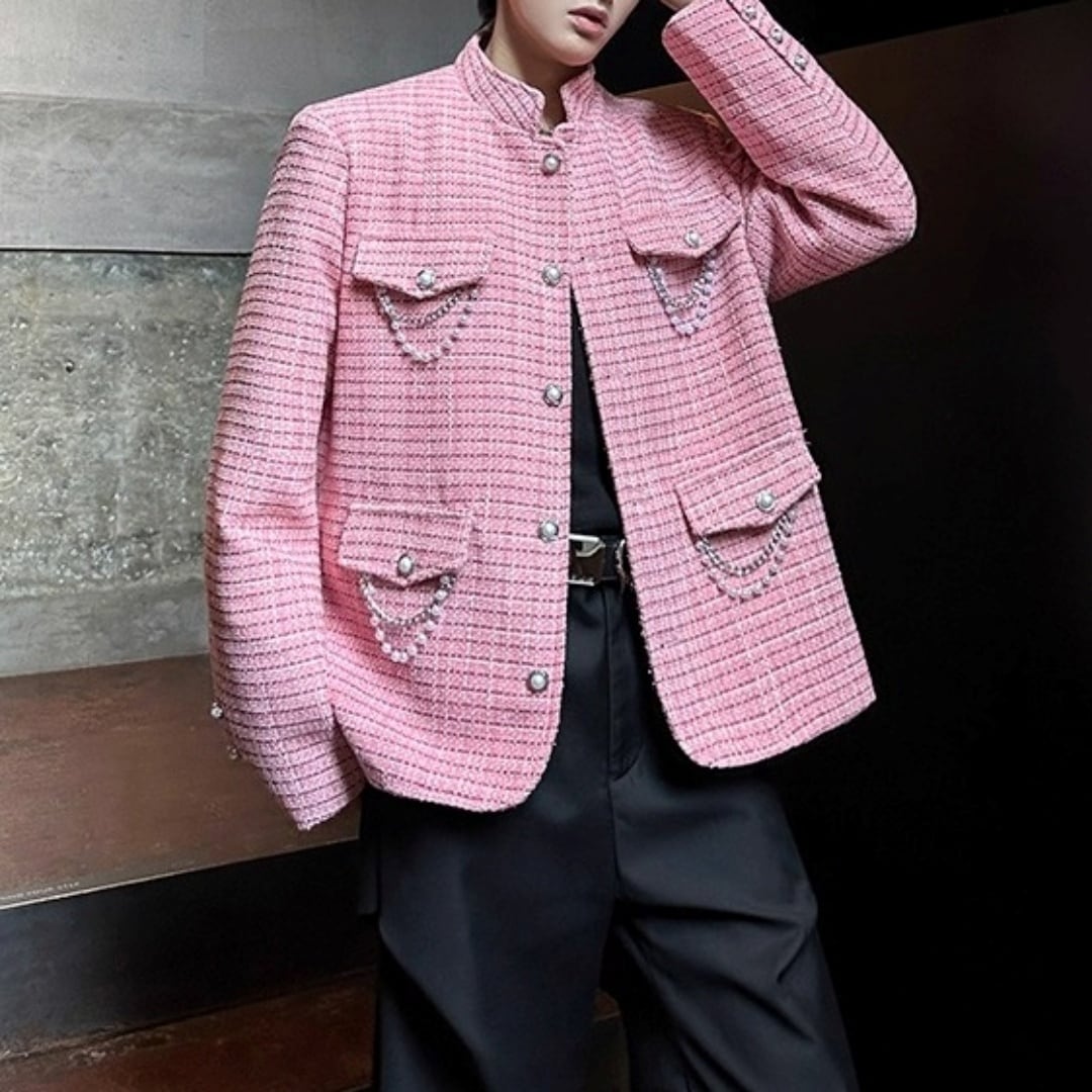 チェーン&パール装飾 スタンドカラーツイード調ジャケット D12005