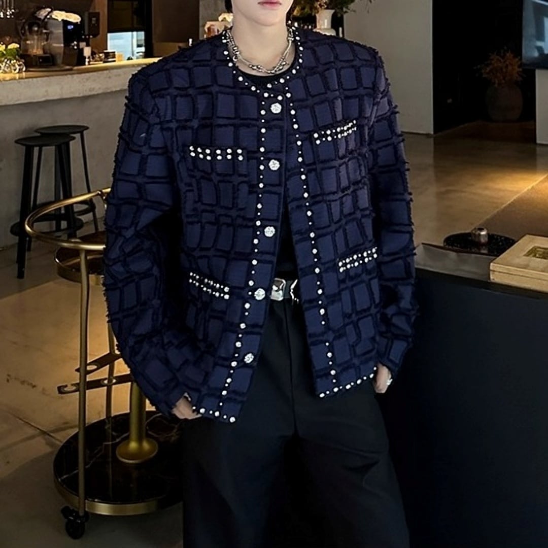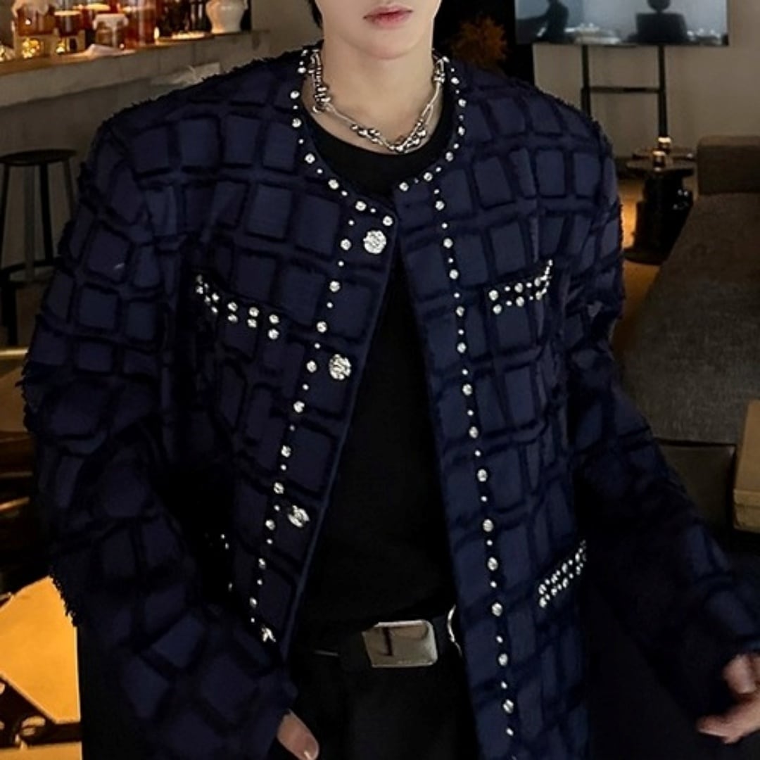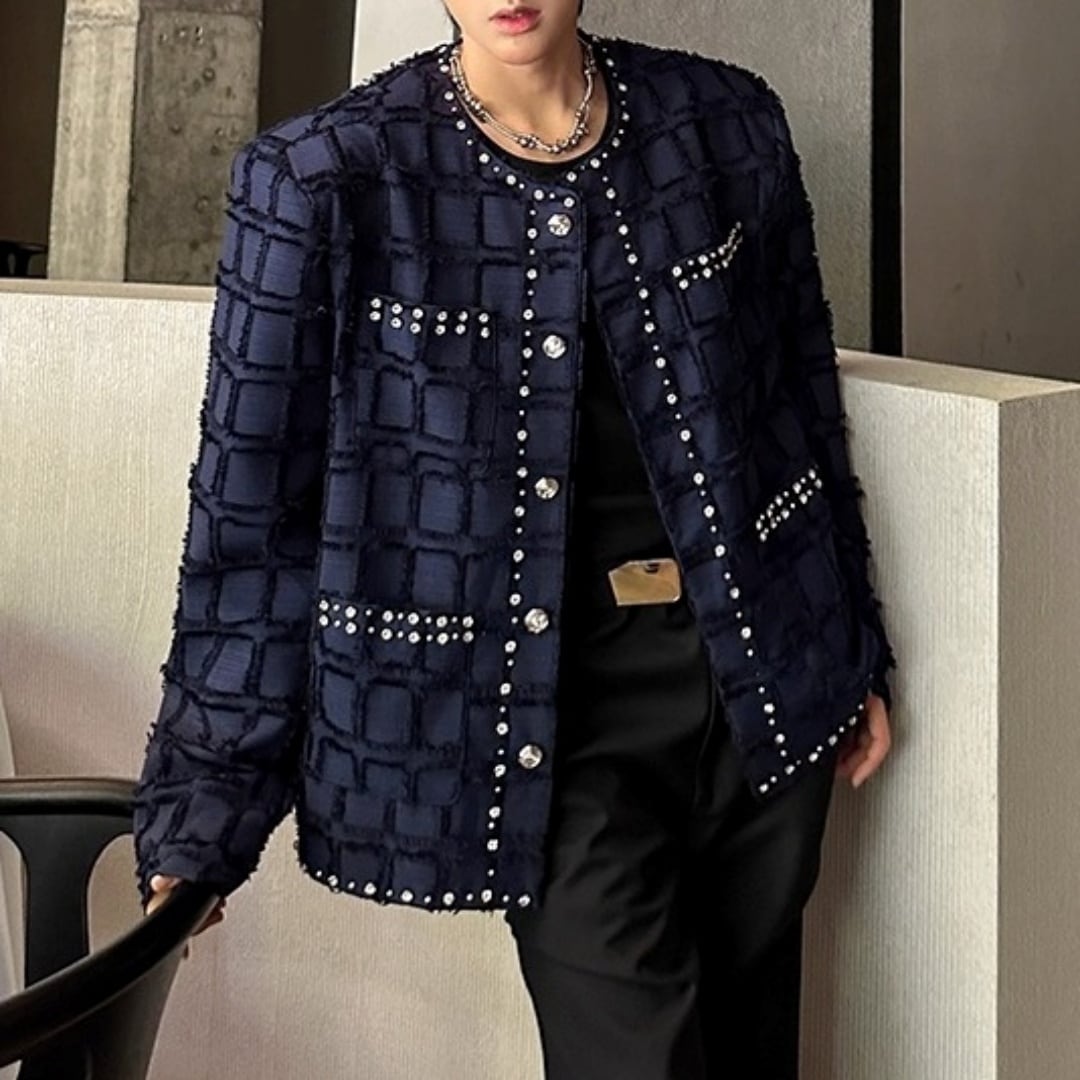 スタッズ&パール装飾 フリンジチェックノーカラージャケット D12006