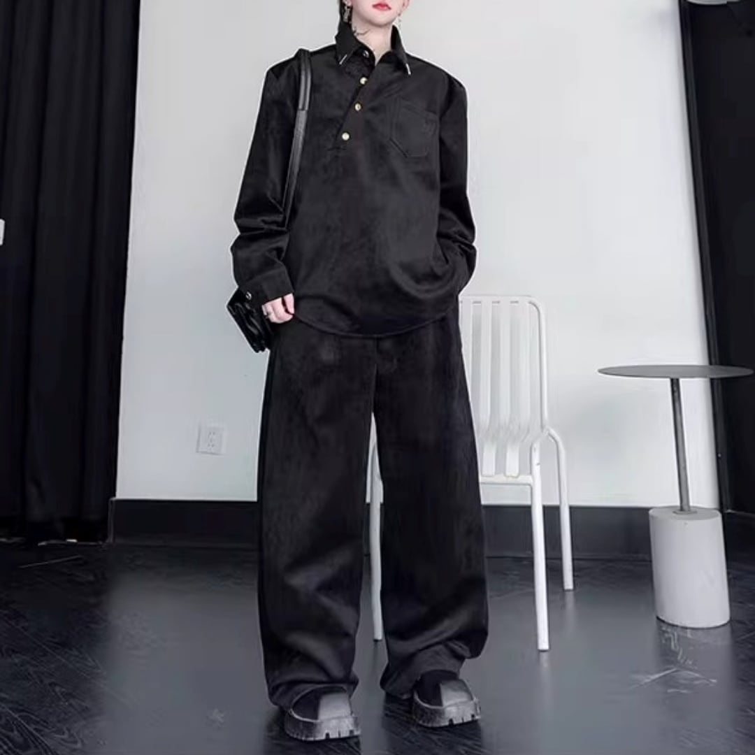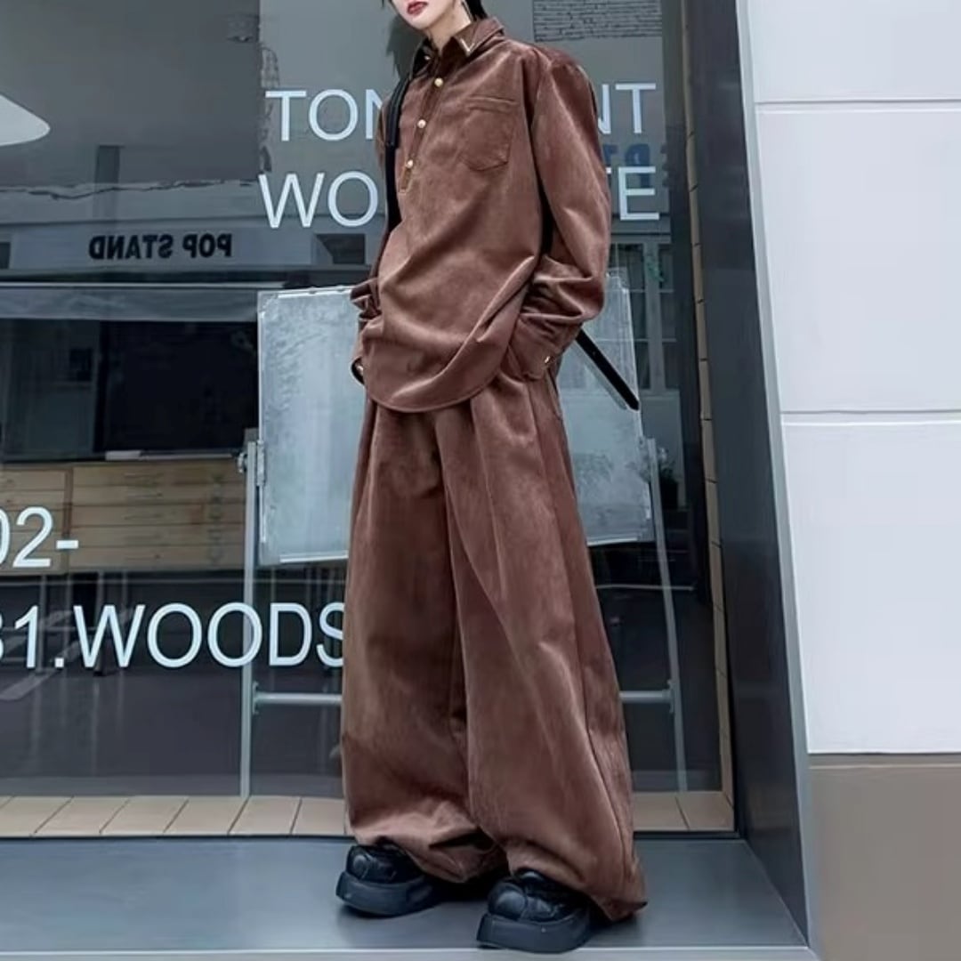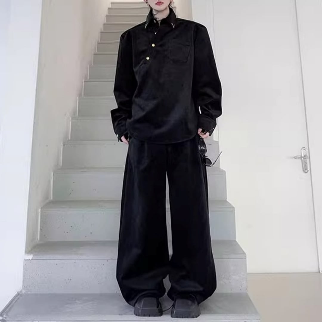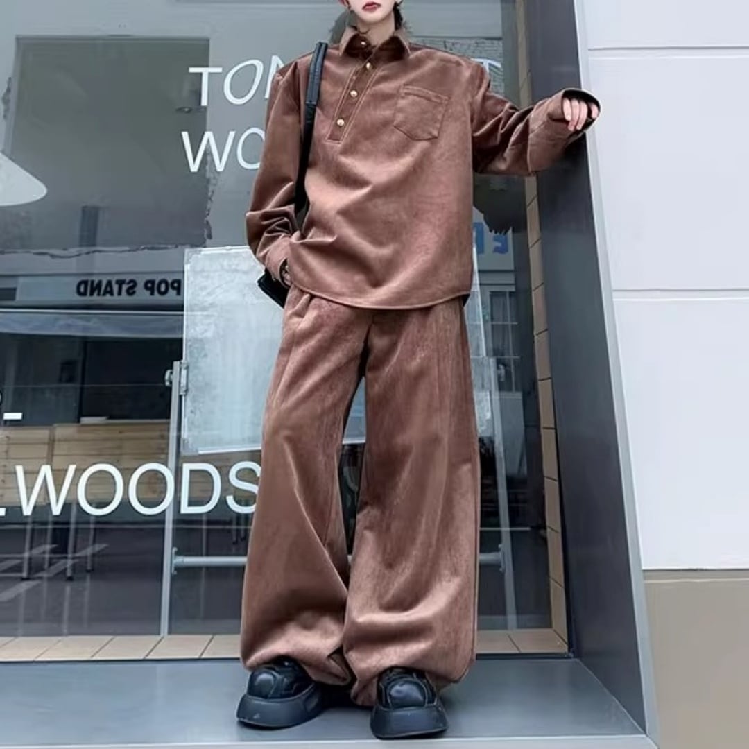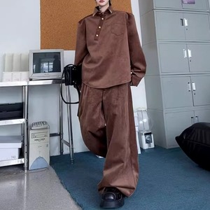 レトロベルベット調 ハーフボタンシャツ&ワイドパンツセットアップ 2カラー D12015