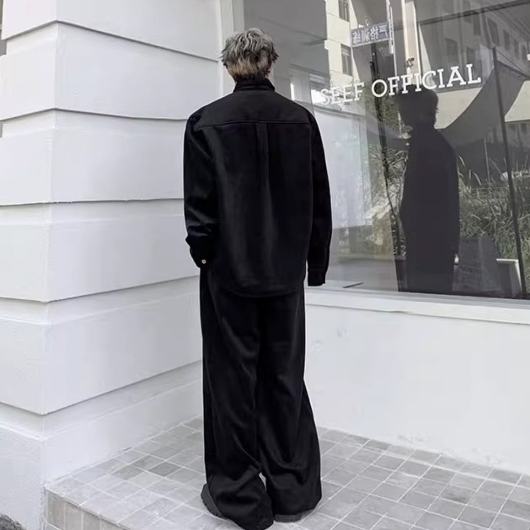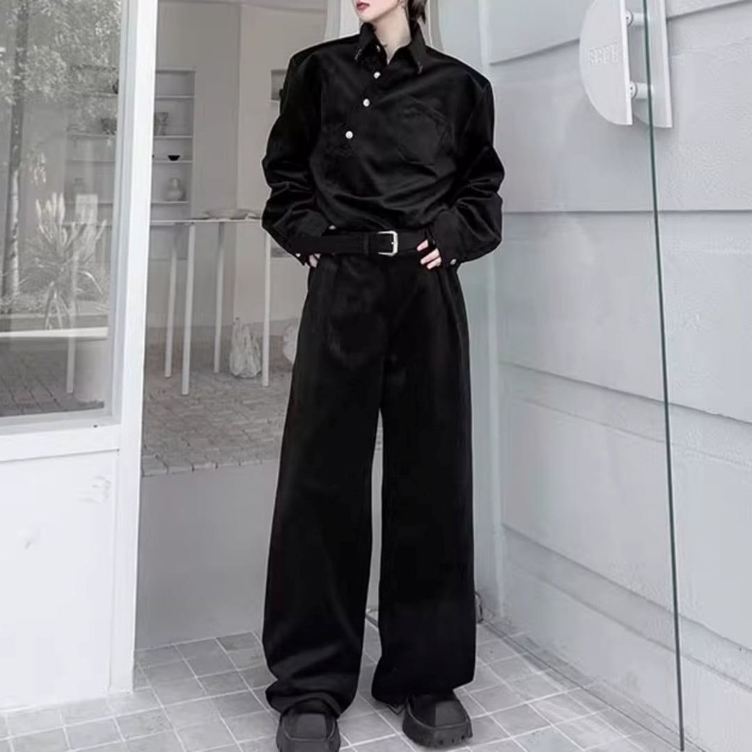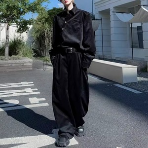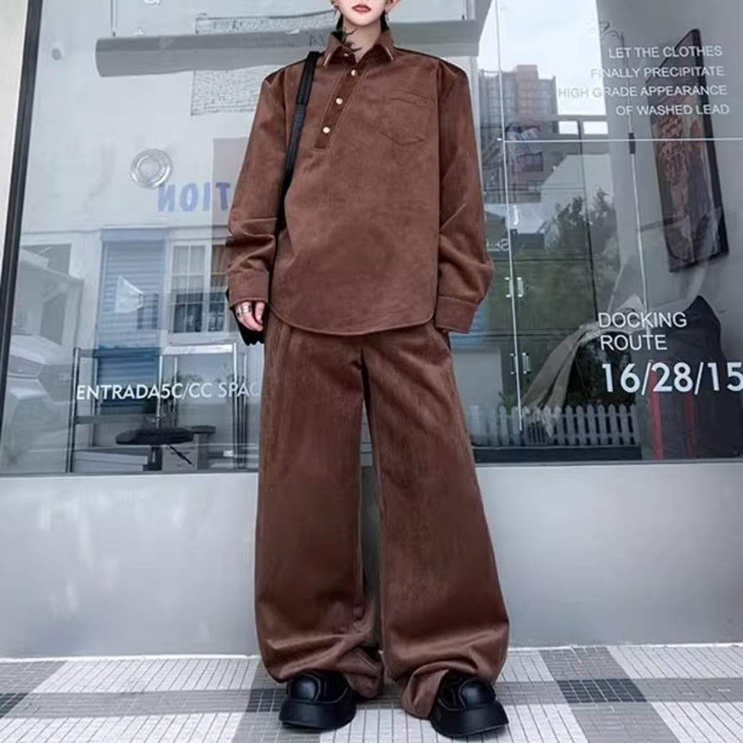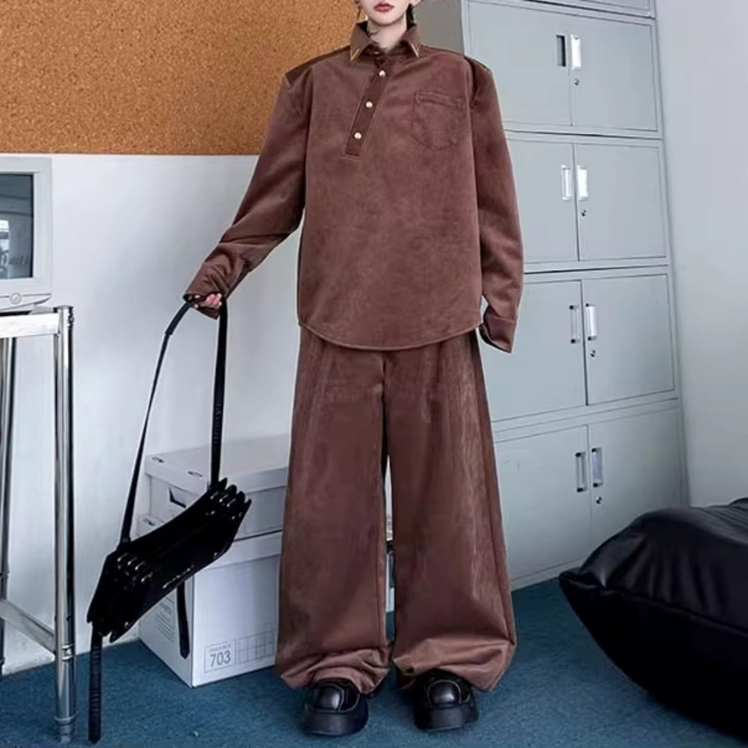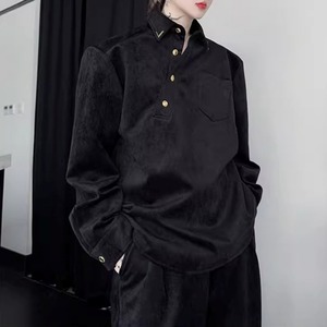 レトロベルベット調 ハーフボタンシャツ&ワイドパンツセットアップ 2カラー D12015
