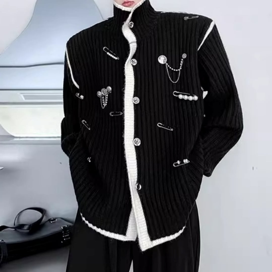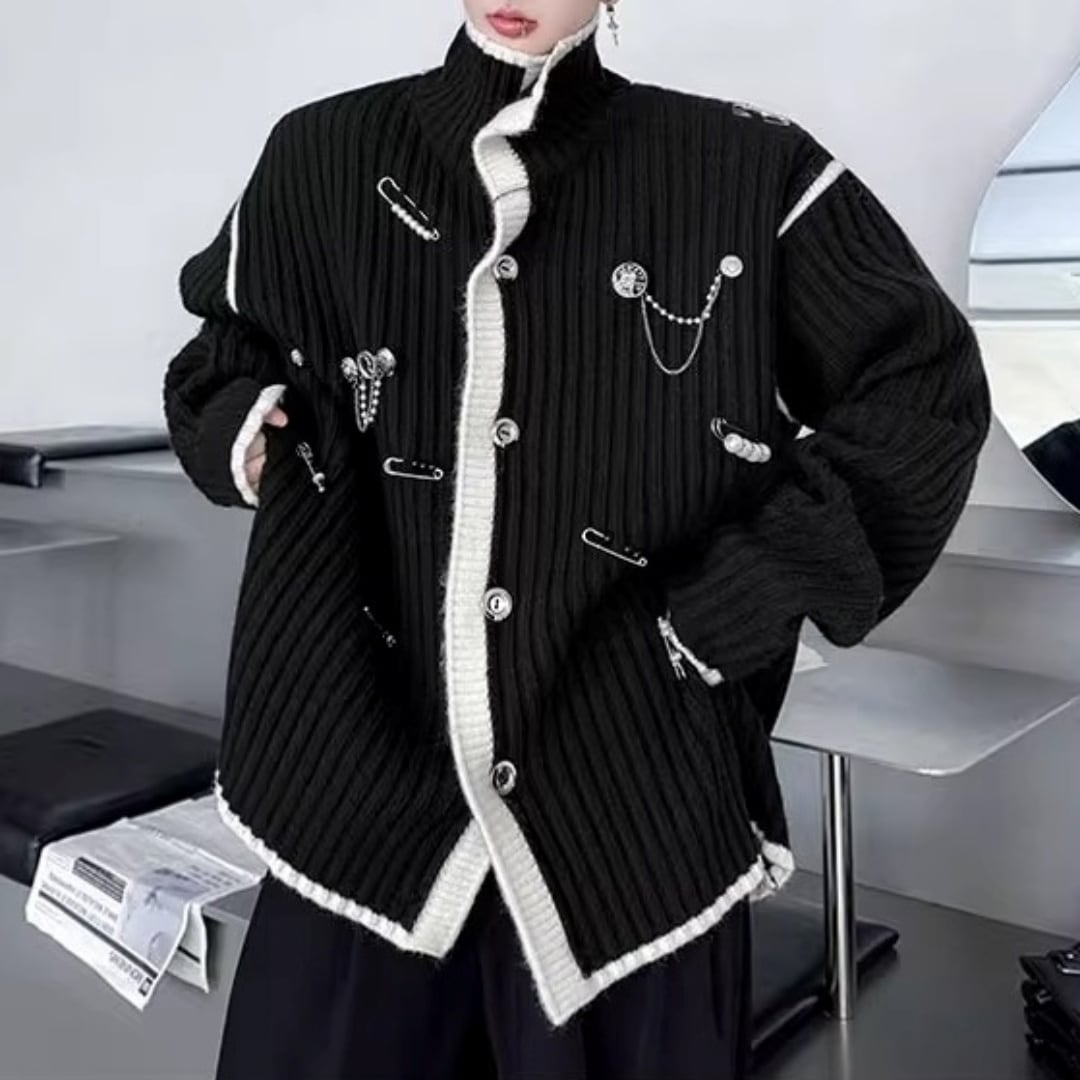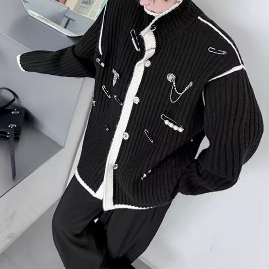 メタルピン装飾 バイカラーリブニットカーディガン 2カラー D12018
