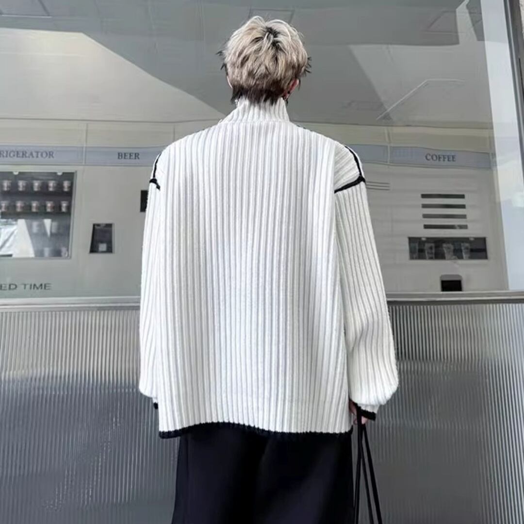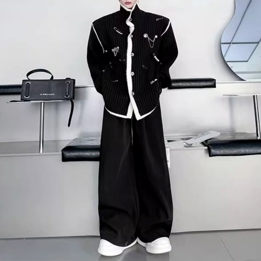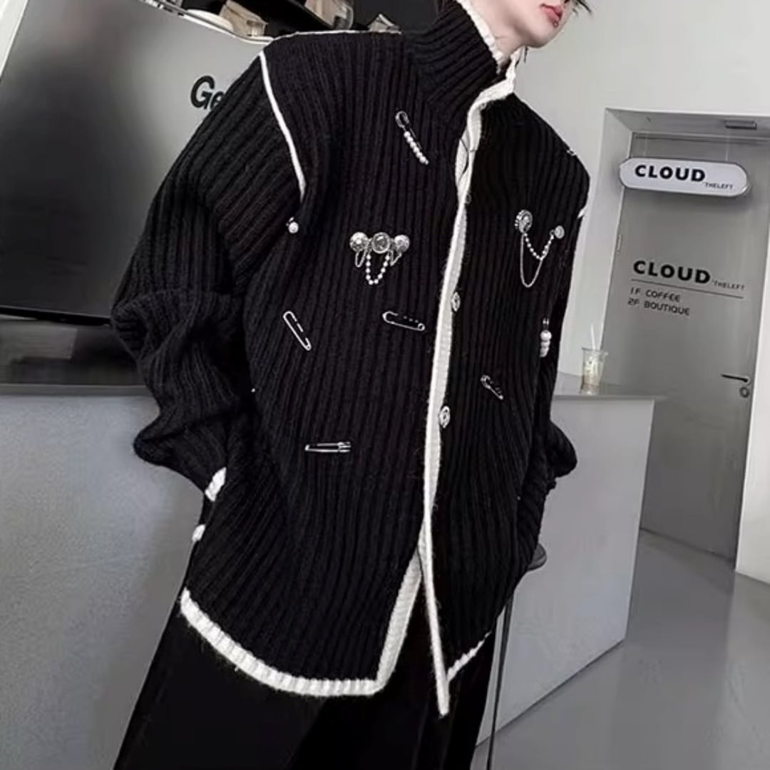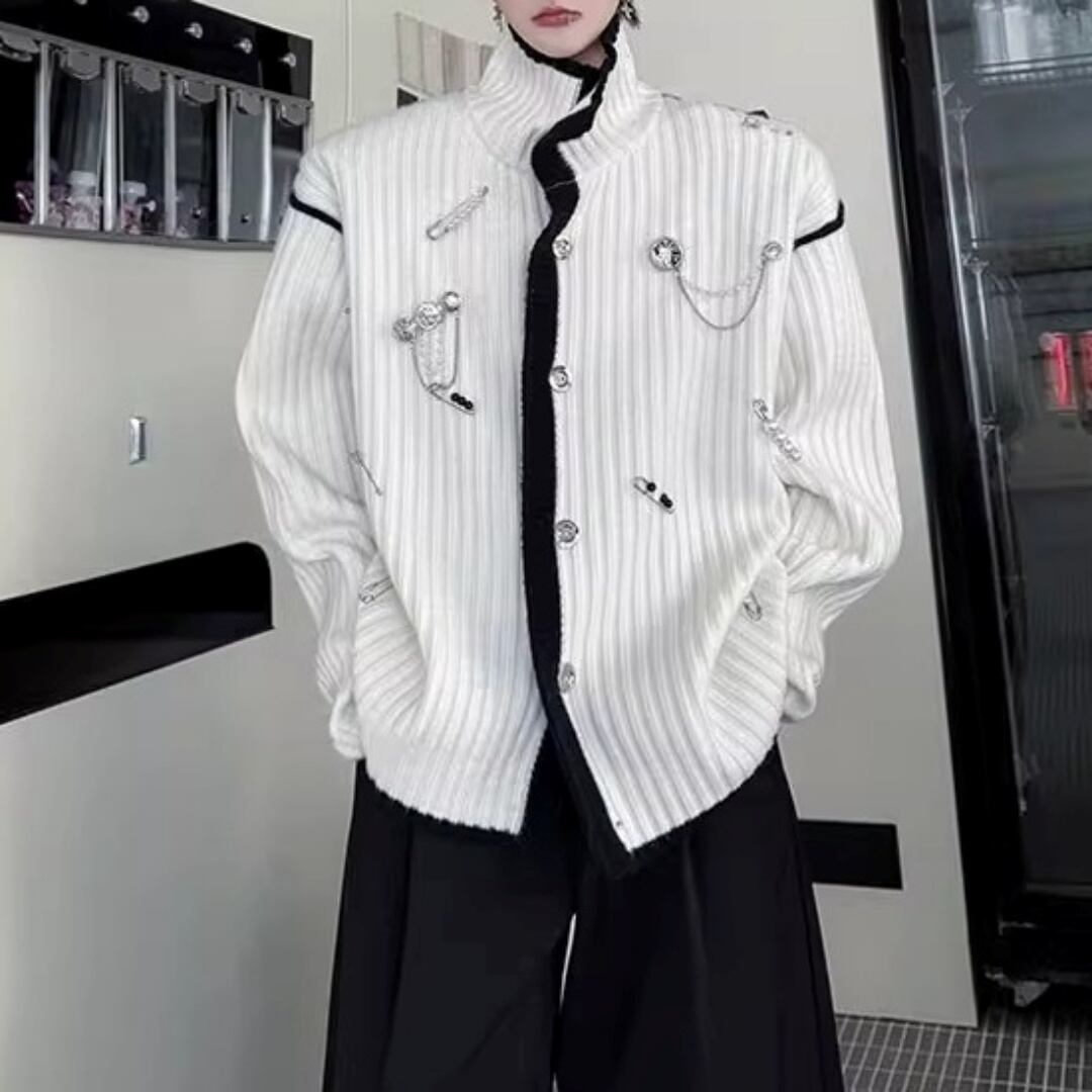 メタルピン装飾 バイカラーリブニットカーディガン 2カラー D12018