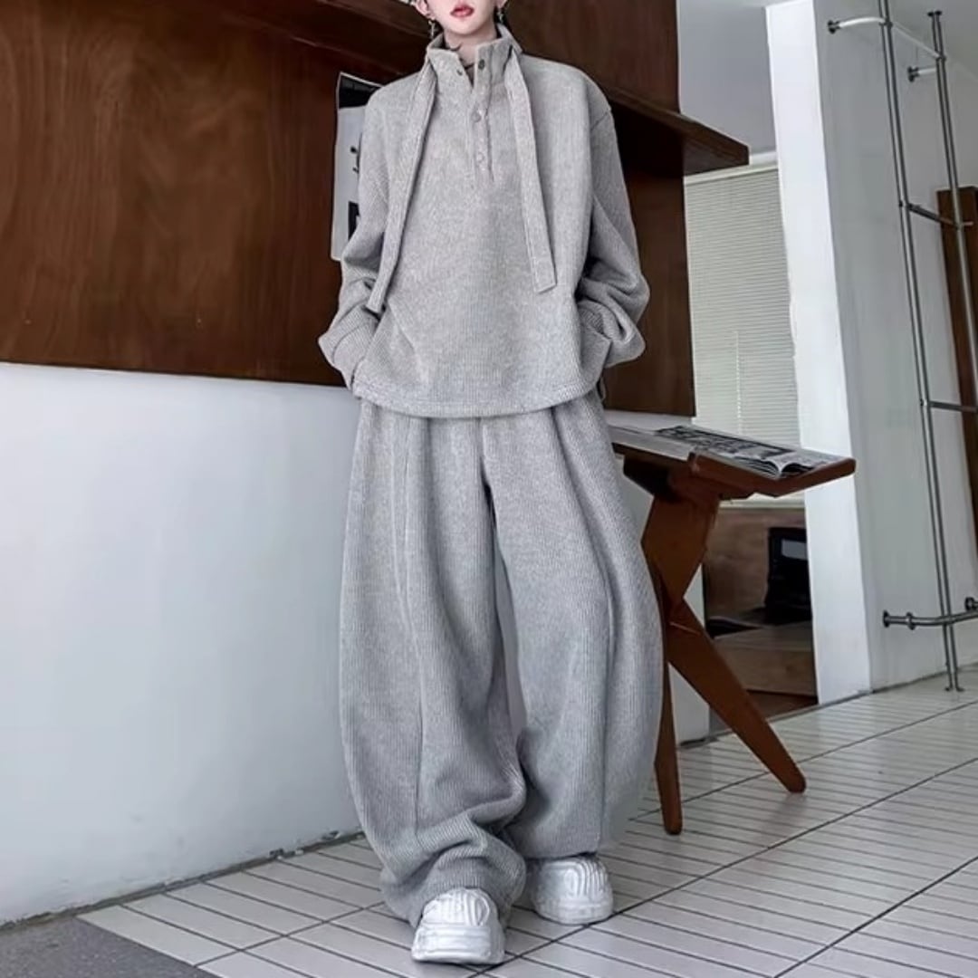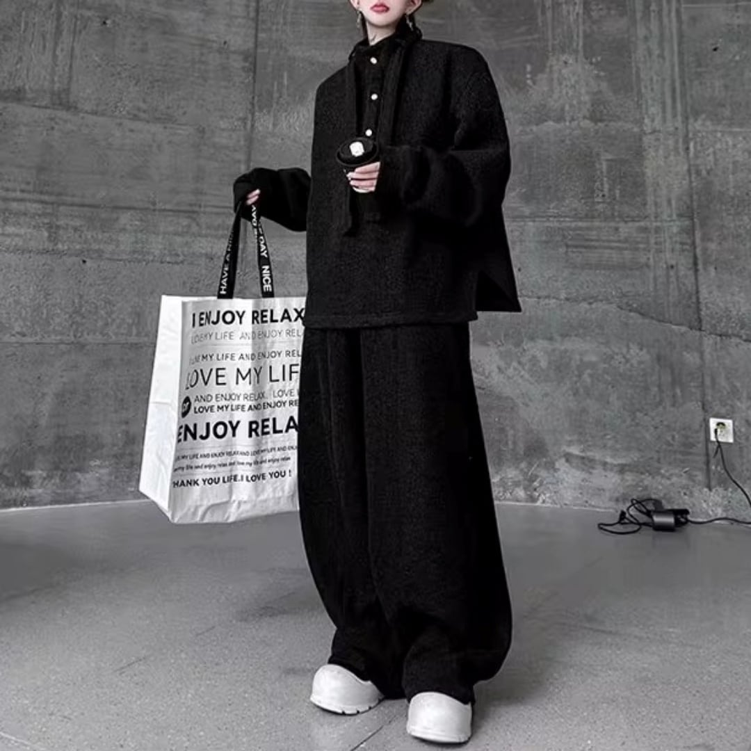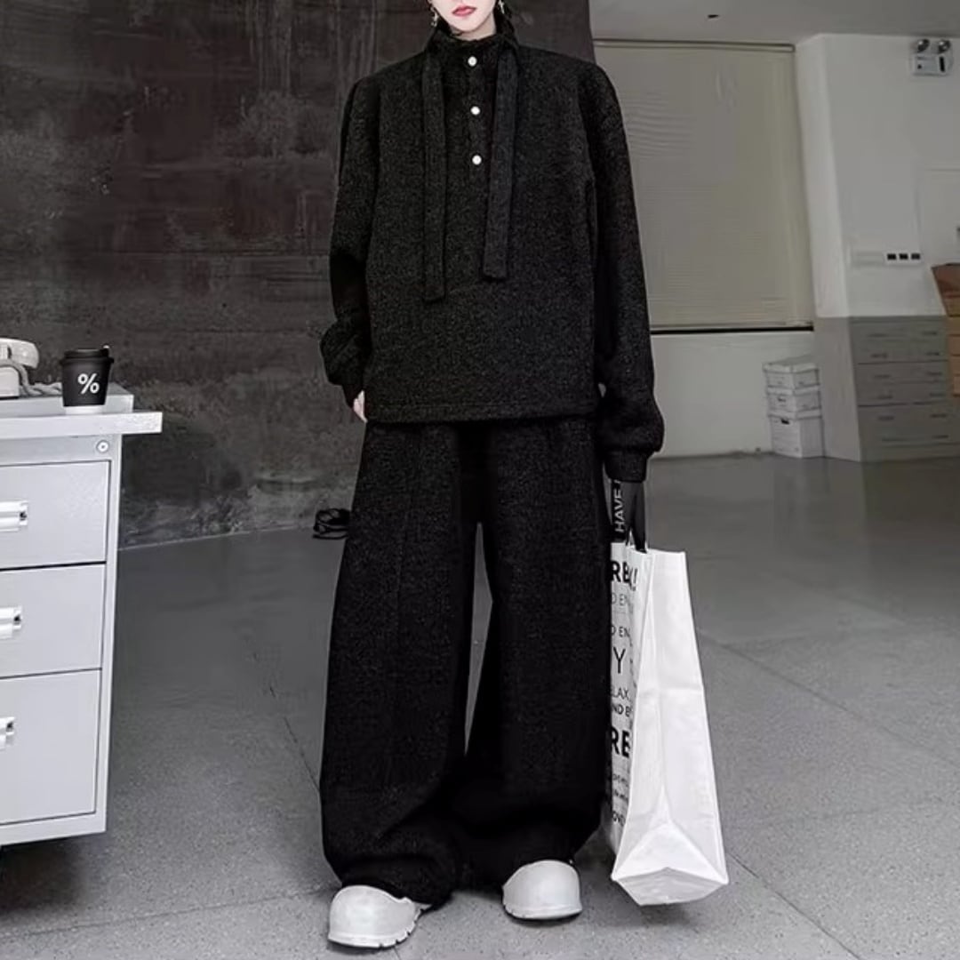 ネックリボン付き ハイネックプルオーバー&ワイドパンツセットアップ 3カラー D12047