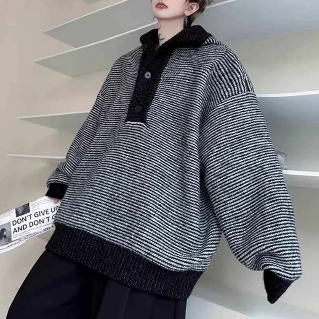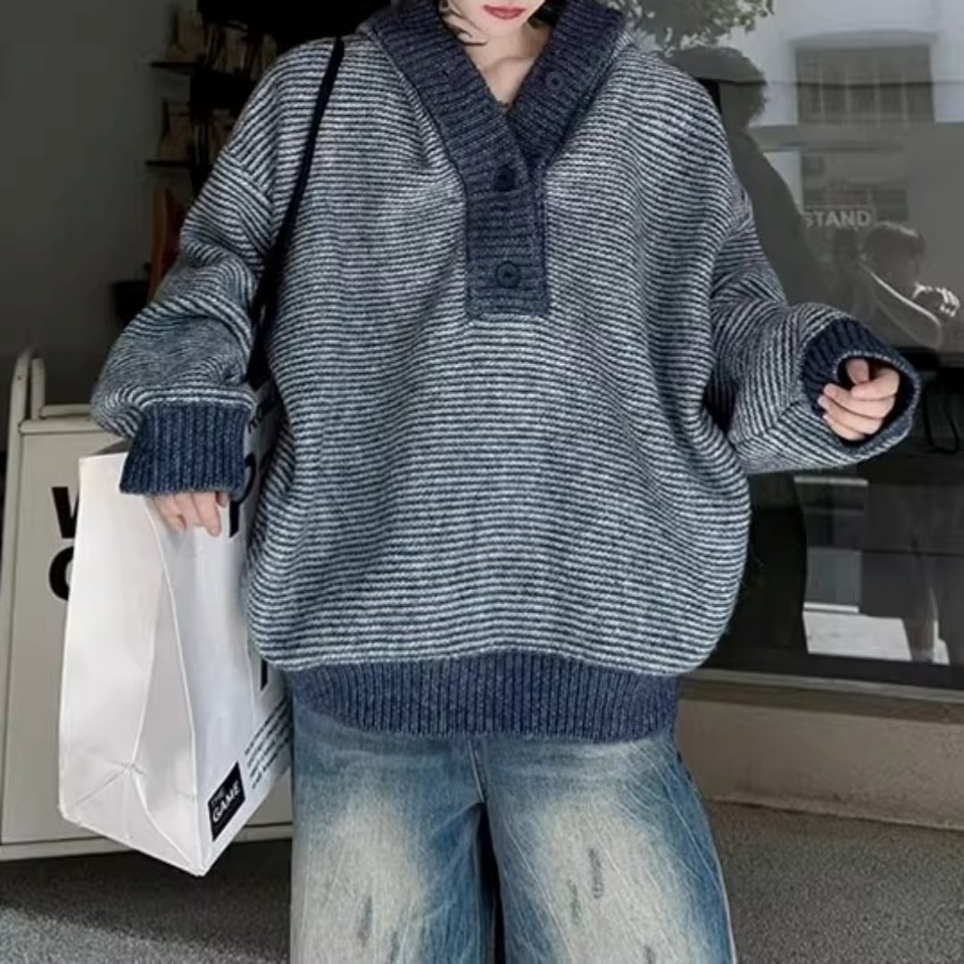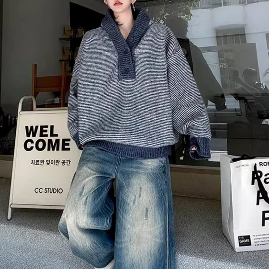 ルーズフィット ストライプ柄ニットフーディ 2カラー D12049