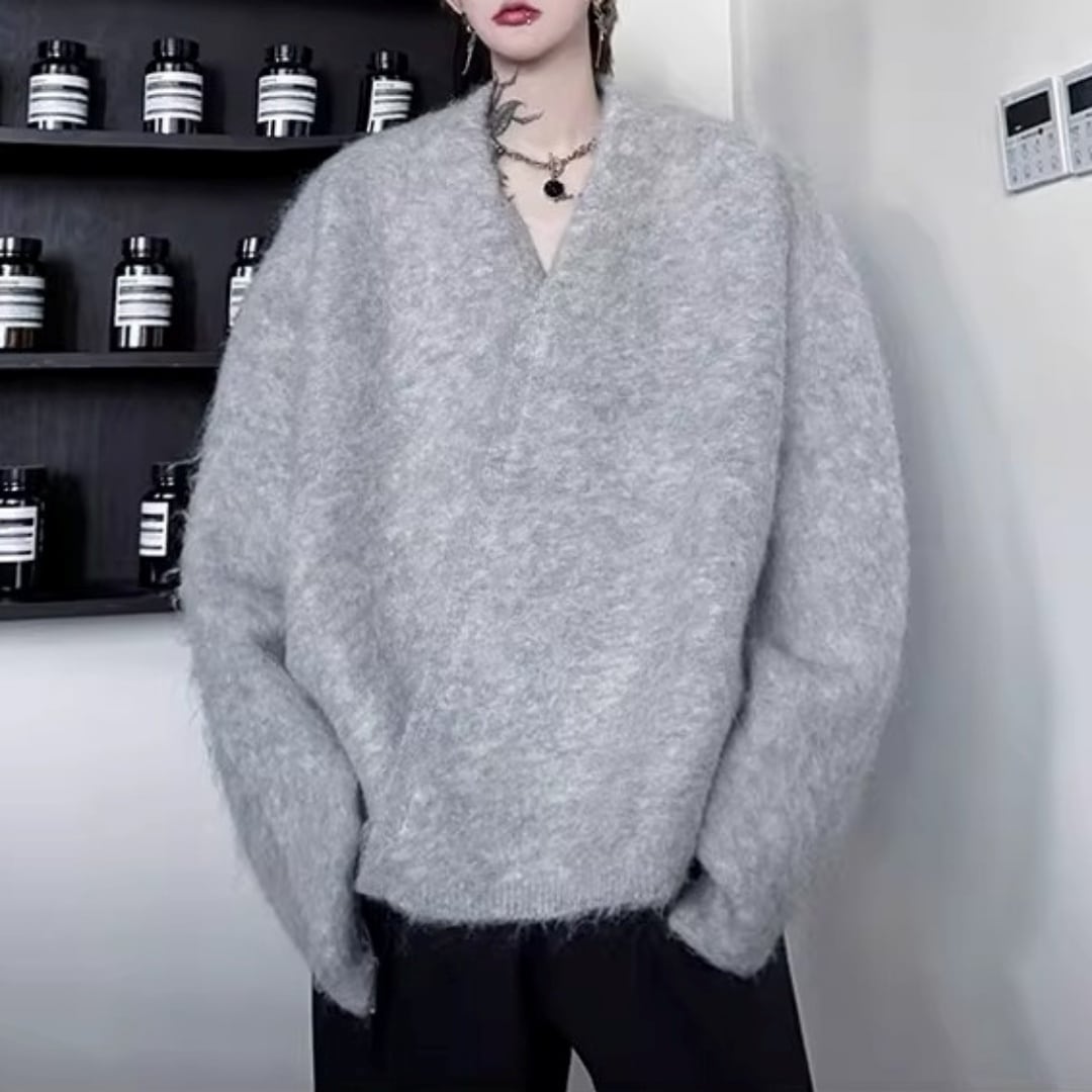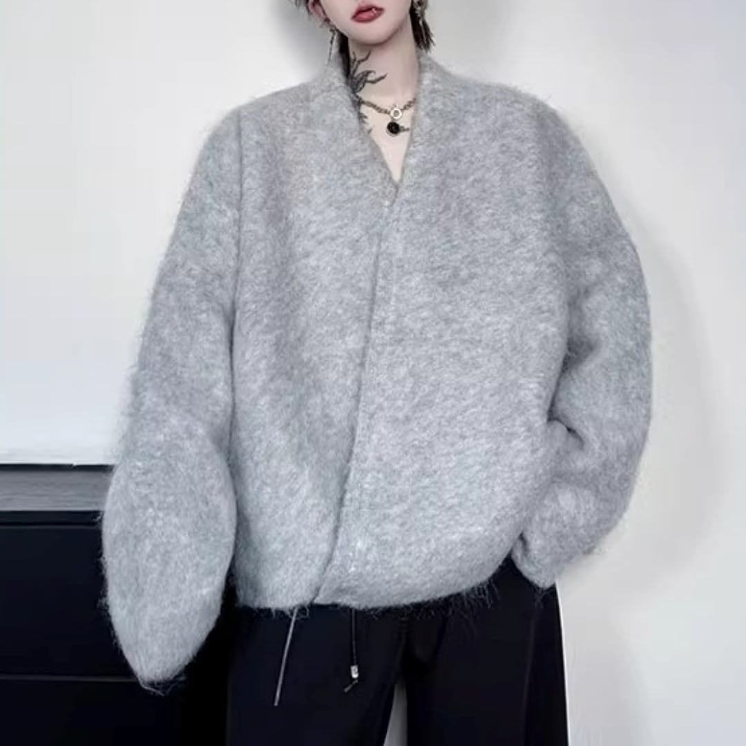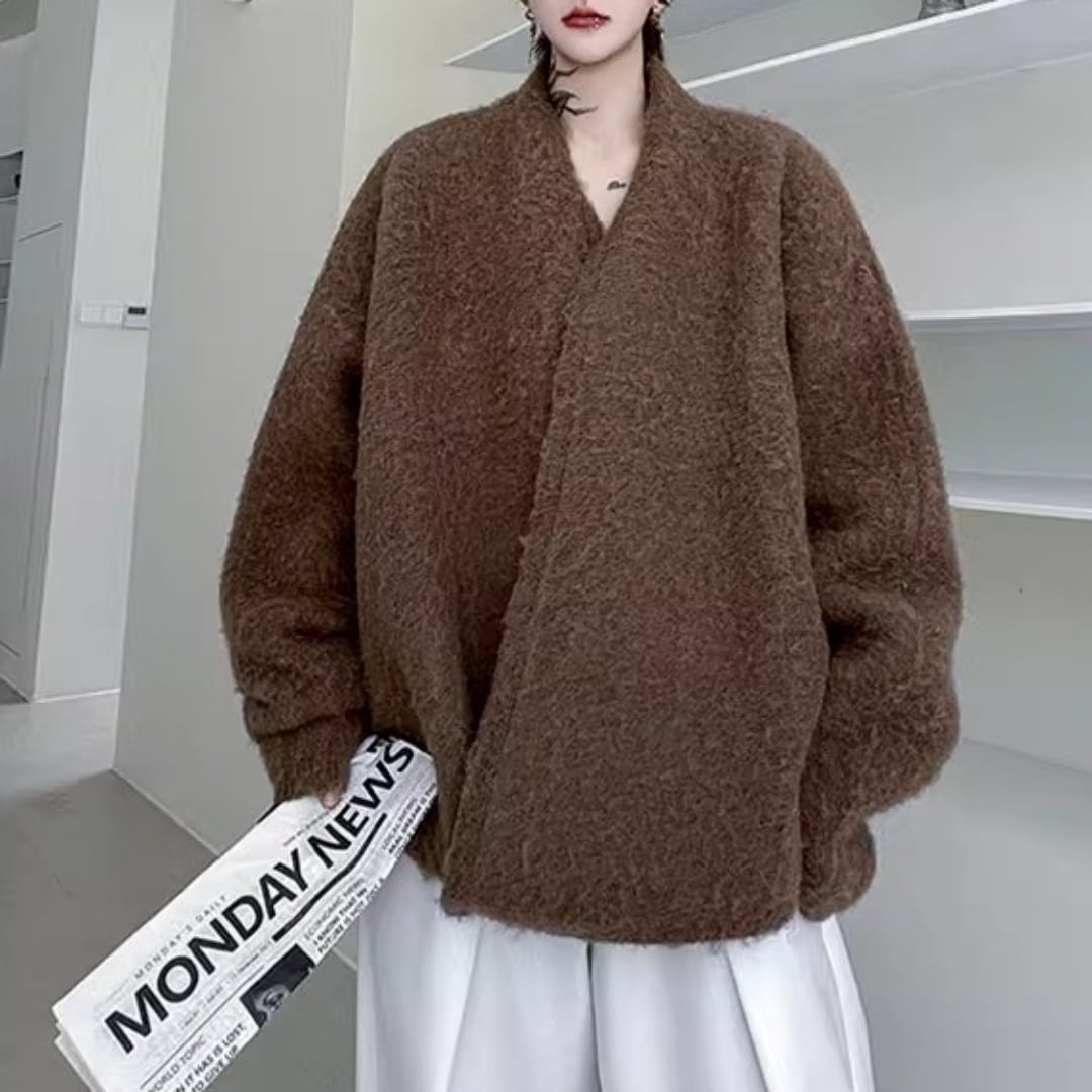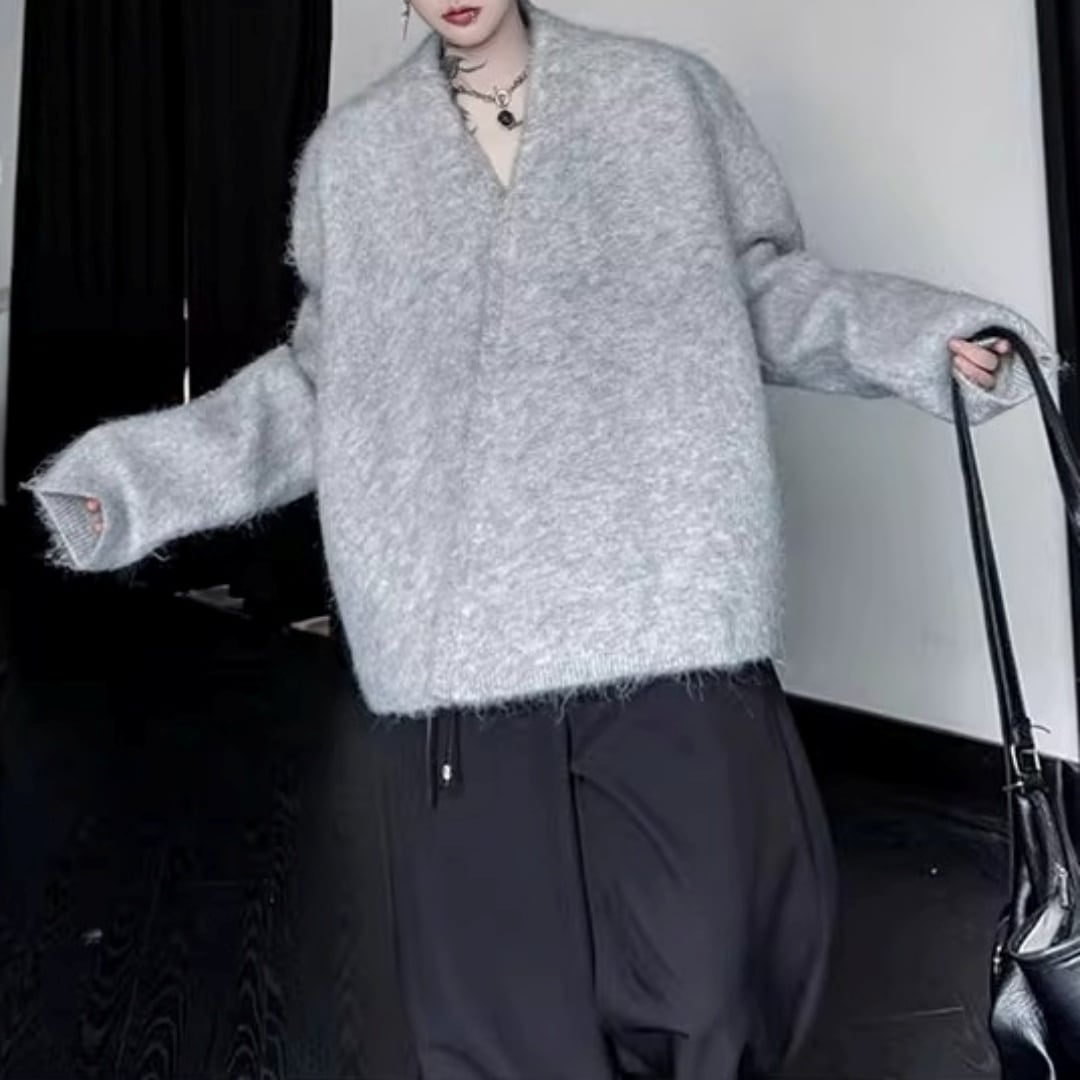 隠しボタン Vネックルーズニットカーディガン 3カラー D12050