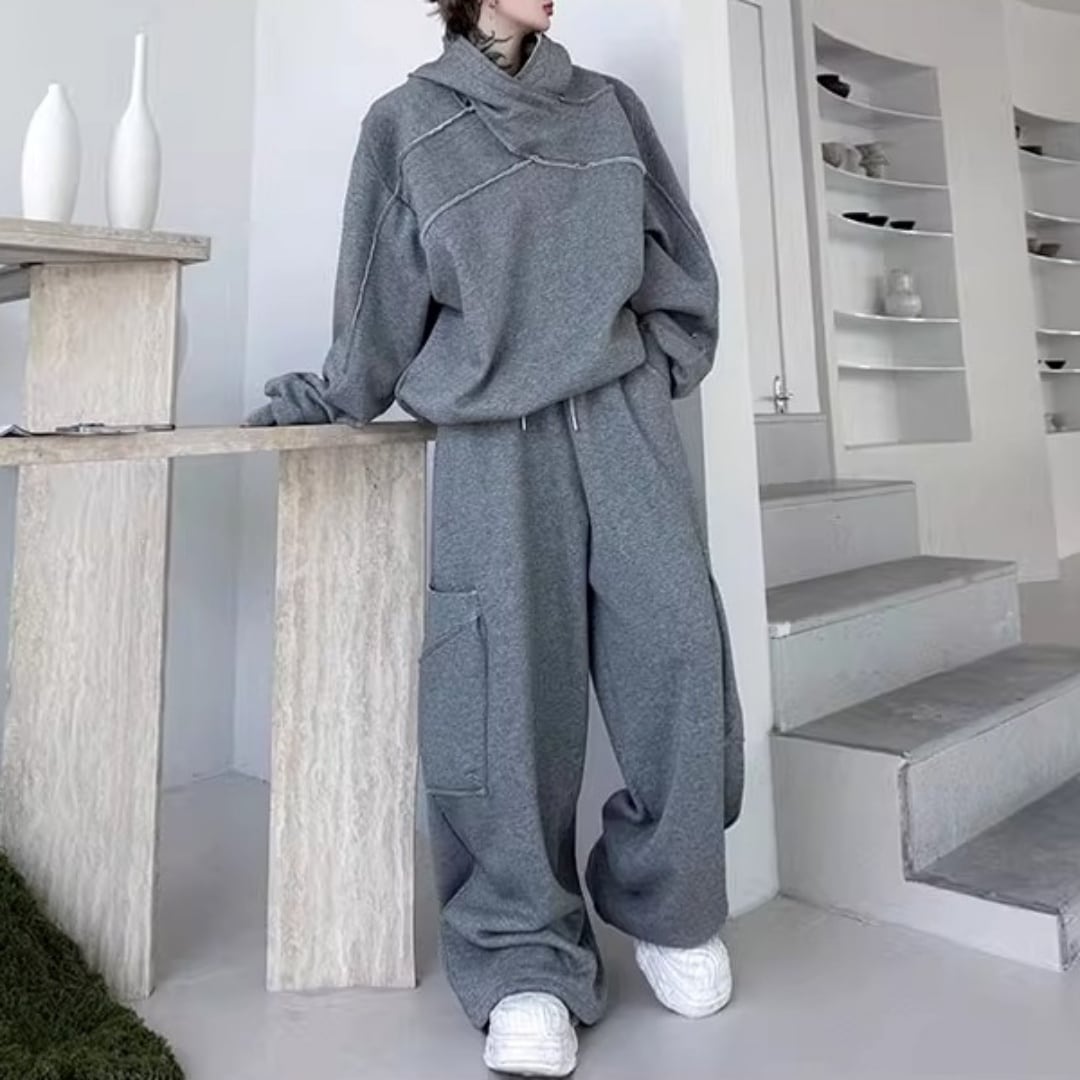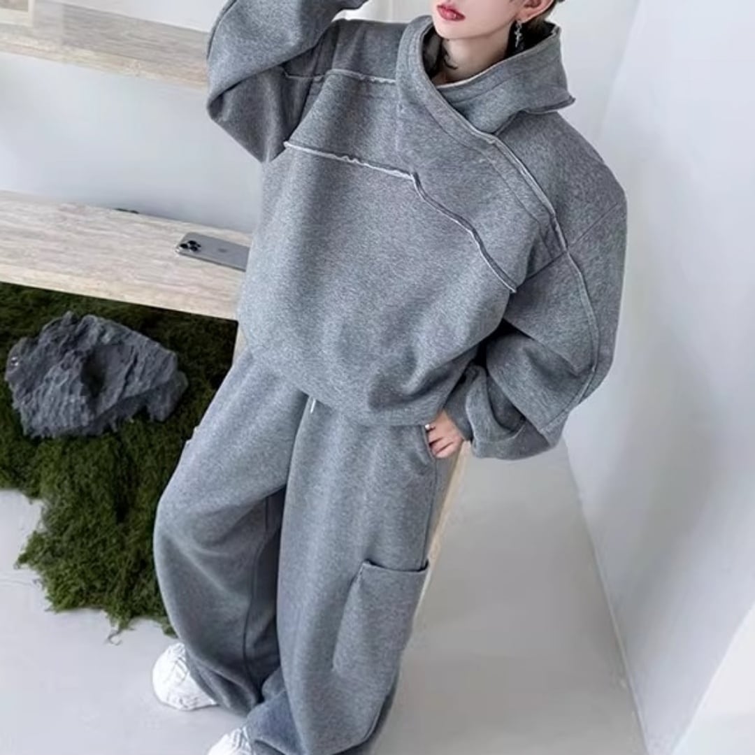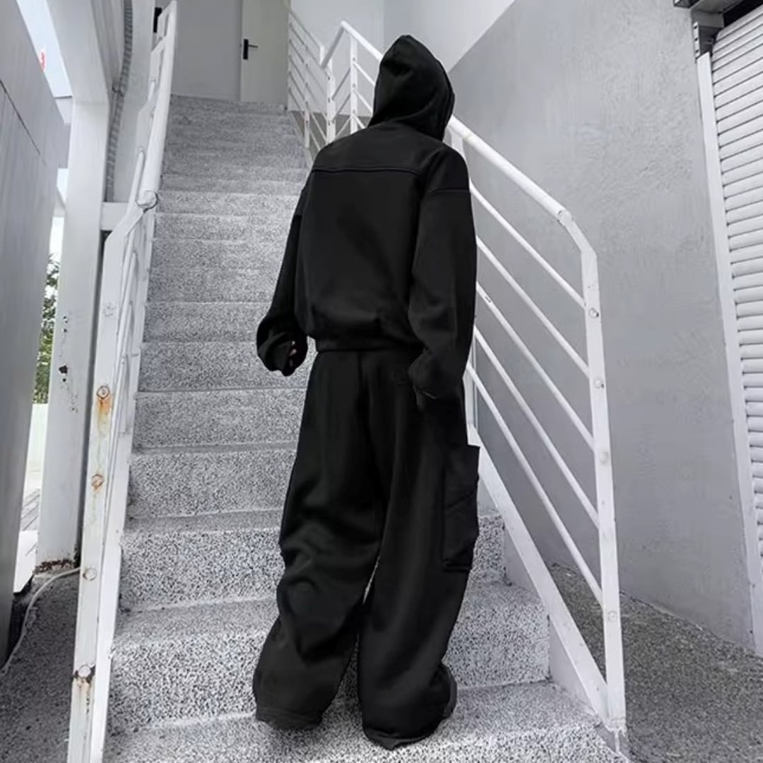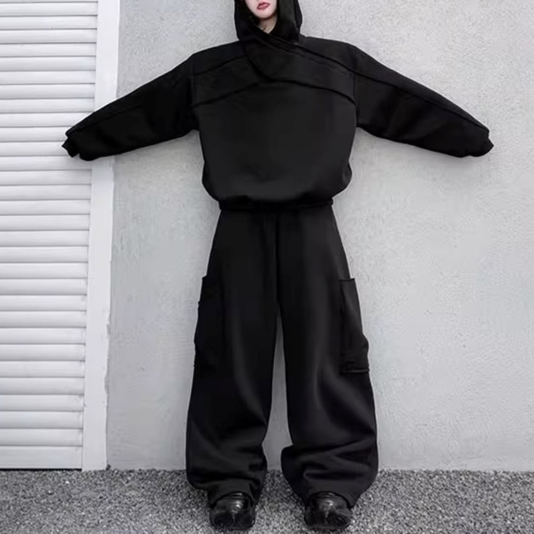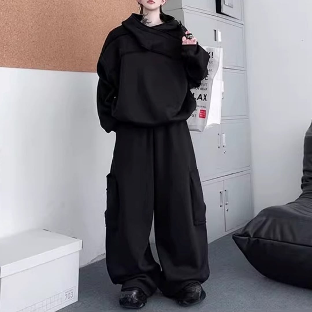 変形クロスネックフーディ&ワイドスウェットパンツ セットアップ 2カラー D12052