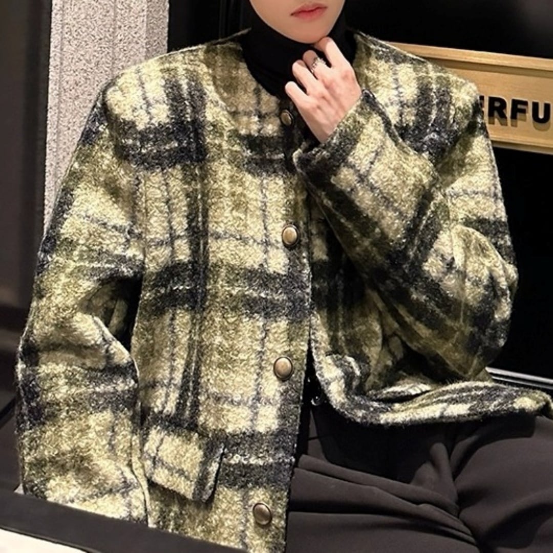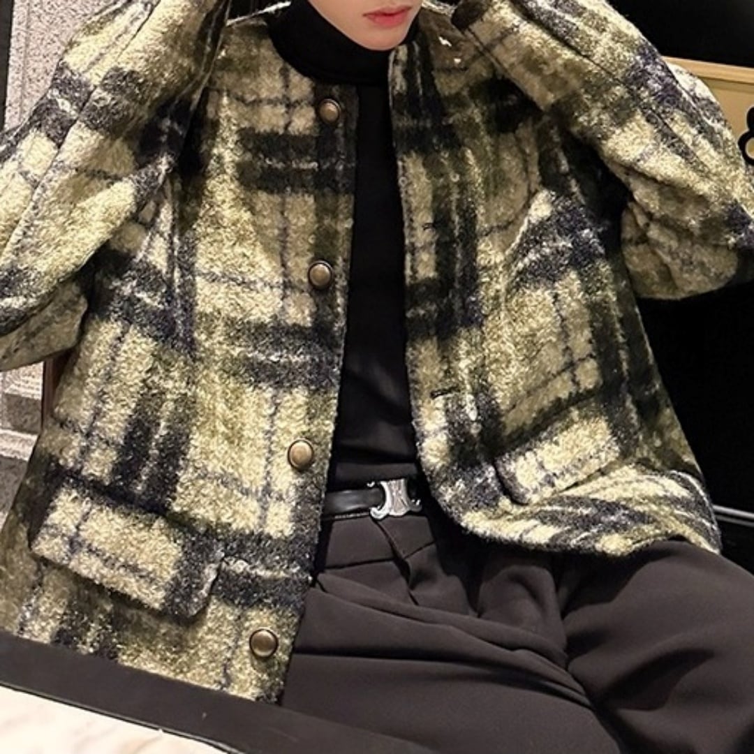 レトロクラシカル チェック柄ノーカラージャケット D12065