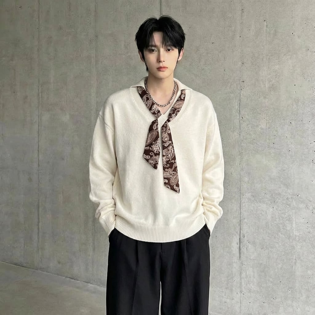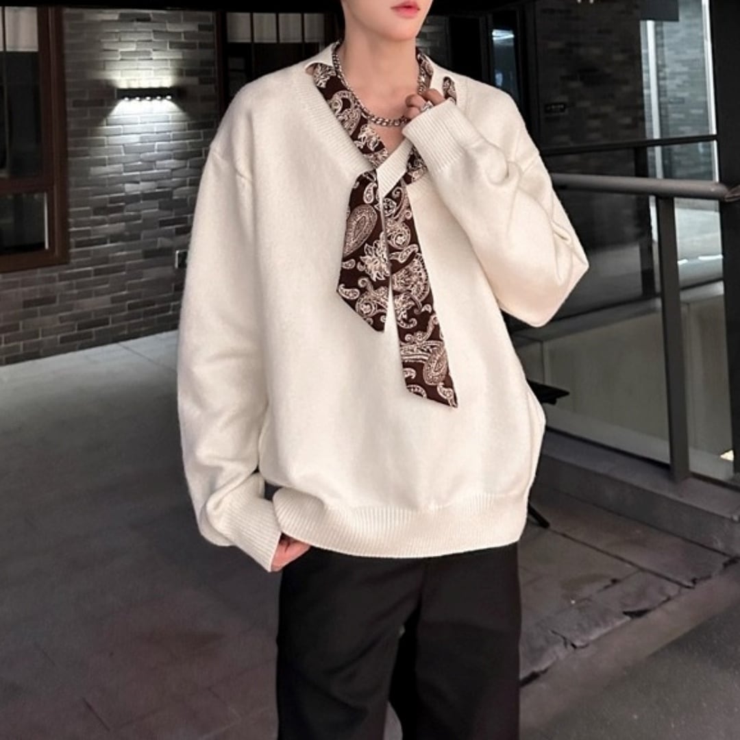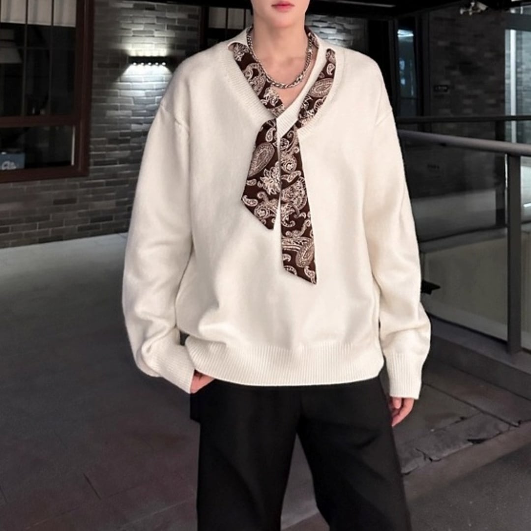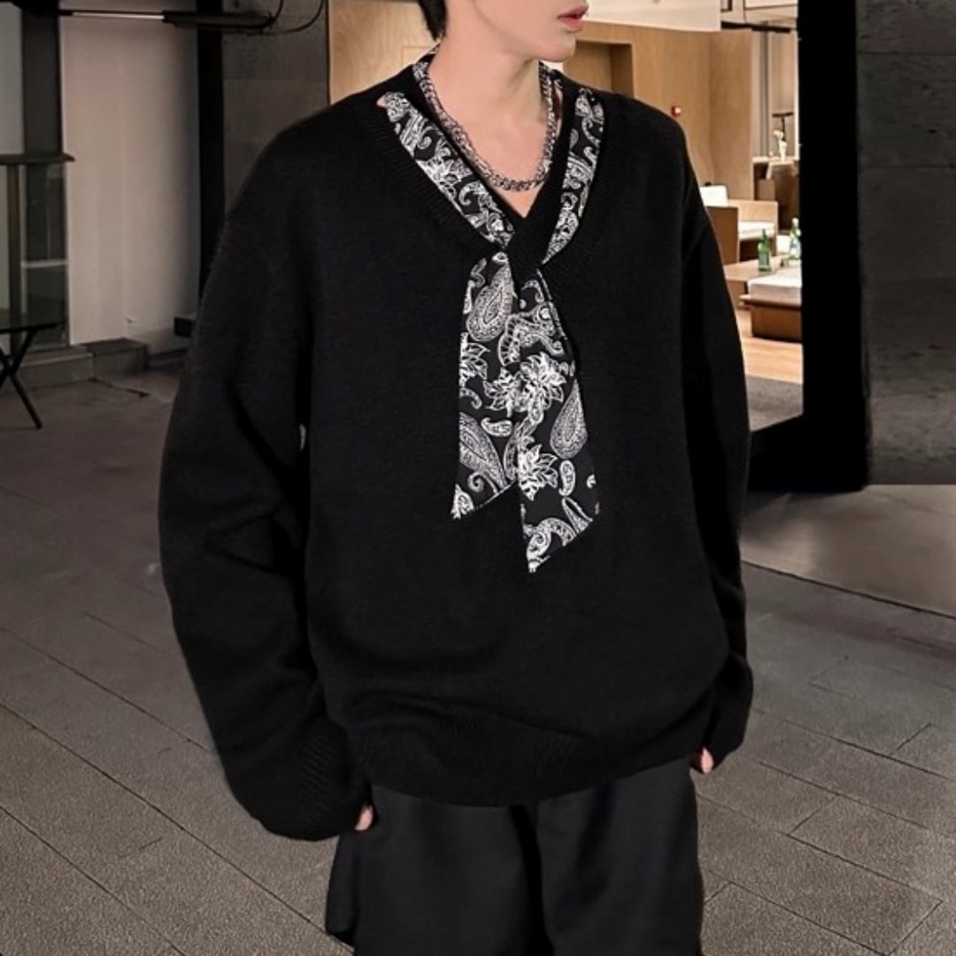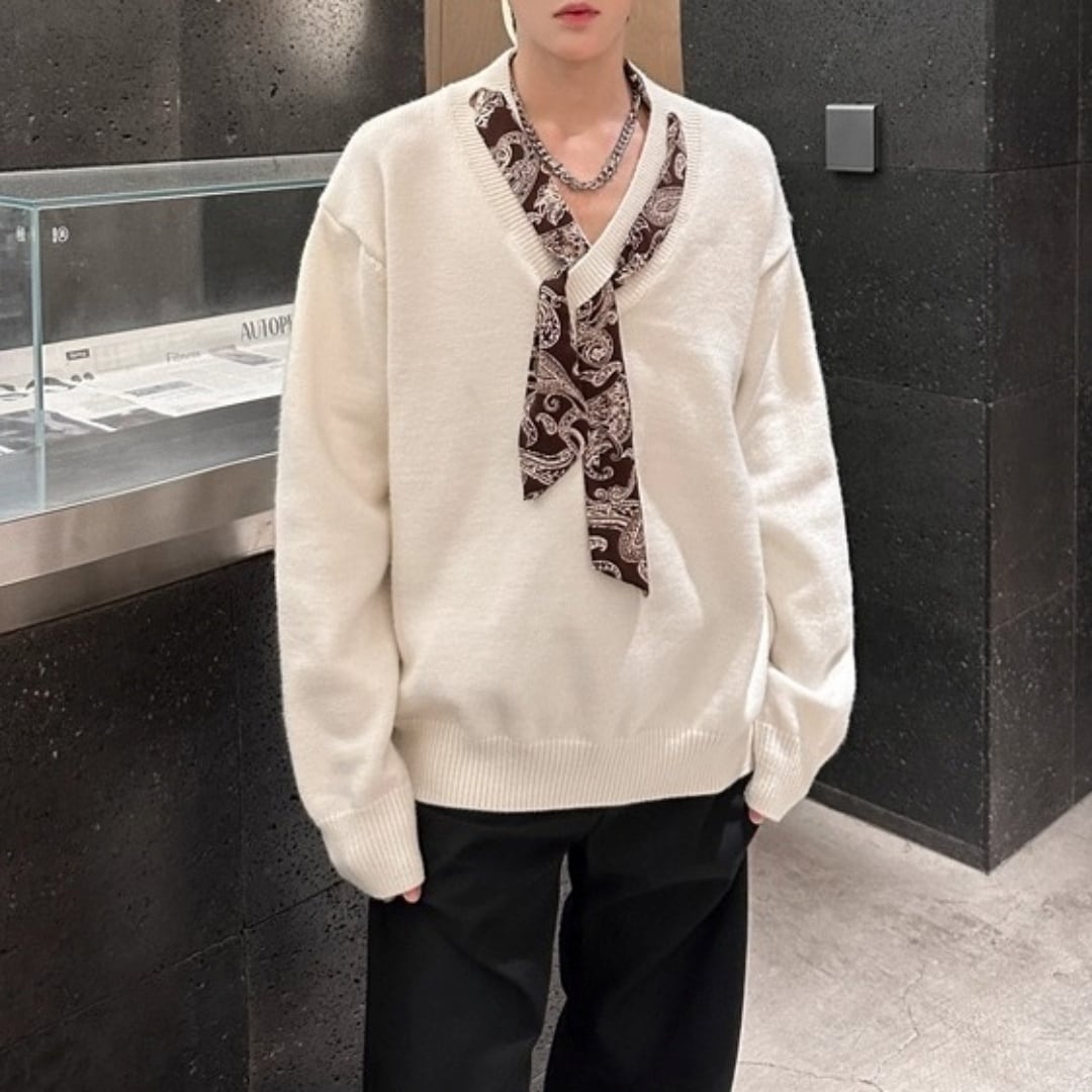 ペイズリー柄スカーフデザイン ルーズVネックニット 2カラー D12069