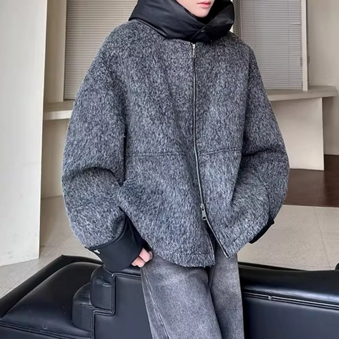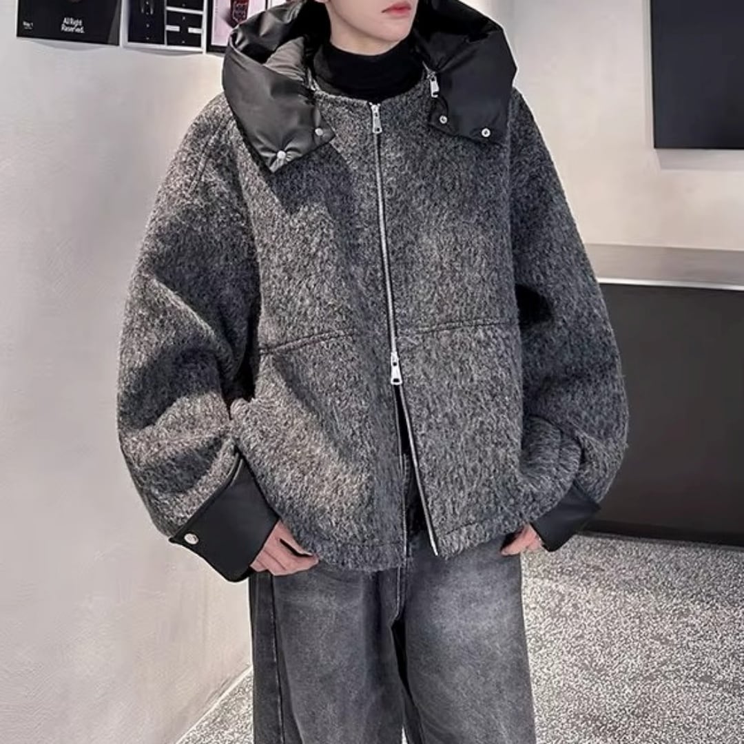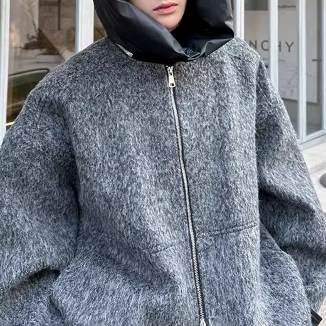 異素材コントラスト ブークレ調フード付きジップブルゾン D12107