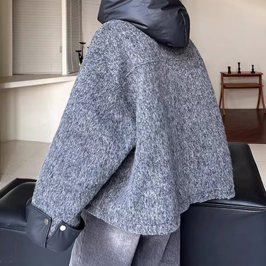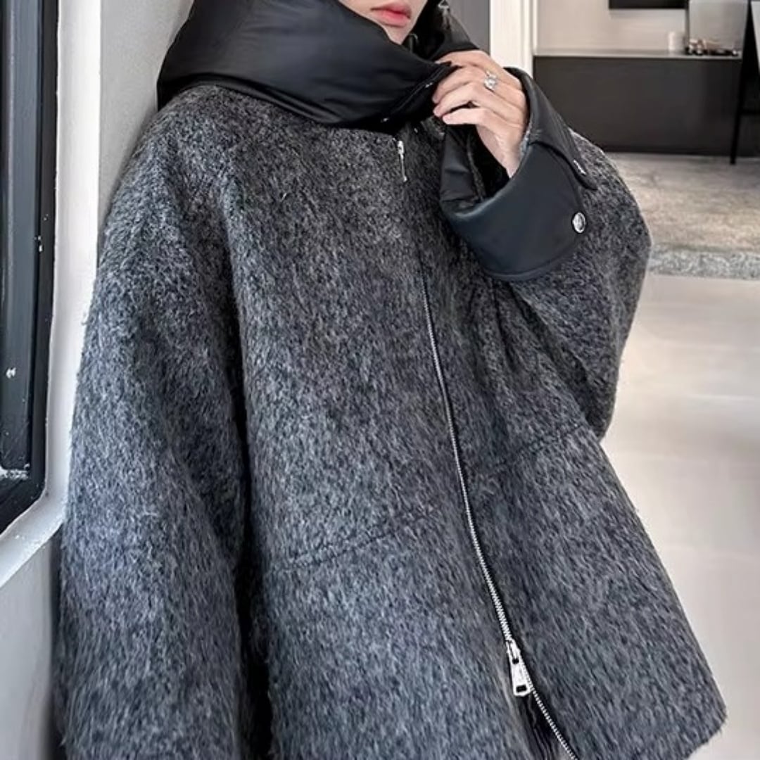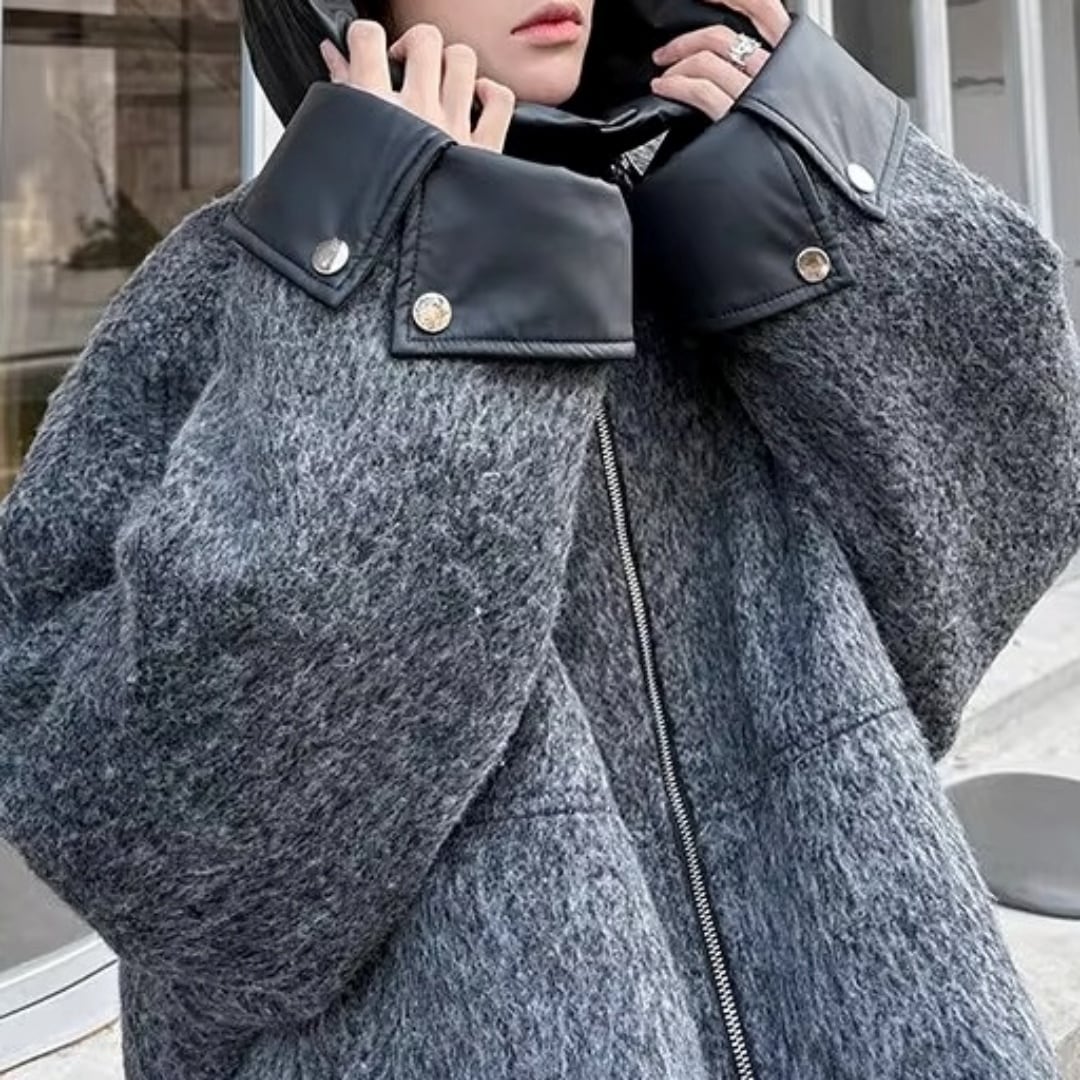 異素材コントラスト ブークレ調フード付きジップブルゾン D12107