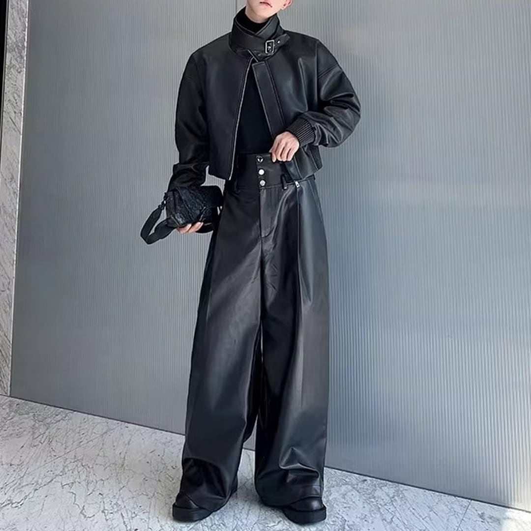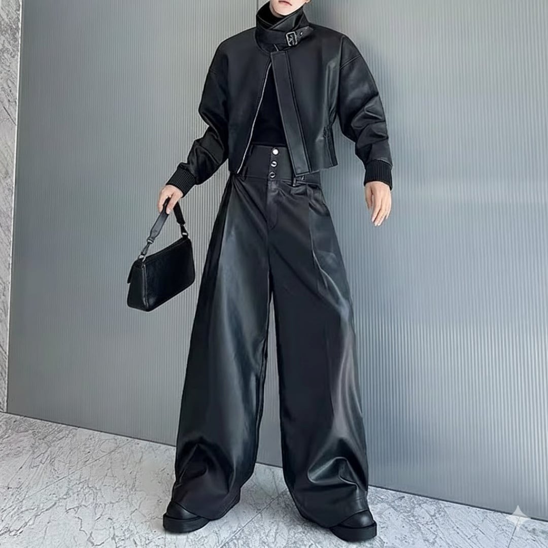 クロップドライダースジャケット&PUレザーワイドパンツ セットアップ D12121