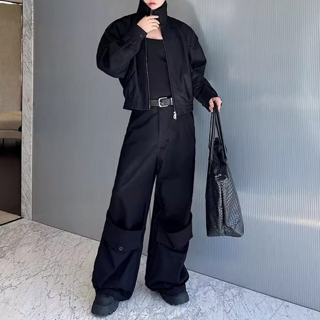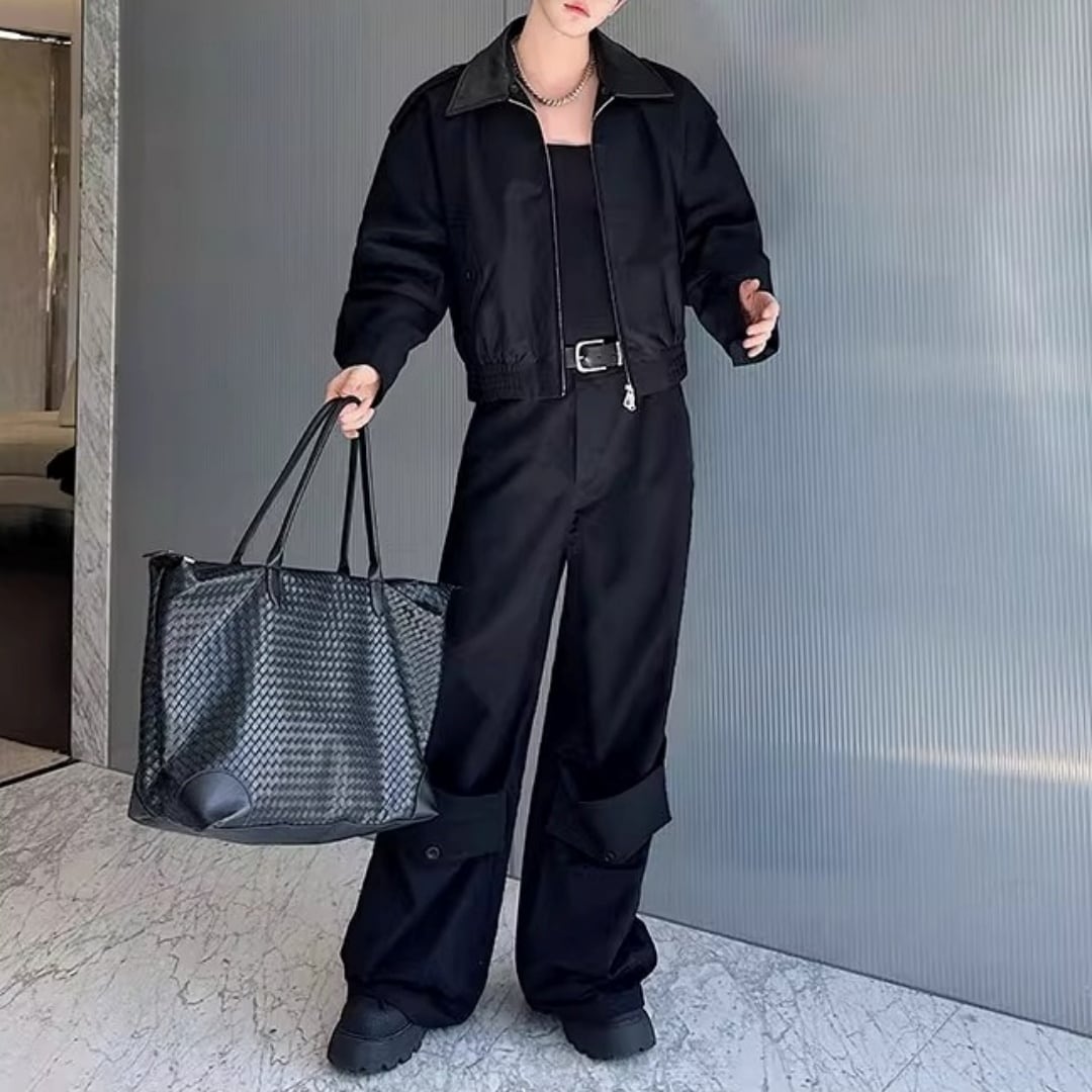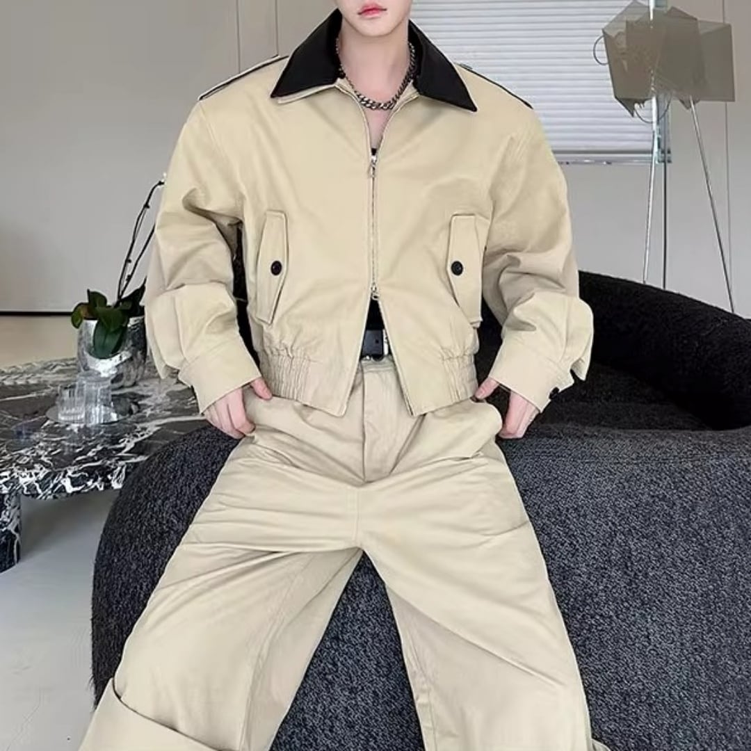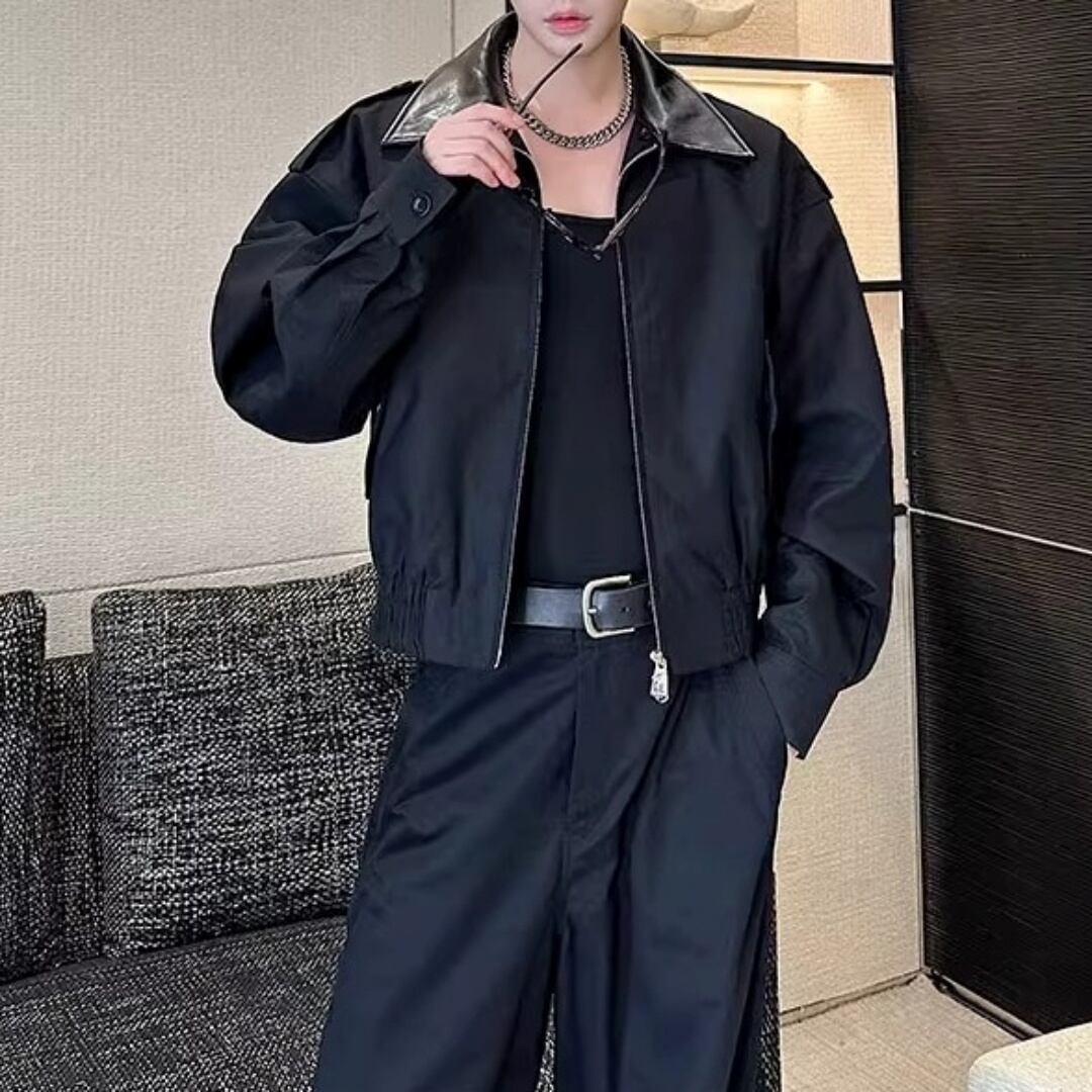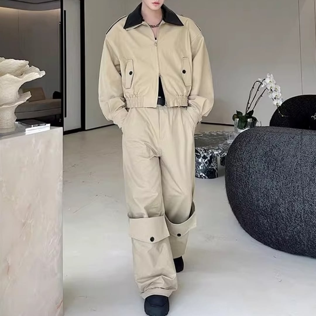 レザー切替 ショート丈ジャケット&ボリュームカーゴパンツセットアップ 2カラー D12122