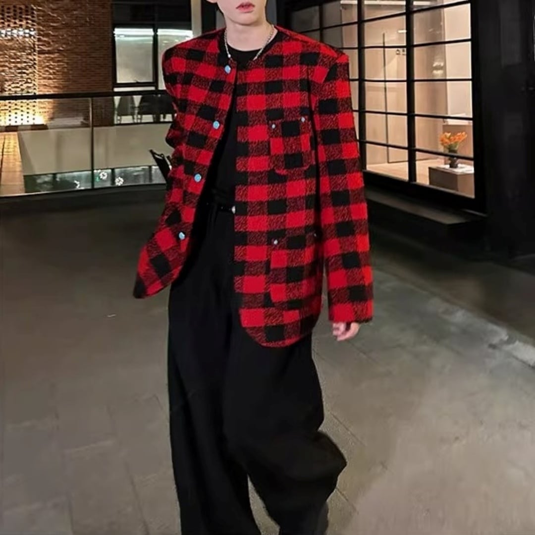 ターコイズボタン レトロチェックノーカラージャケット D12141