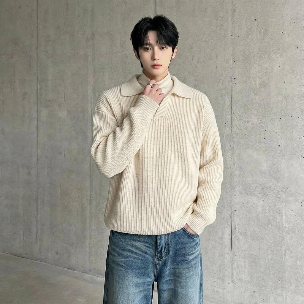 ルーズフィット リブ編みポロニット 2カラー D12165