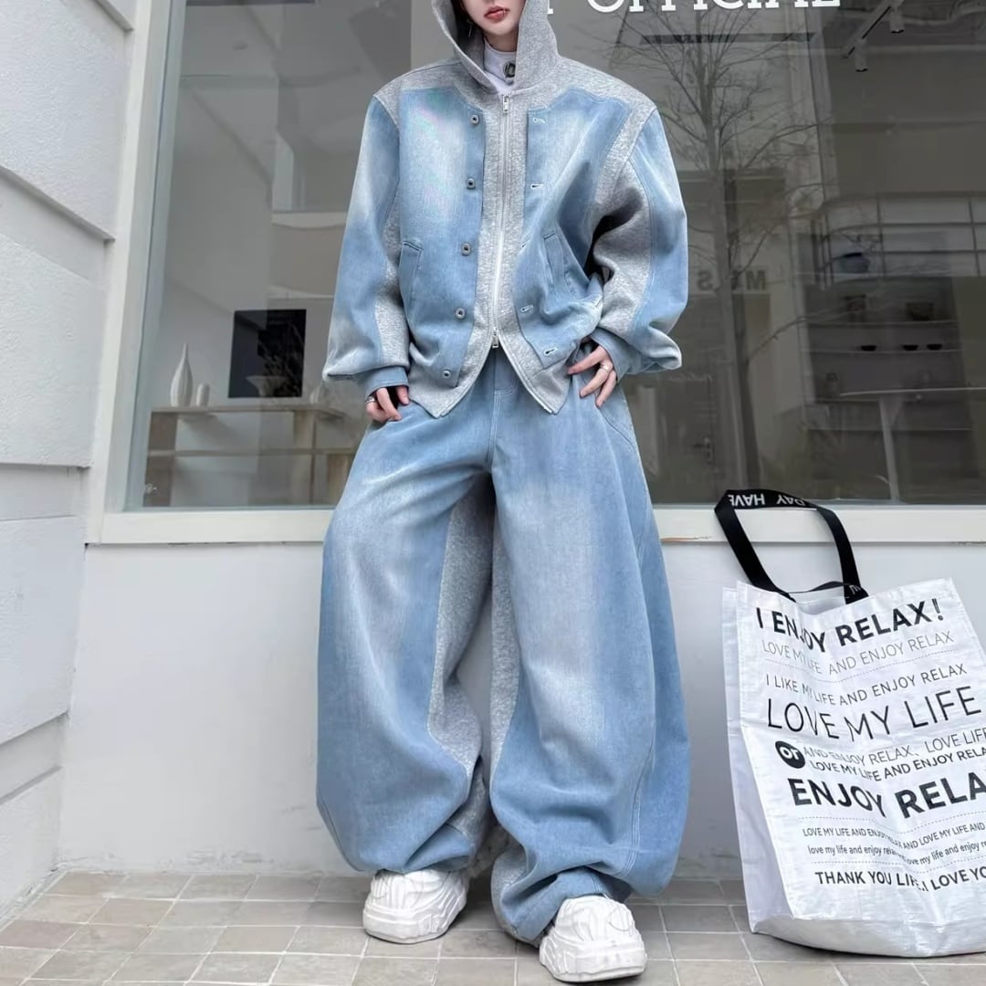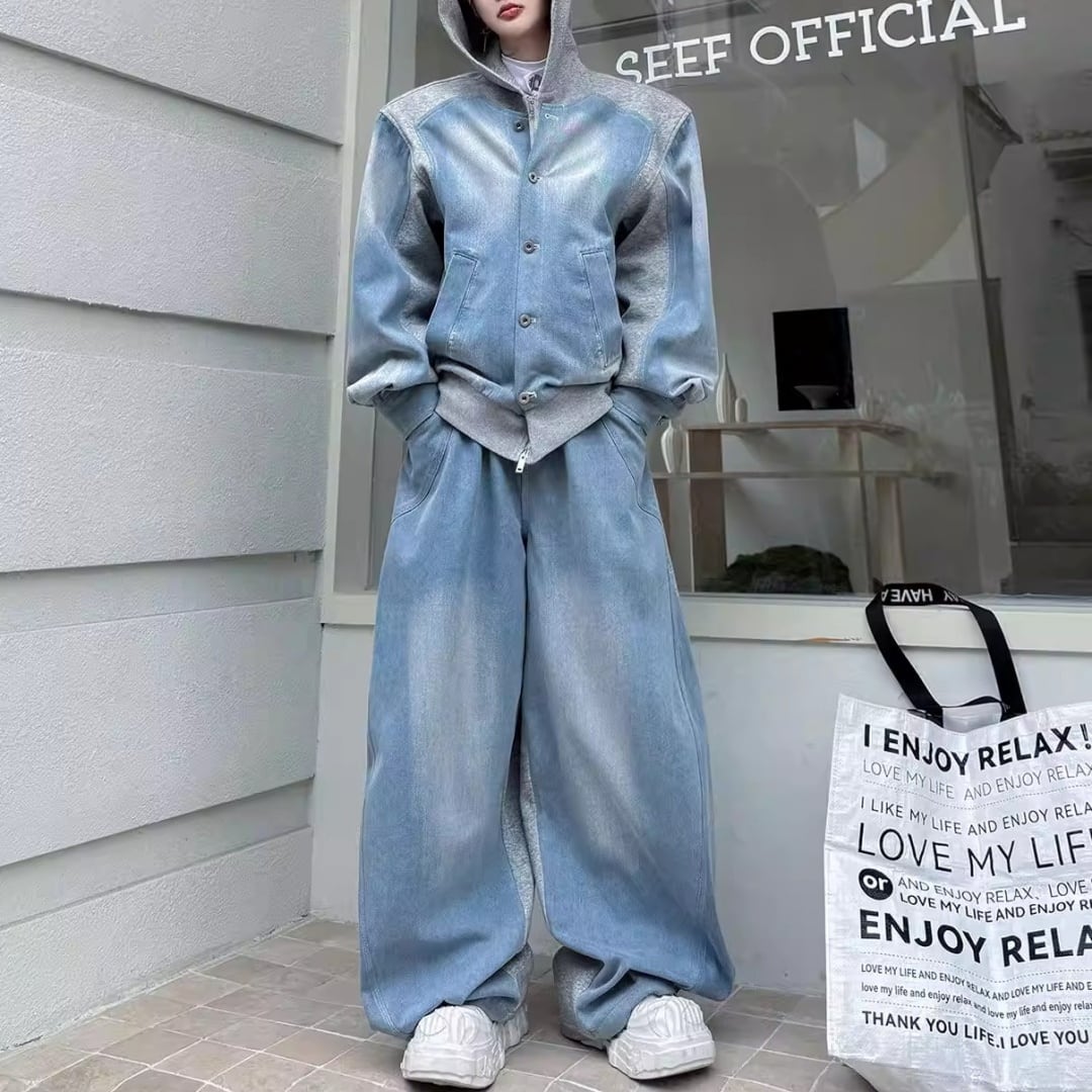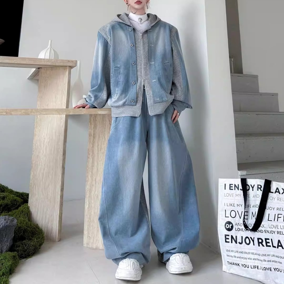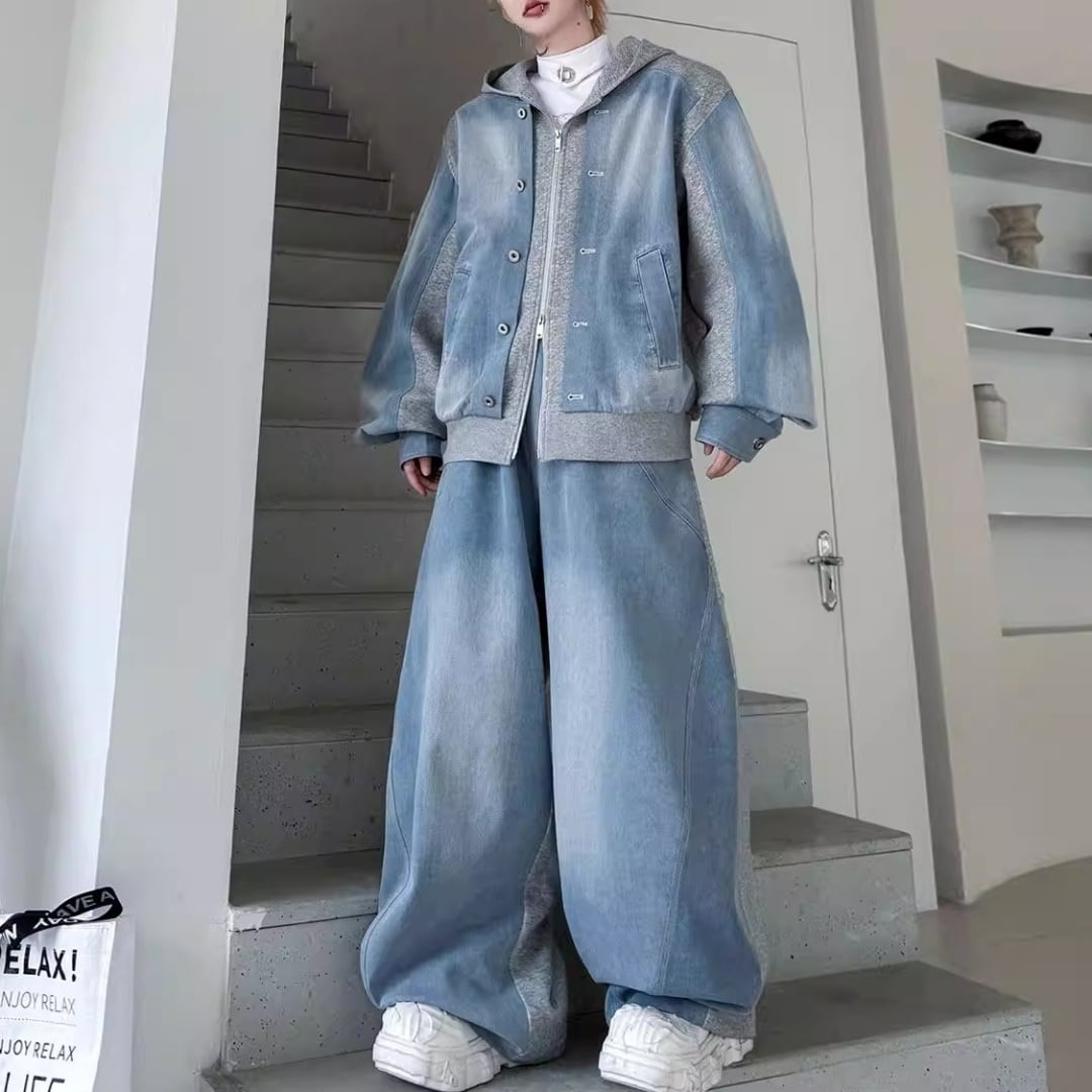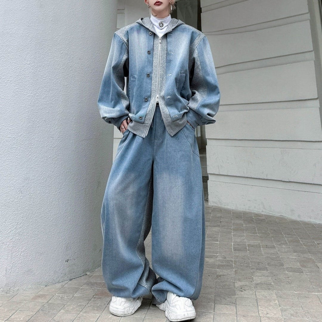 フェード加工 切替デニムフーディー&ワイドパンツセットアップ 2カラー D12213