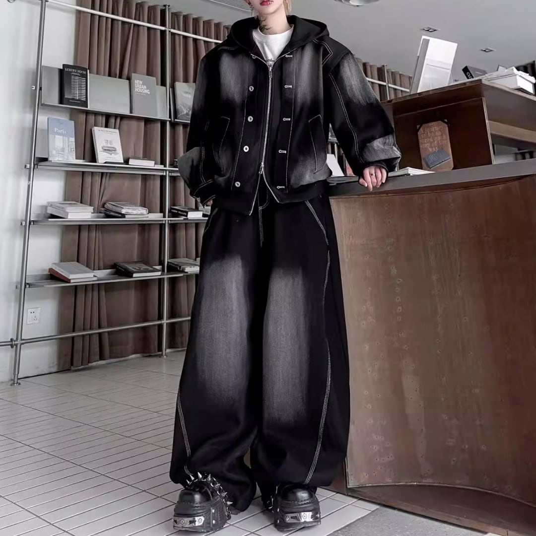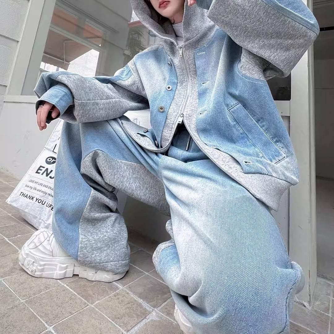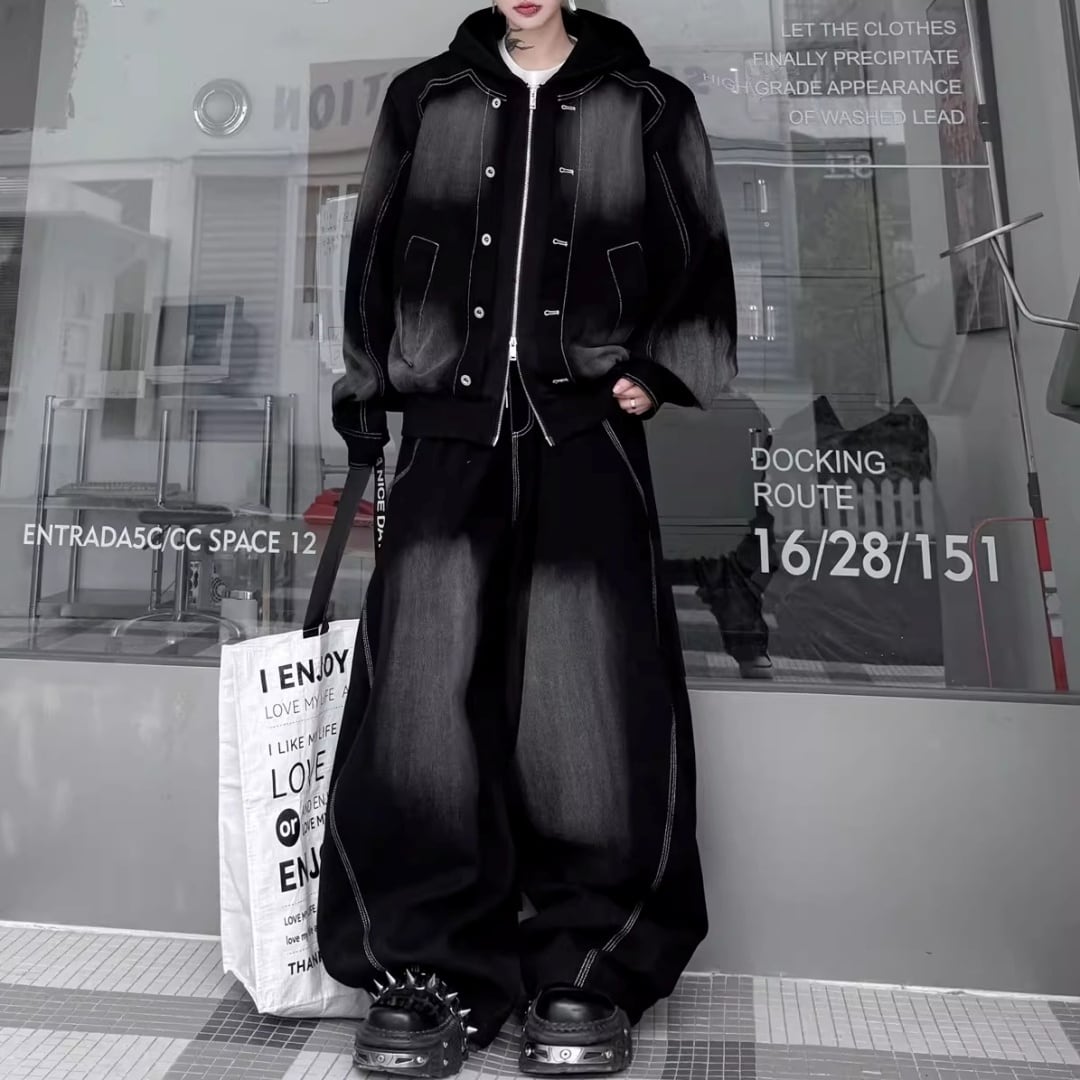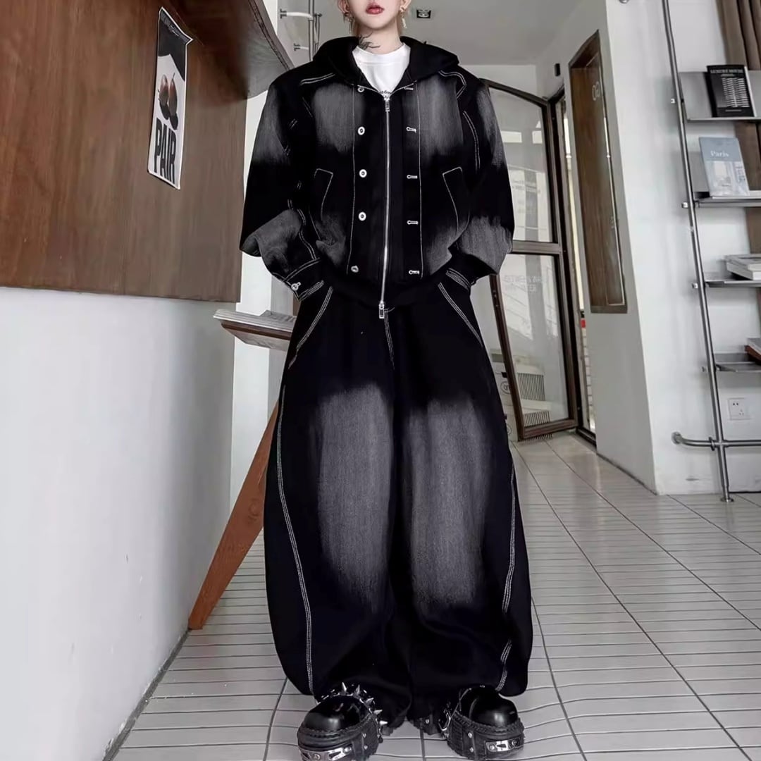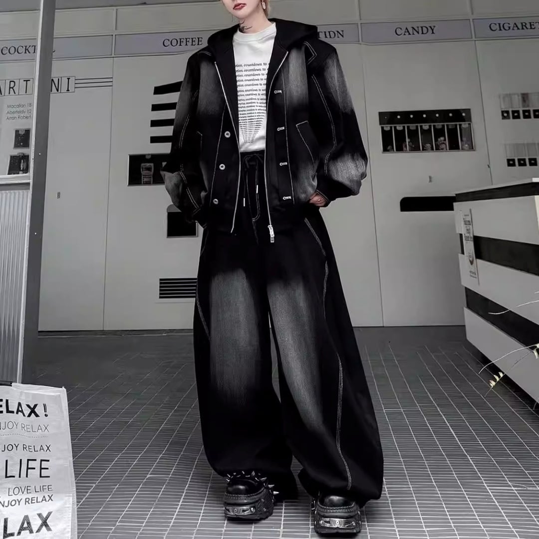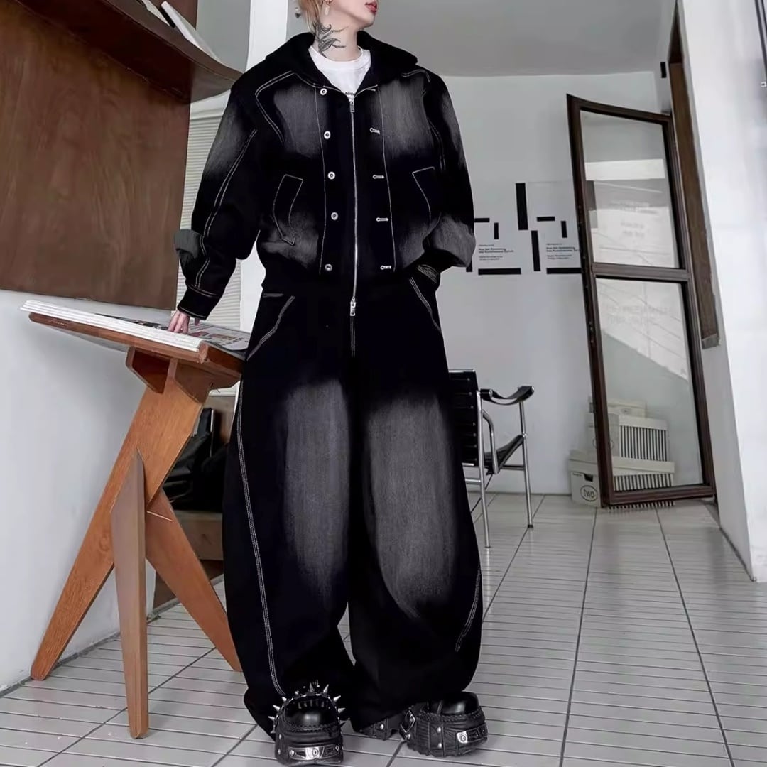フェード加工 切替デニムフーディー&ワイドパンツセットアップ 2カラー D12213