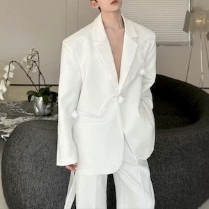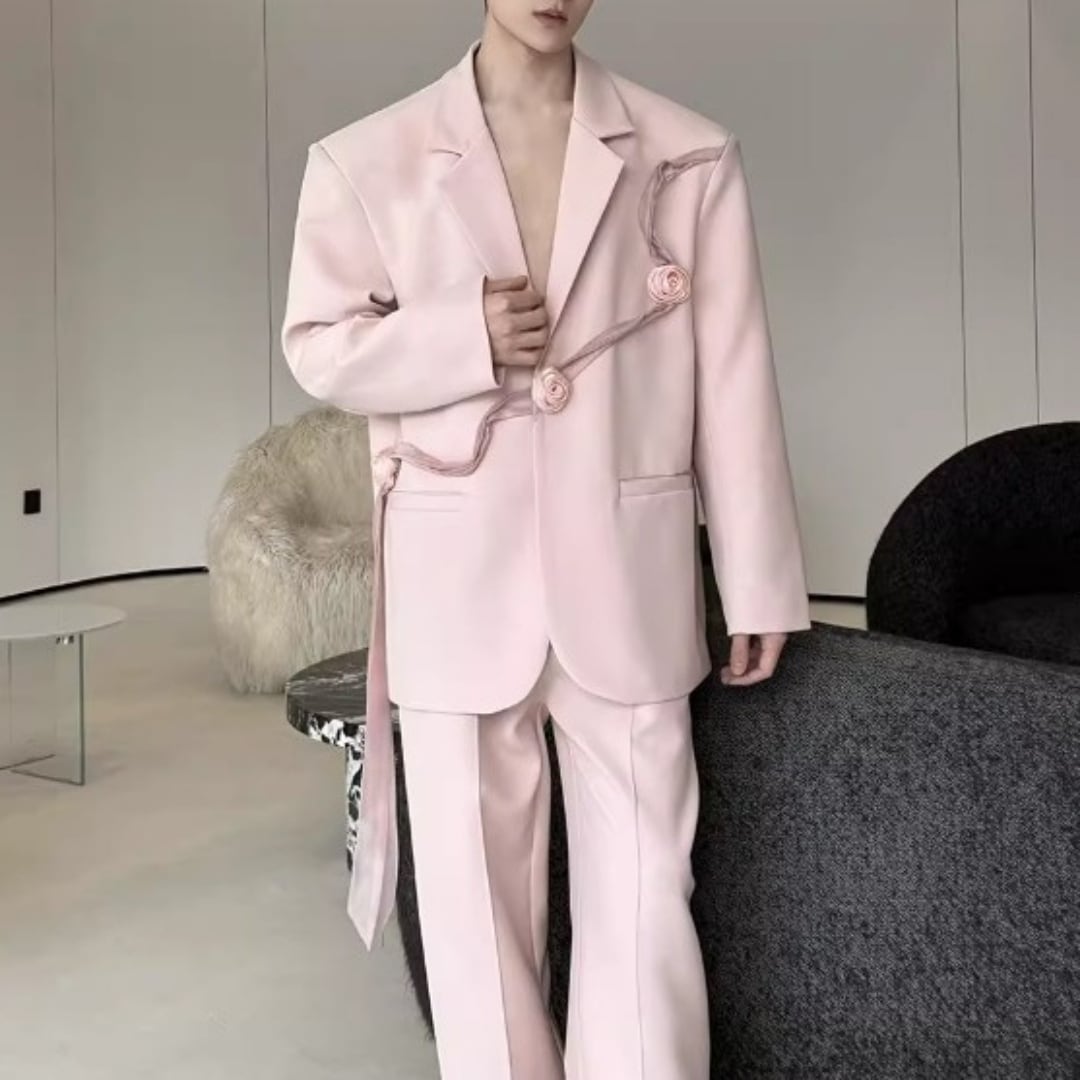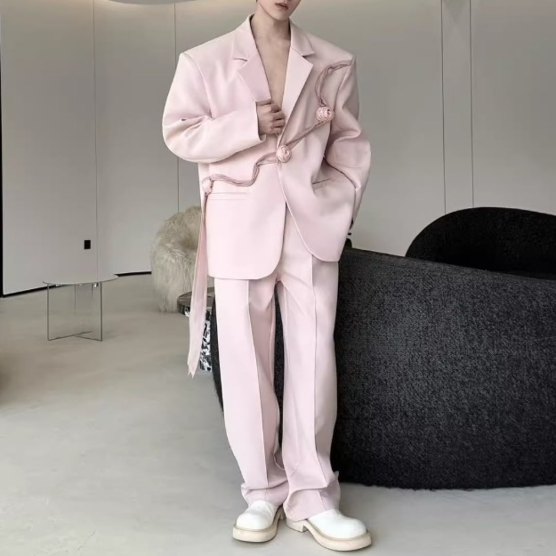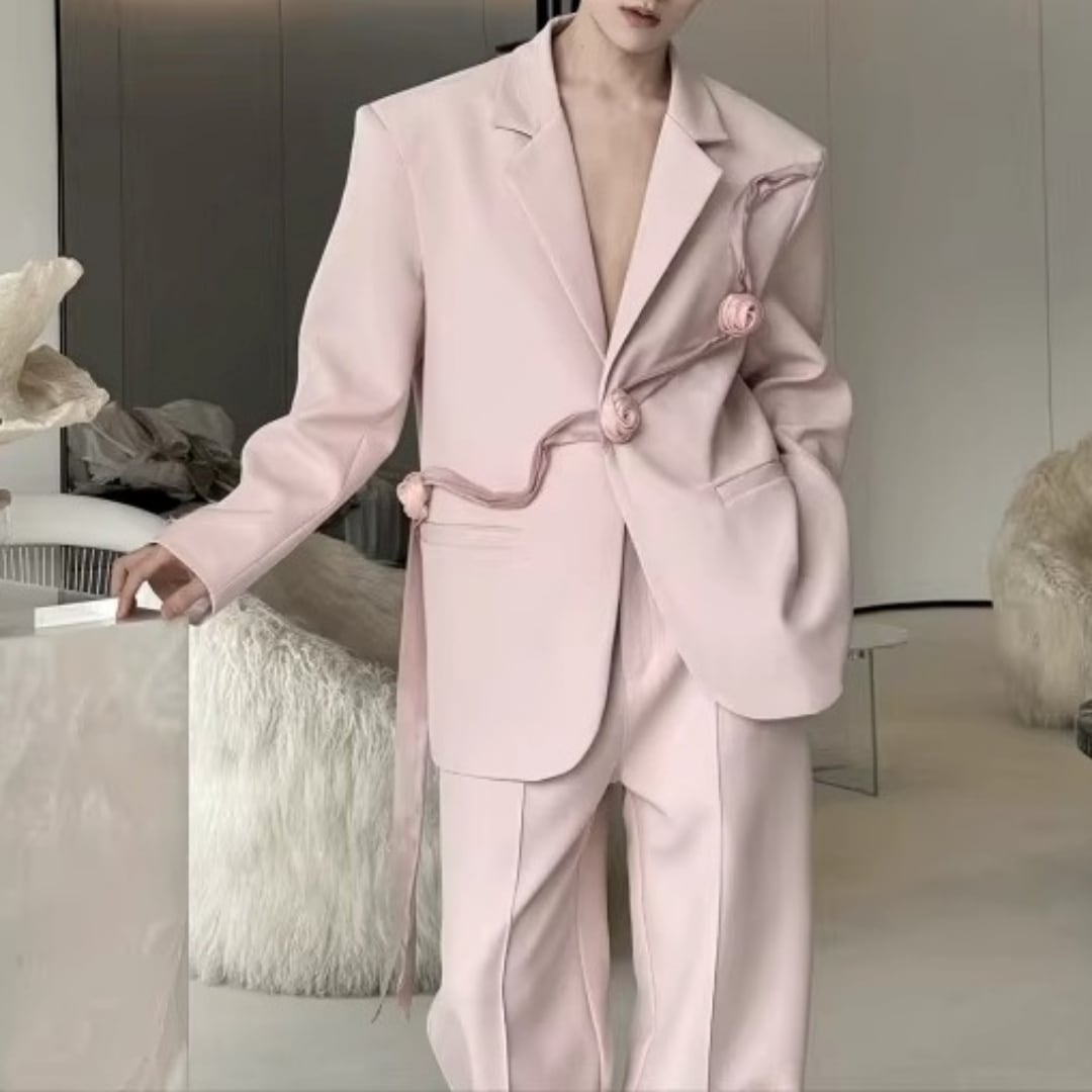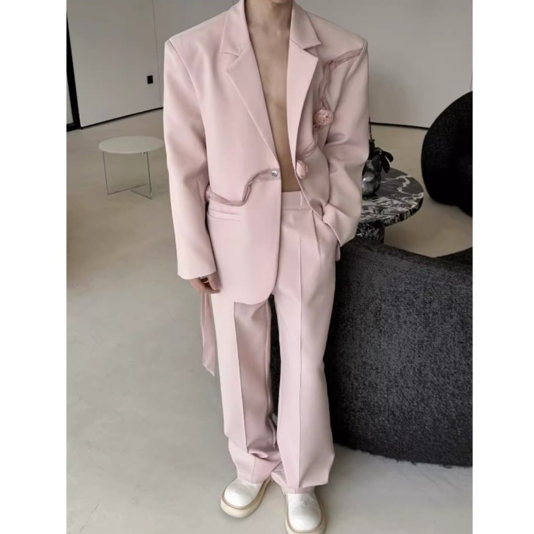 リボンコサージュアクセント オーバーサイズスーツセットアップ 2カラー D12258
