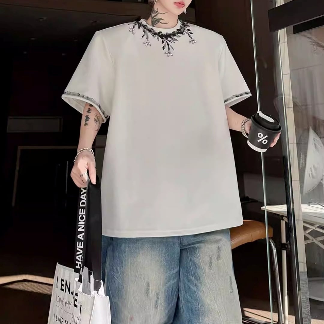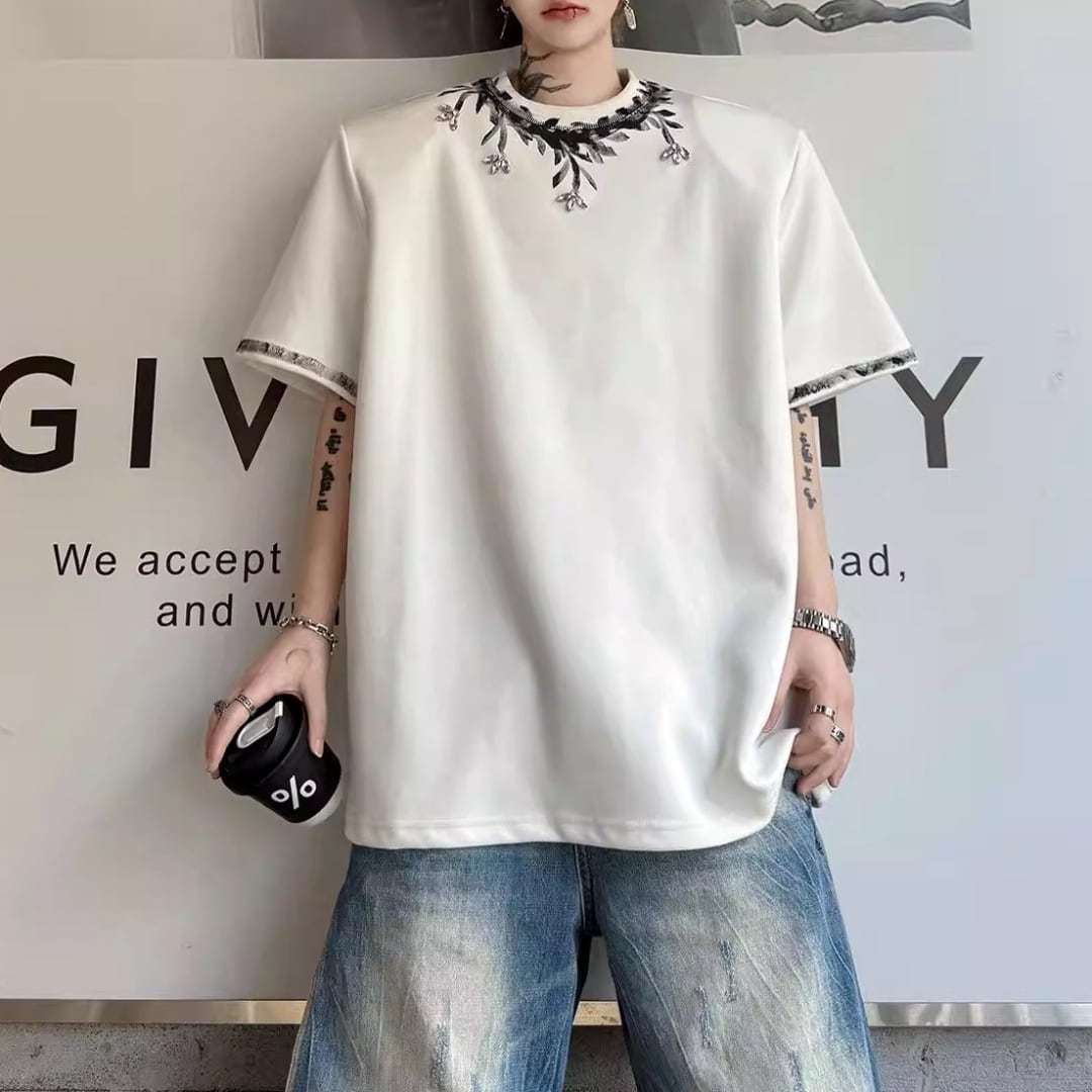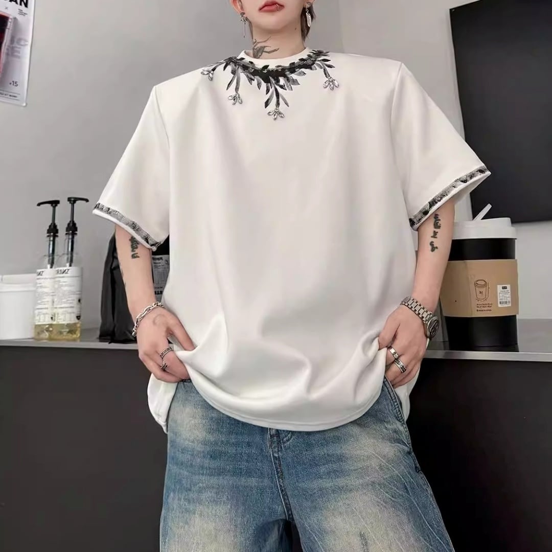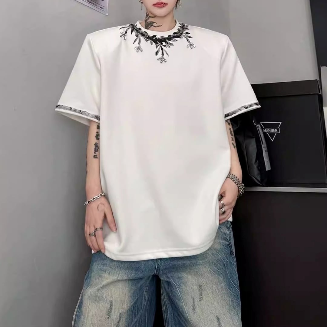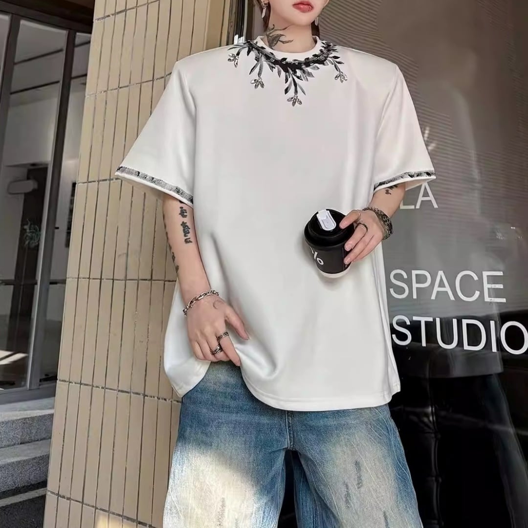 ビーズ装飾 ネックレスモチーフスプレープリントTシャツ 2カラー D12275