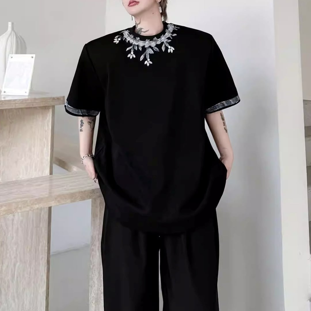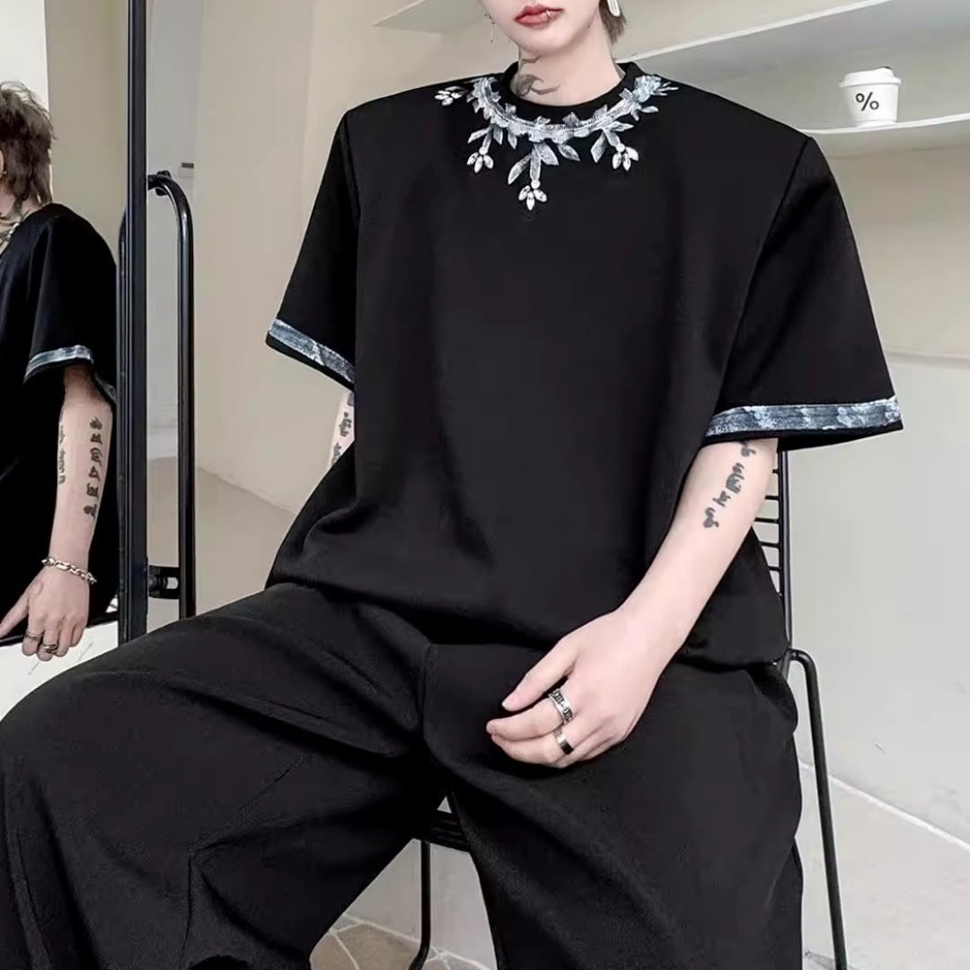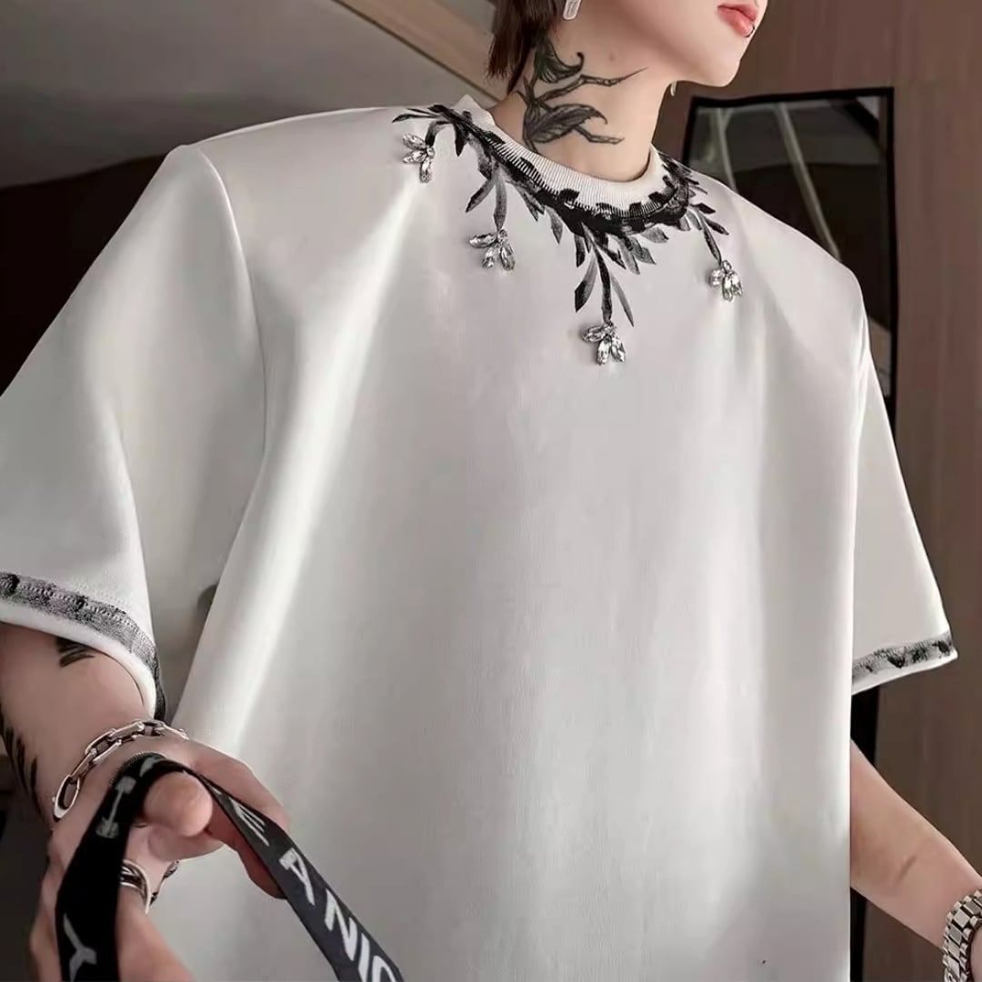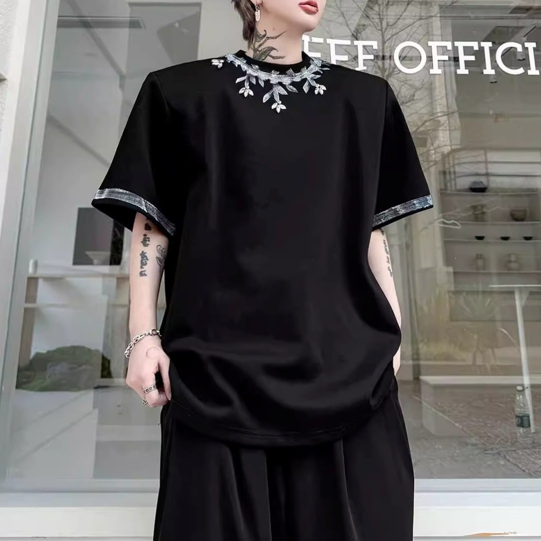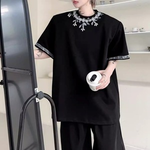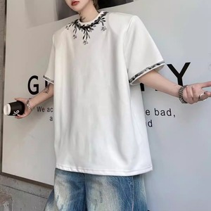 ビーズ装飾 ネックレスモチーフスプレープリントTシャツ 2カラー D12275