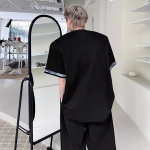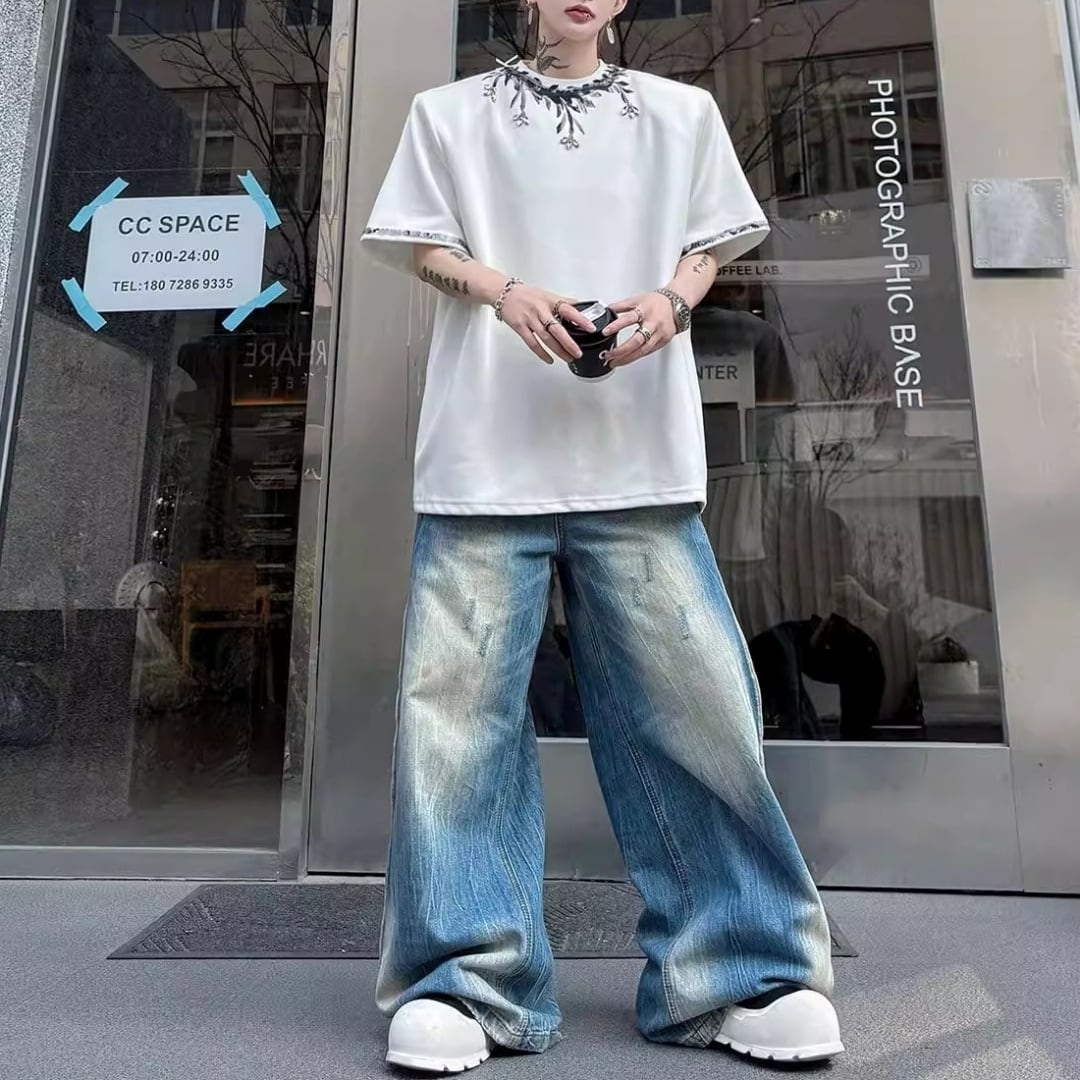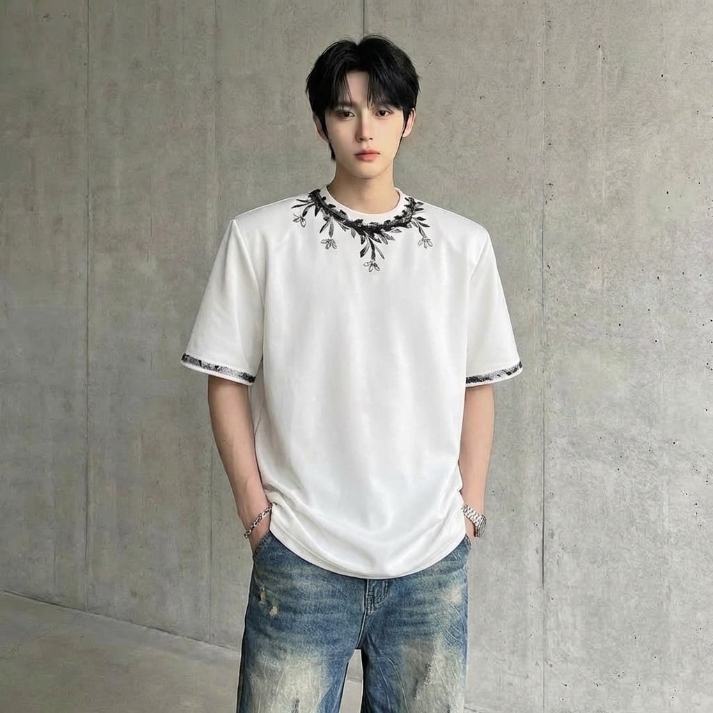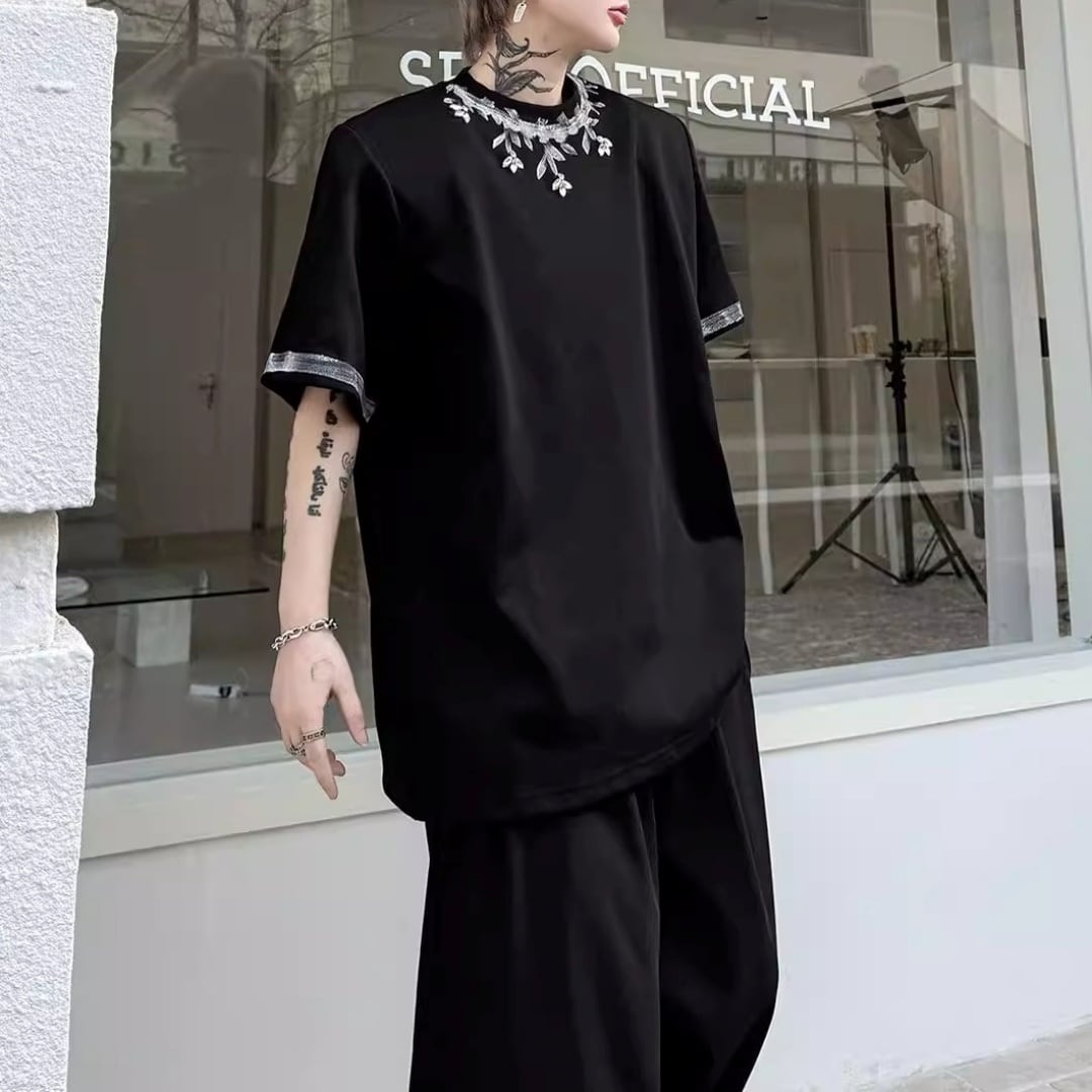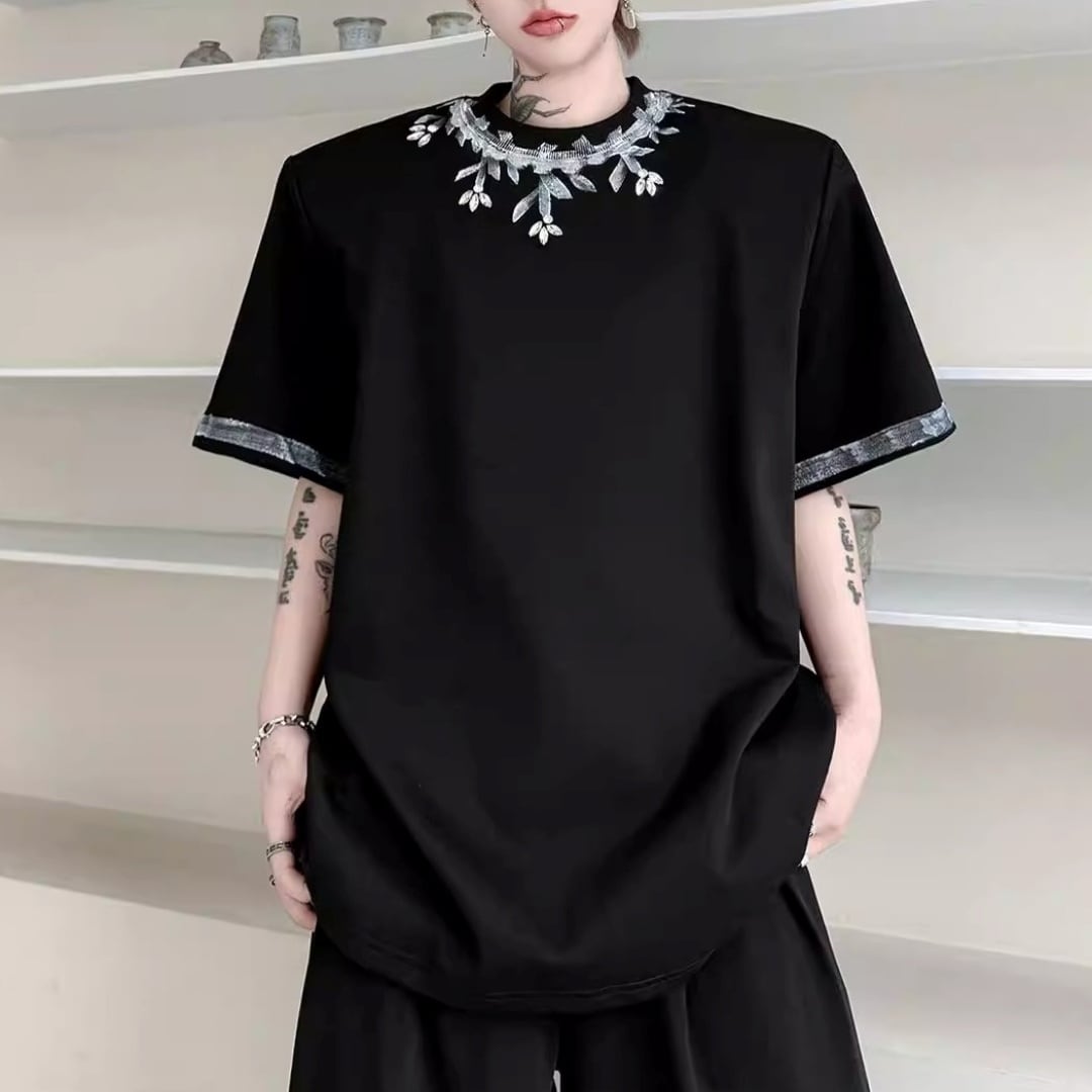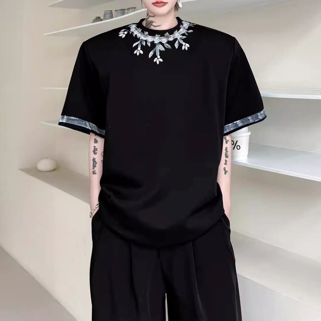 ビーズ装飾 ネックレスモチーフスプレープリントTシャツ 2カラー D12275