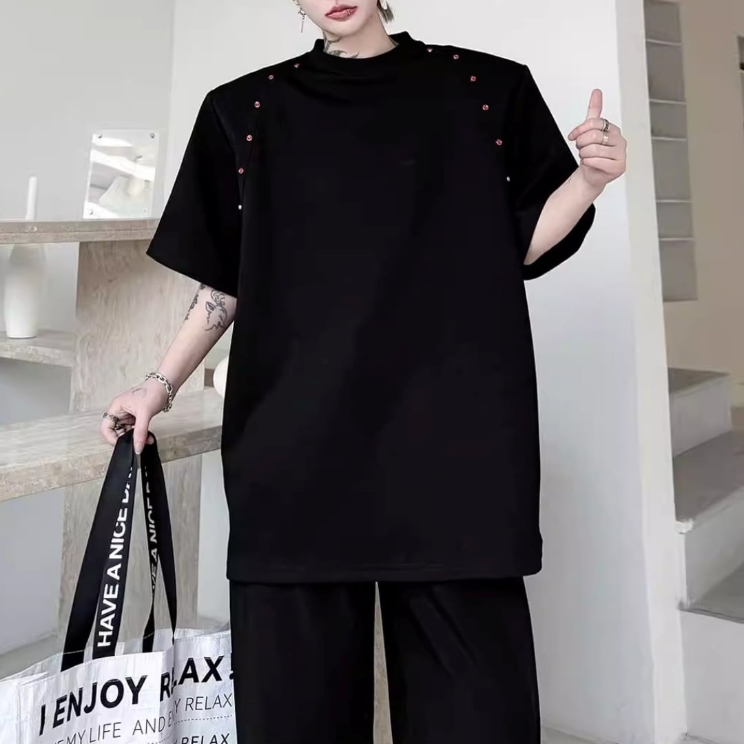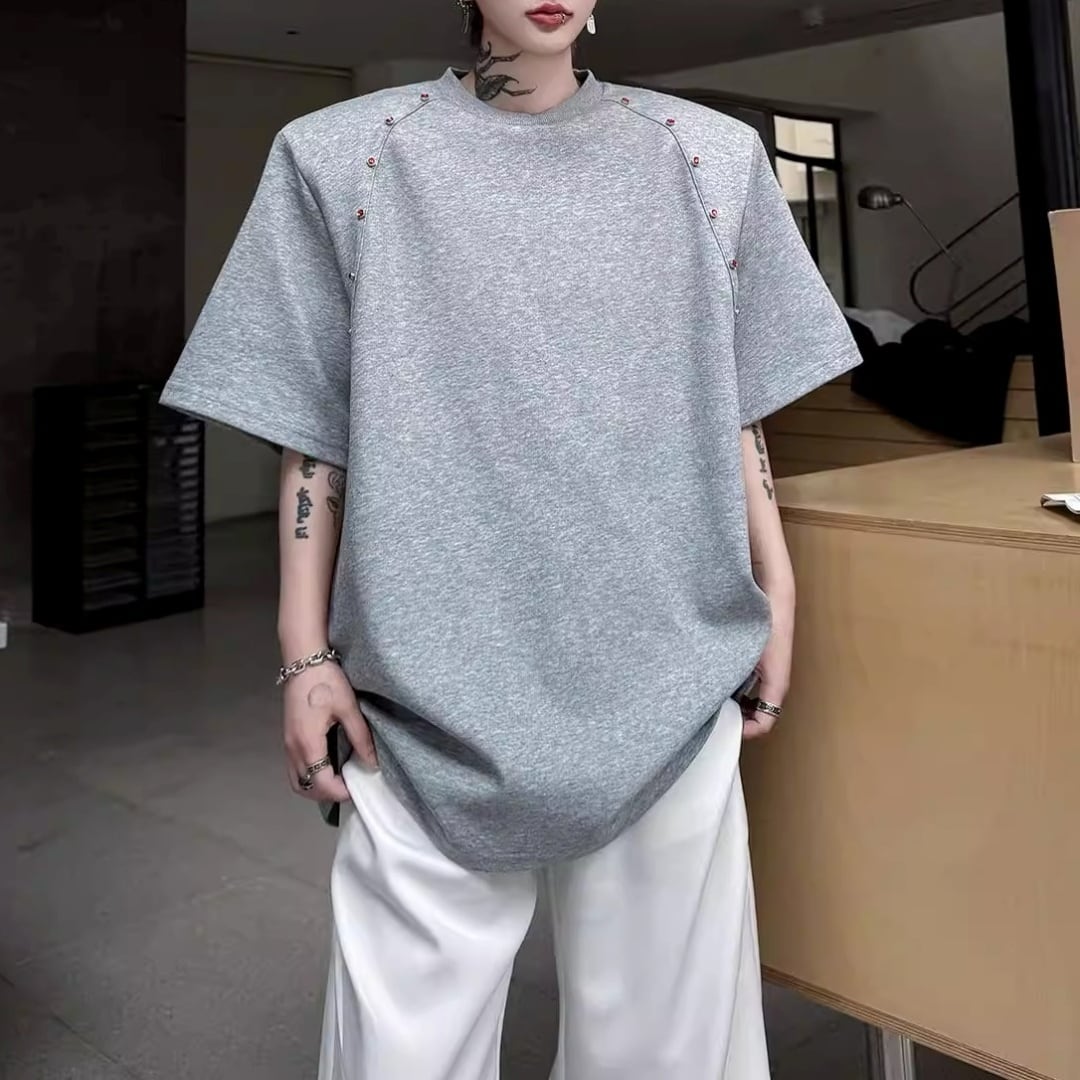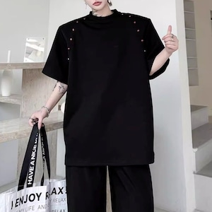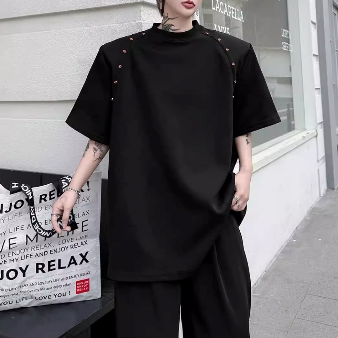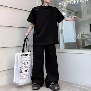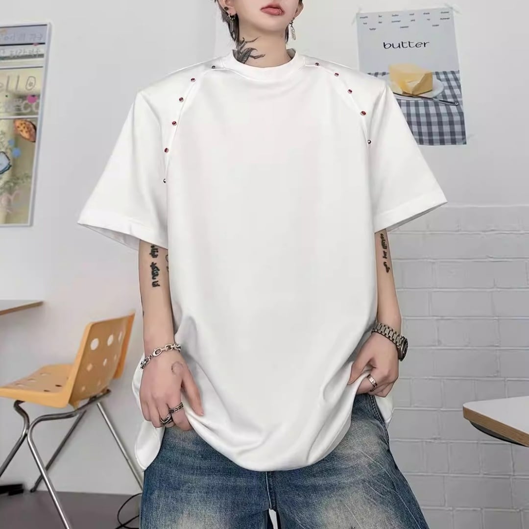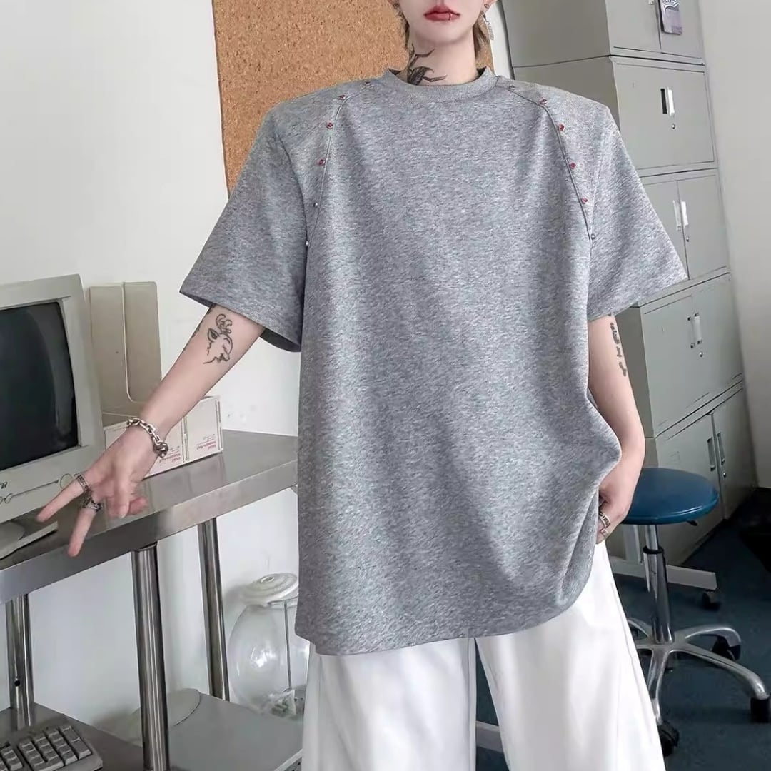 ビーズライン装飾 ワイドクルーネックTシャツ 3カラー D12283