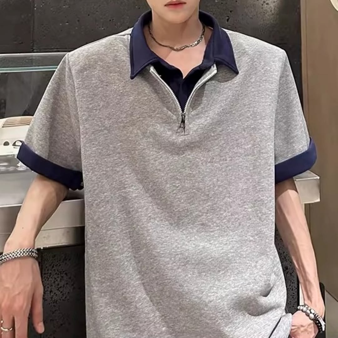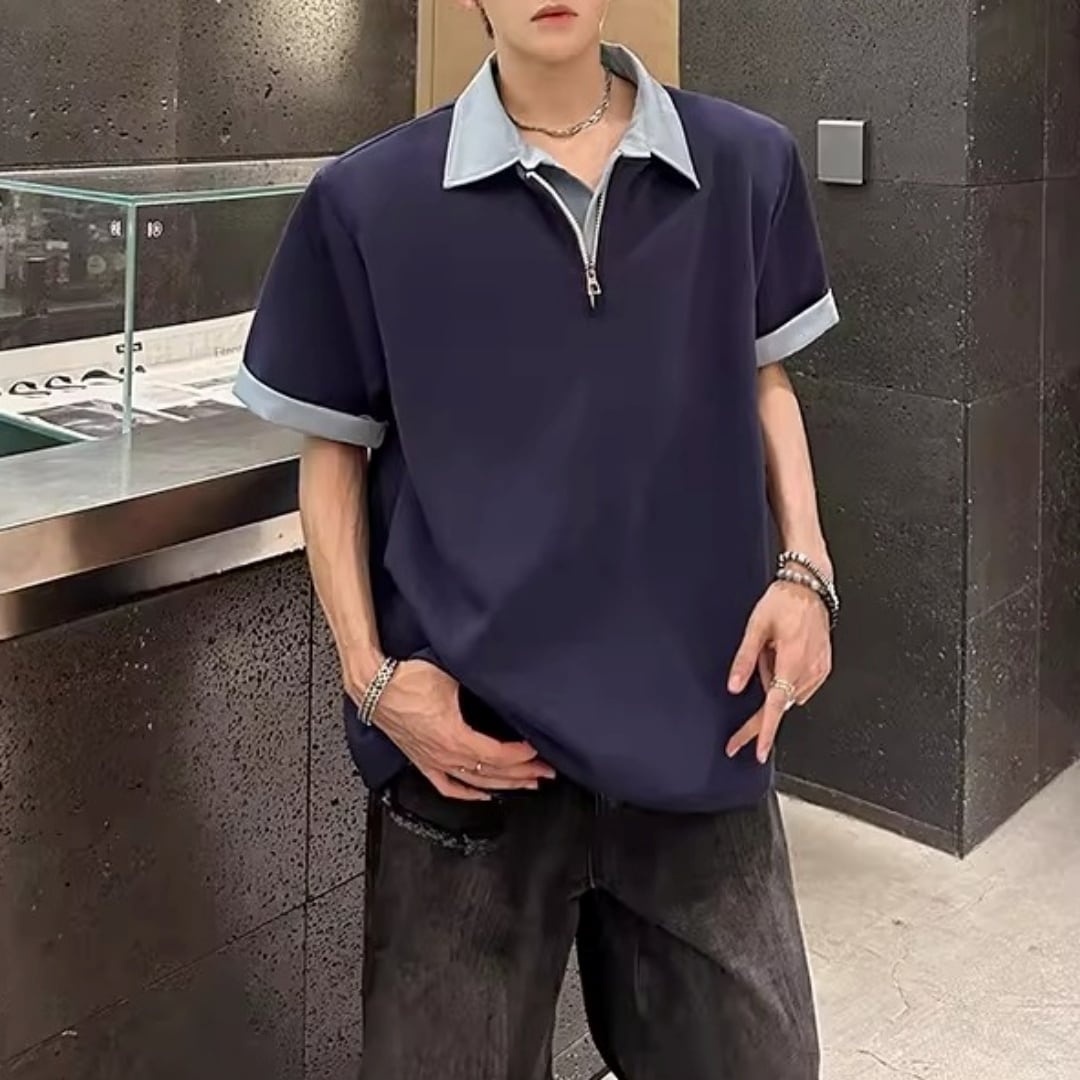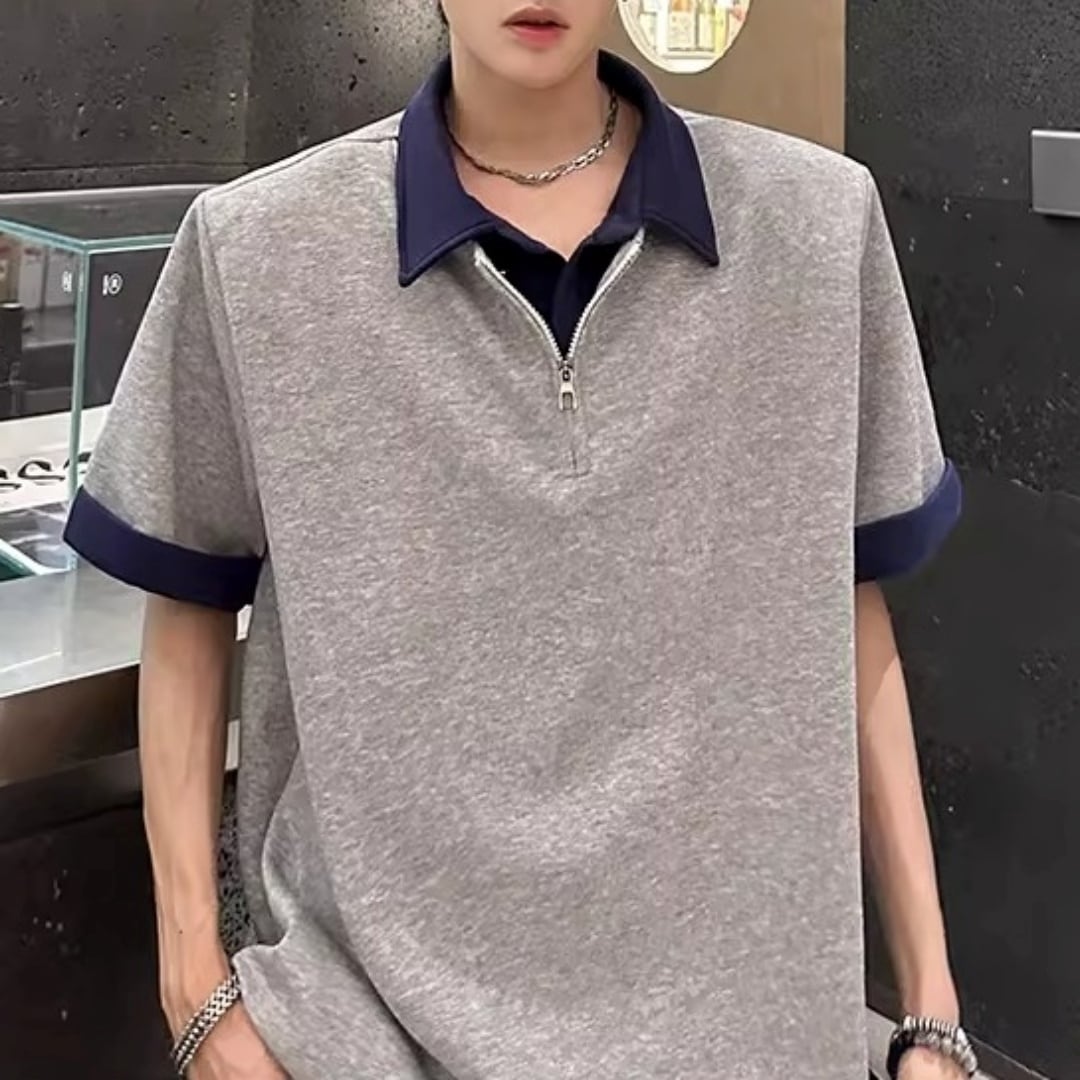 レイヤードカラー ハーフジップルーズポロシャツ 2カラー D12302