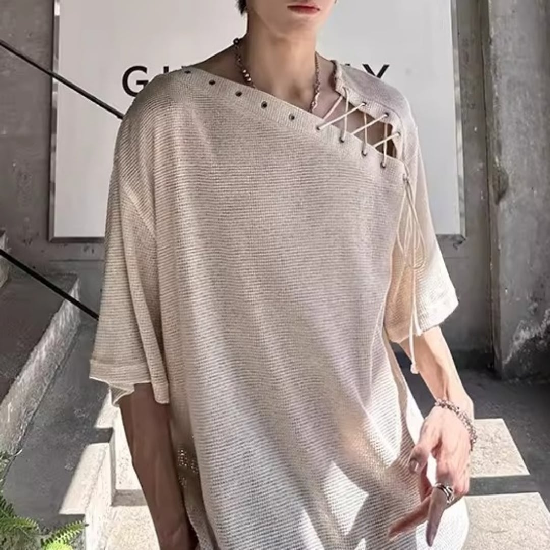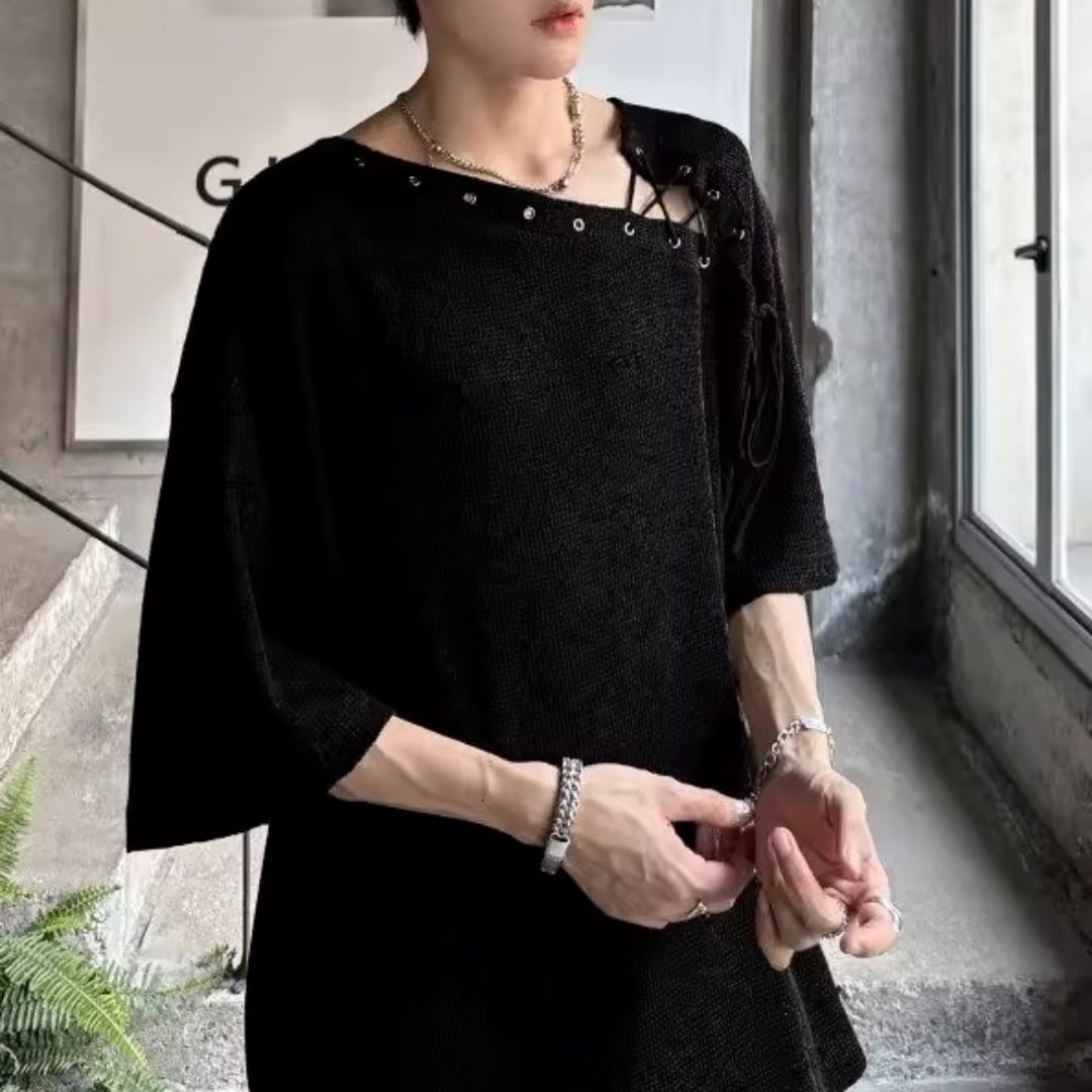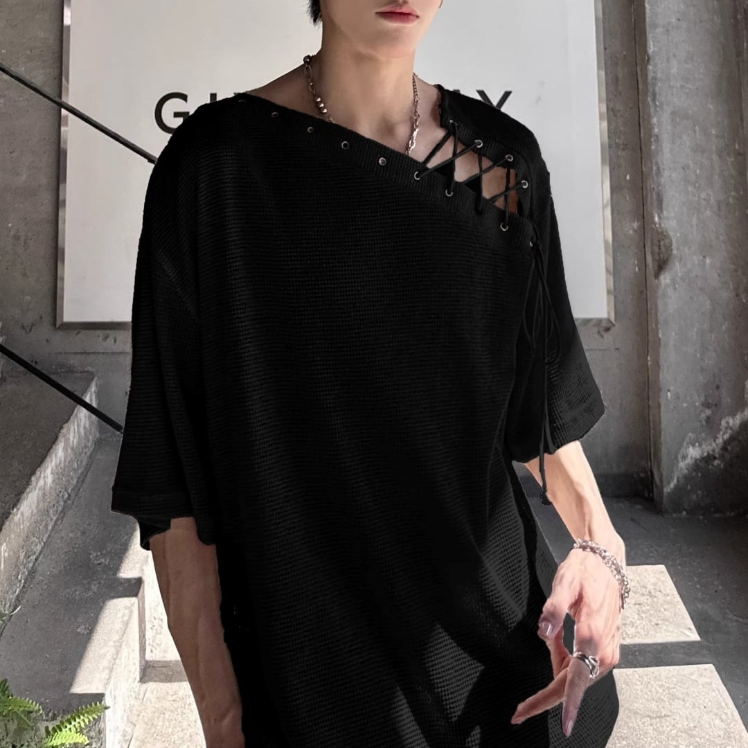 アシンメトリーレースアップ デザインルーズTシャツ 3カラー D12308