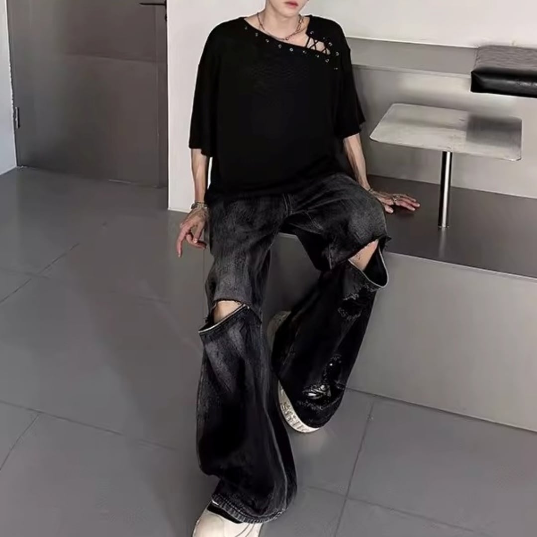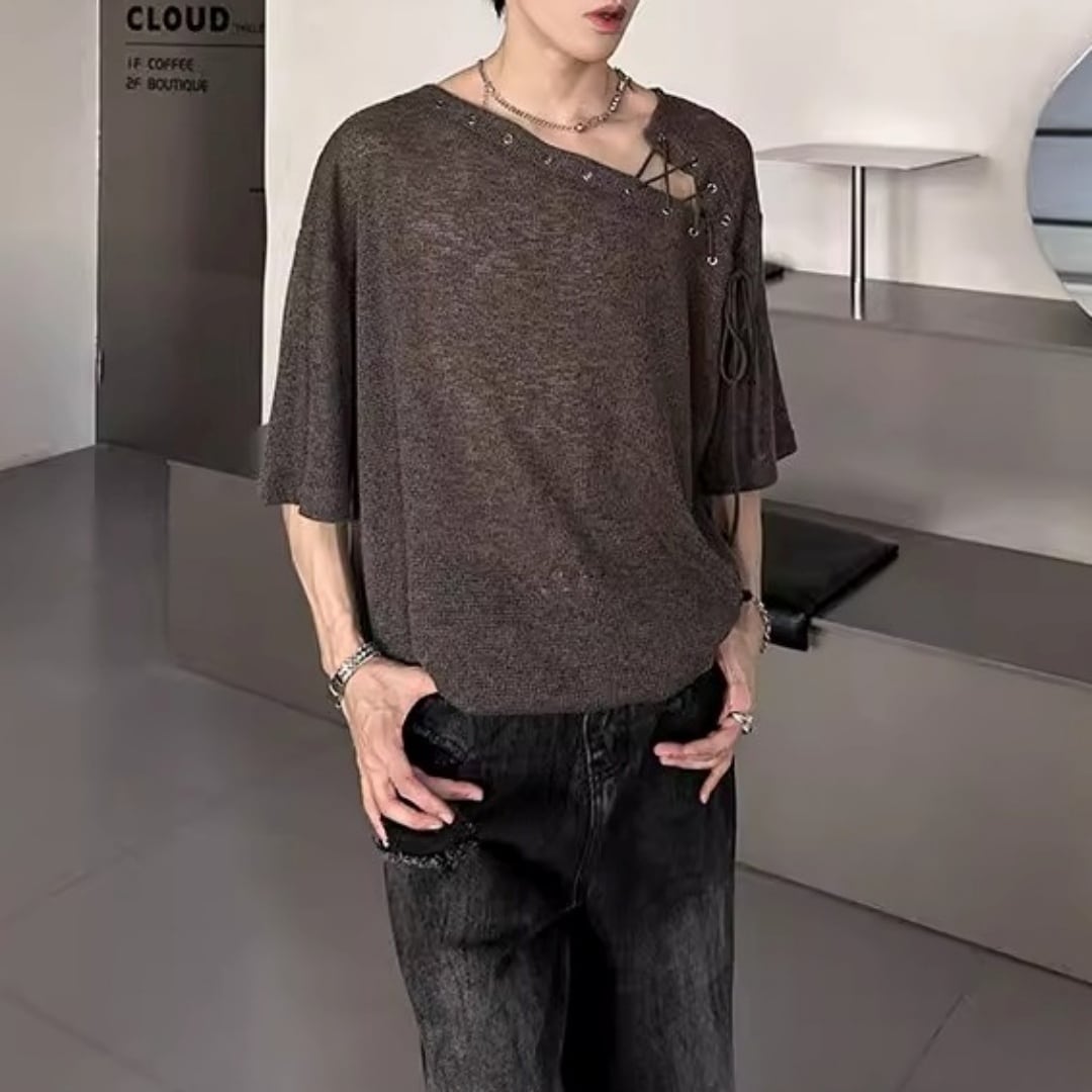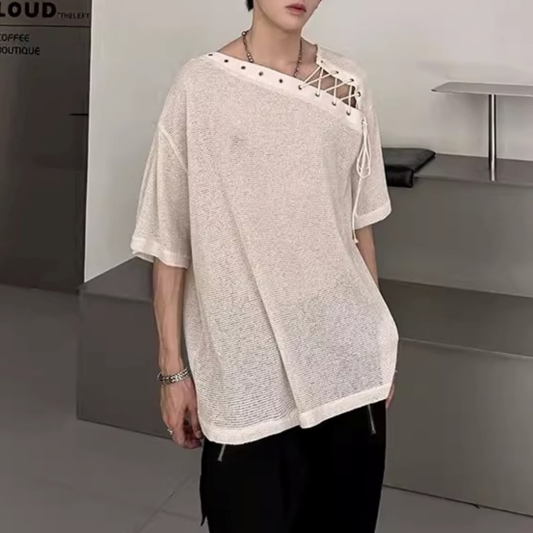 アシンメトリーレースアップ デザインルーズTシャツ 3カラー D12308