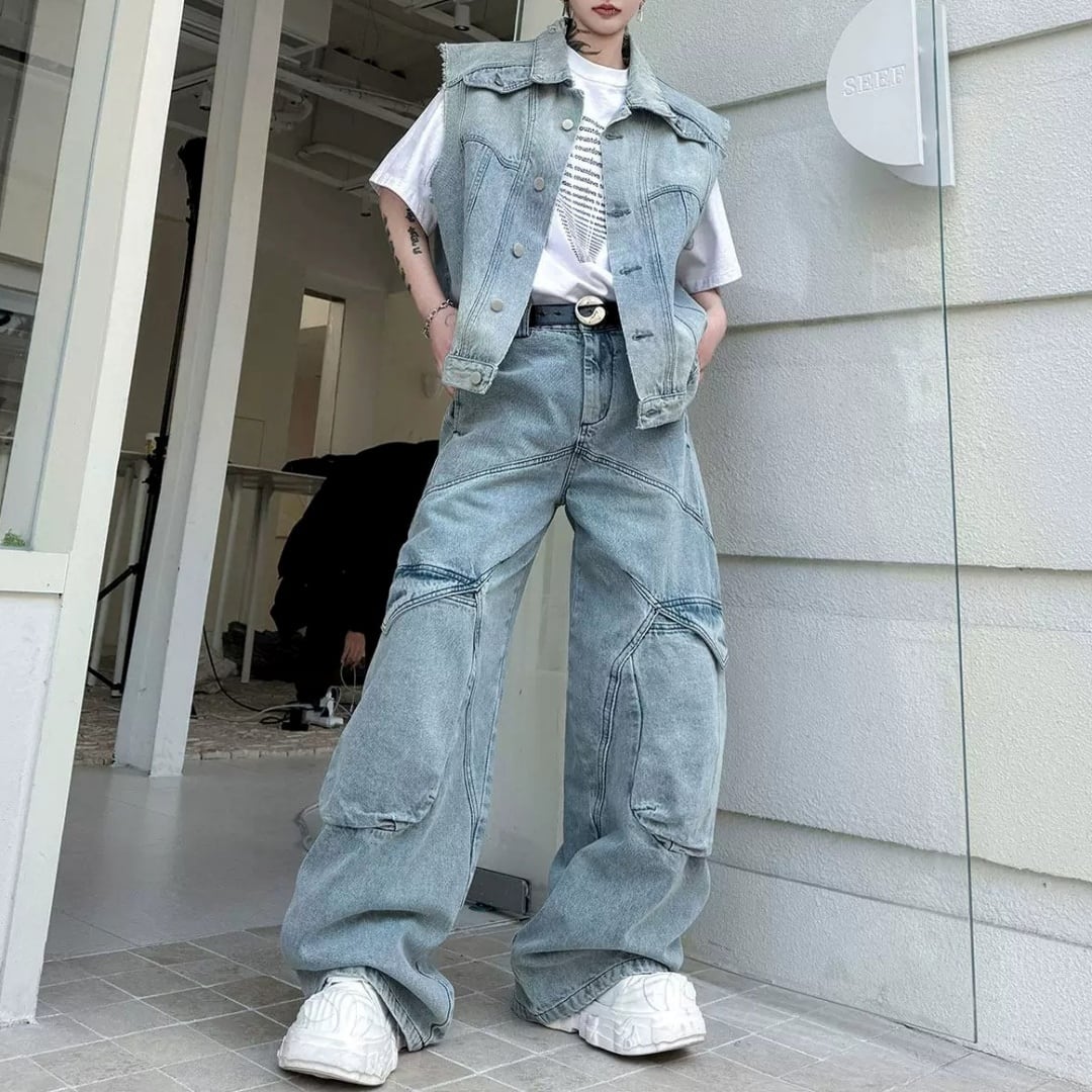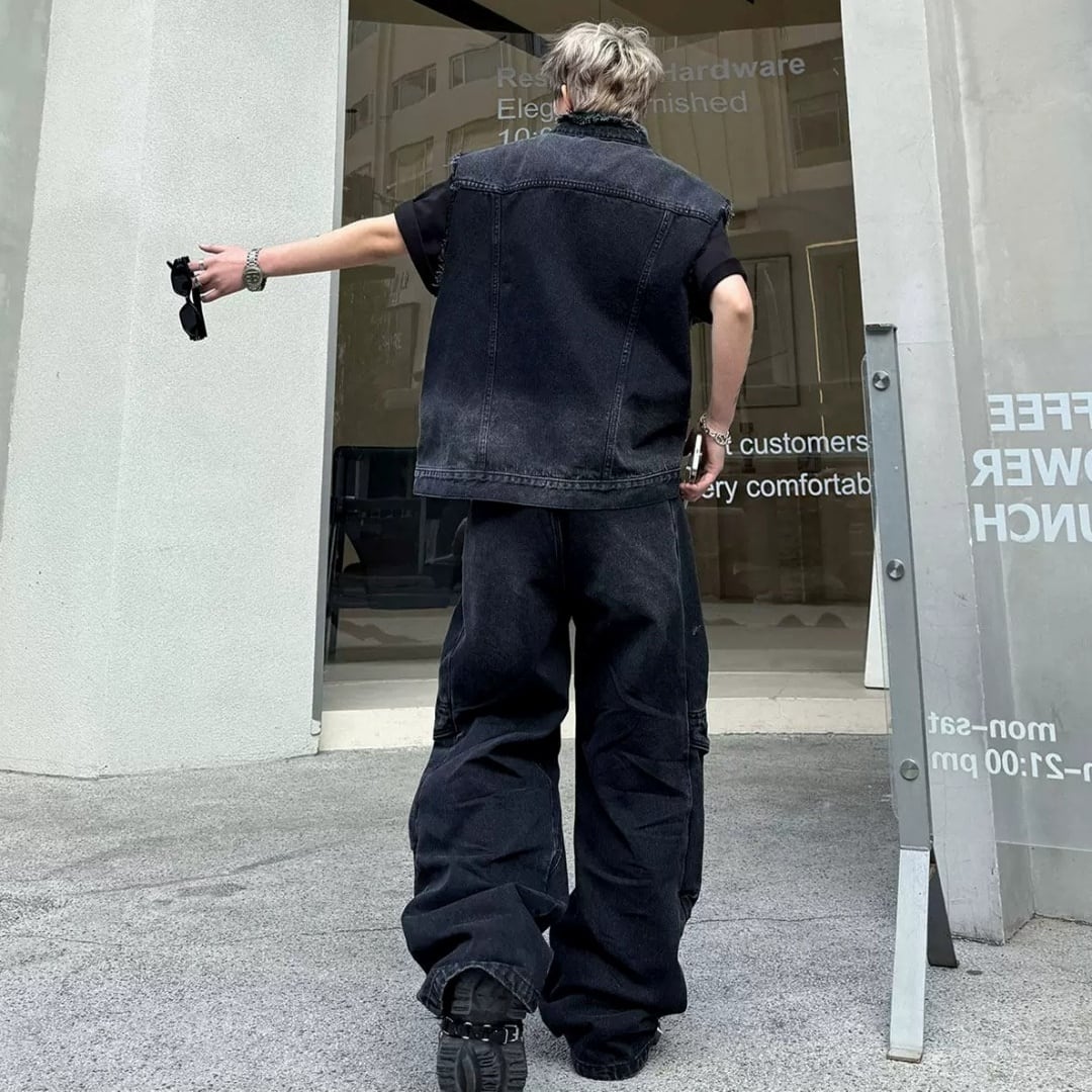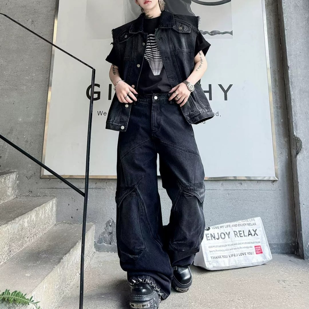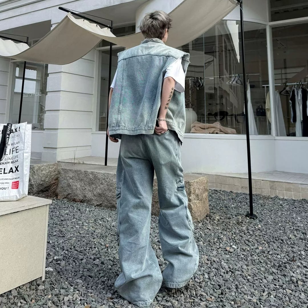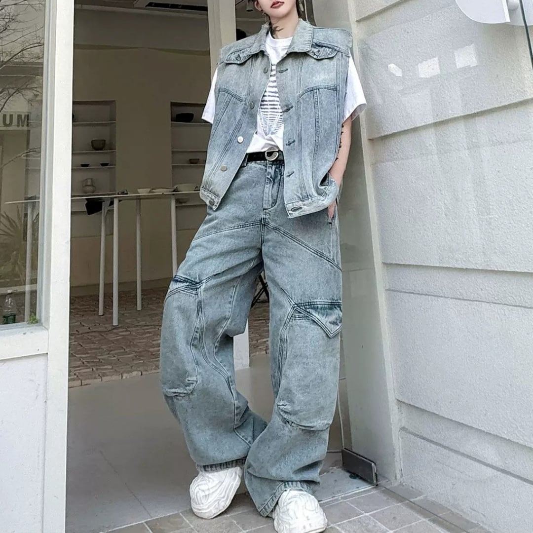 レトロウォッシュ デニムベスト&ワイドパンツセットアップ 2カラー D12313
