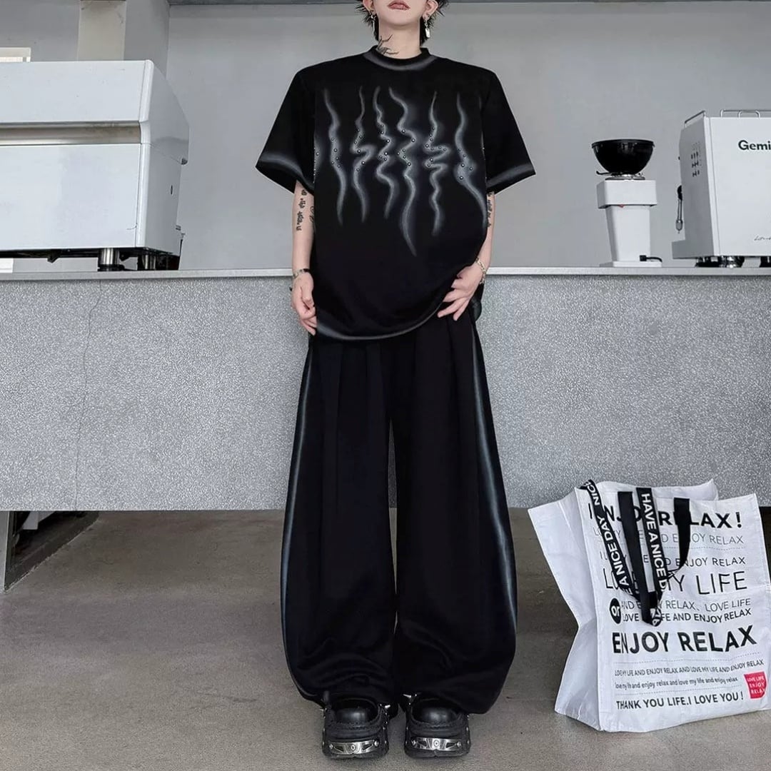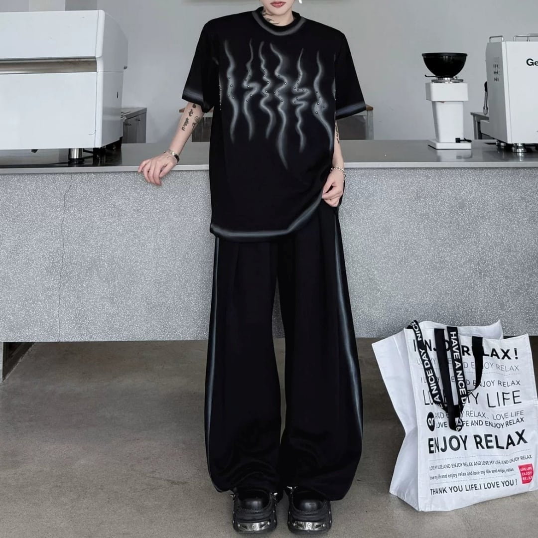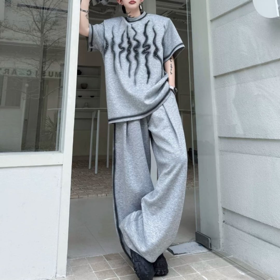 スタッズアクセント スモークプリントTシャツ&ワイドパンツセットアップ 3カラー D12318