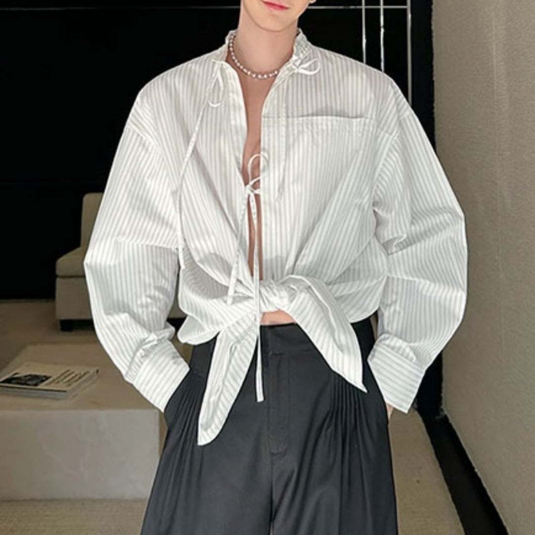 スタンドカラー ストライプリボンシャツ D10732