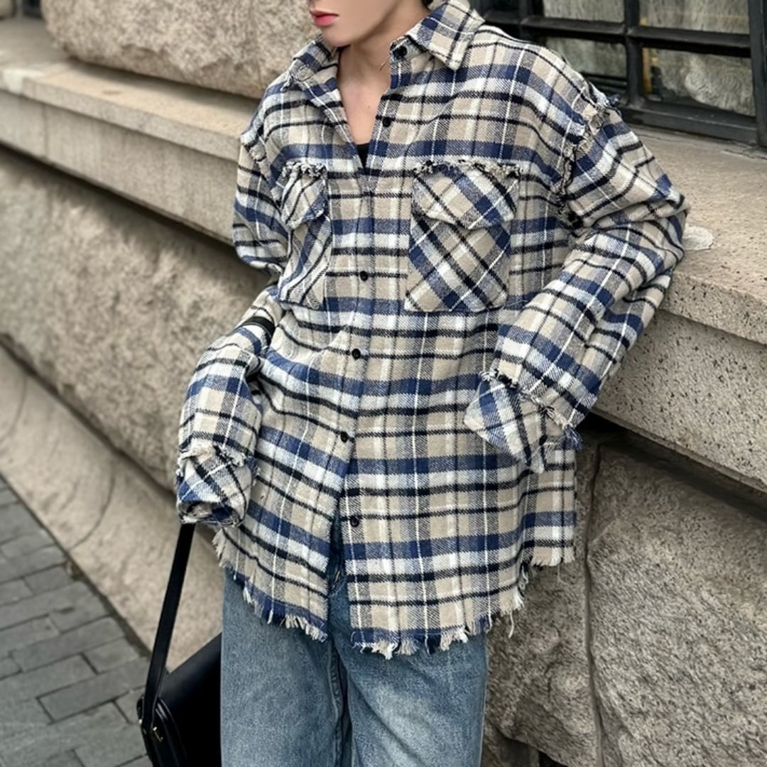 レトロチェック柄 ローエッジ長袖シャツ D10737