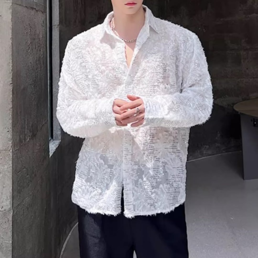 スパンコール刺繍 カジュアルシアーシャツ 2カラー D10746