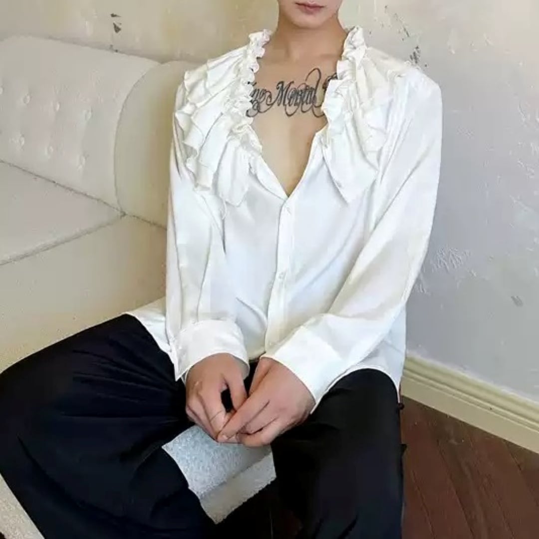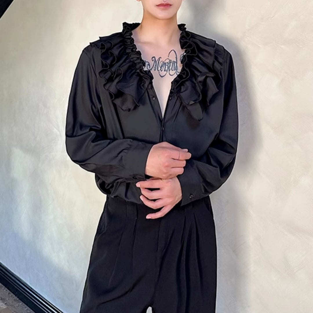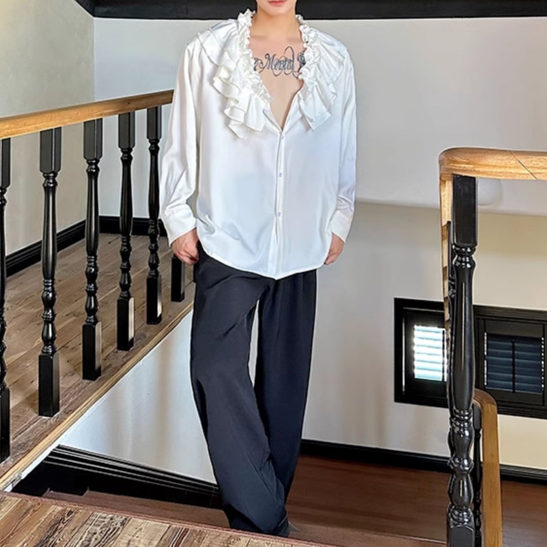フレンチフリルレース Vネック長袖ドレープシャツ 2カラー D11138