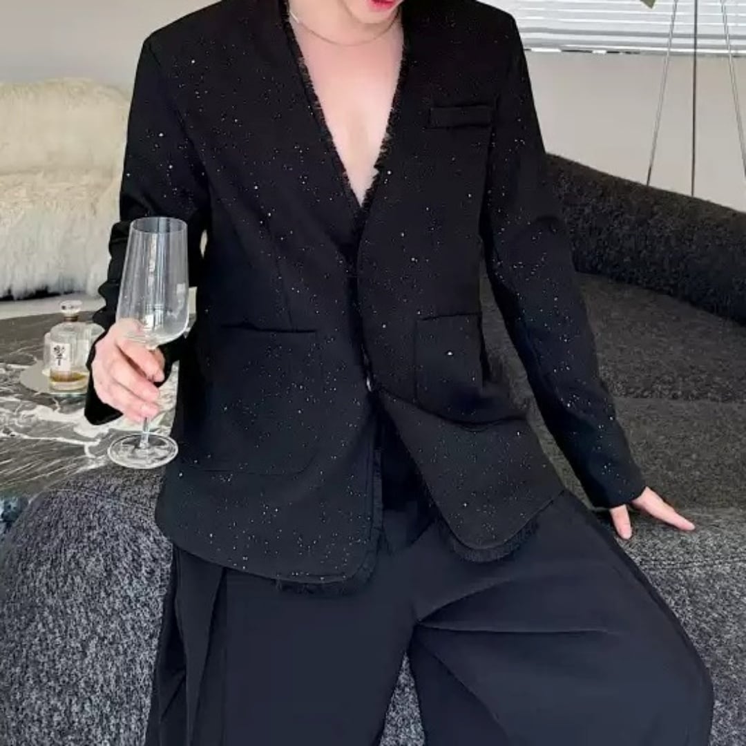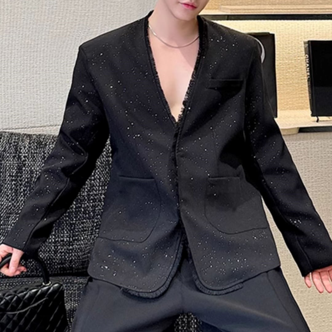 グリッター装飾 Vネックローエッジデザインジャケット D11167